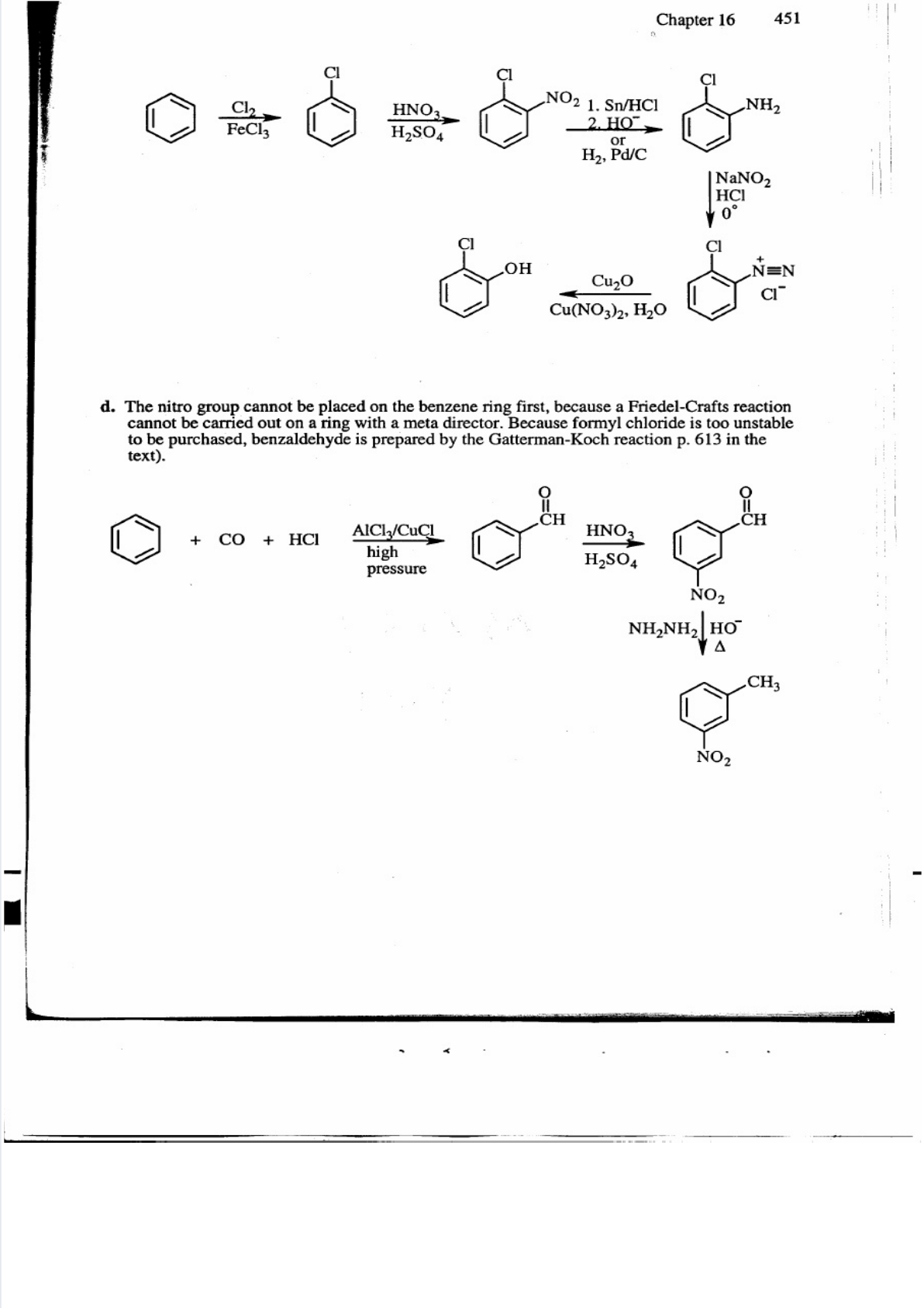 Chapter 16 451 CI NO₂ Cl₂ 1. Sn/HCl NH₂ 2. FeCl₃ H₂SO₄ or H₂, Pd/C NaNO₂ HCI 0° + OH N=N Cu₂O Cu(NO₃)₂, H₂O d. The nitro group cannot be placed on the benzene ring first, because a Friedel-Crafts reaction cannot be carried out on a ring with a meta director. Because formyl chloride is too unstable to be purchased, benzaldehyde is prepared by the Gatterman-Koch reaction p. 613 in the text). II = CH CH HNO + CO + HCI 3 high H₂SO₄ pressure NO₂ NH₂NH₂ CH₃ NO₂