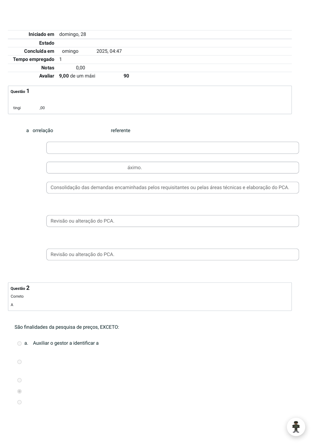 Iniciado em domingo, 28 set. 2025, 04:29 Estado Finalizada Concluída em domingo, 28 set. 2025, 04:47 Tempo empregado 17 minutos 32 segundos Notas 18,00/20,00 Avaliar 9,00 de um máximo de 10,00(90%) Questão 1 Correto Atingiu 1,00 de 1,00 Questão 2 Correto Atingiu 1,00 de 1,00 Faça a correlação entre as datas e as ações referentes ao Plano de Contratações Anual (PCA): Até 1º ABR ✓ Até 15 MAIO ✓ Até 30 ABR ✓ Quinzena posterior à publicação da Lei Orçamentária Anual ✓ De 15 SET a 15 NOV ✓ Envio das demandas pelos setores requisitantes. Aprovação do PCA pelo dirigente máximo. Consolidação das demandas encaminhadas pelos requisitantes ou pelas áreas técnicas e elaboração do PCA. Revisão ou alteração do PCA. Revisão ou alteração do PCA. São finalidades da pesquisa de preços, EXCETO: a. Auxiliar o gestor a identificar a necessidade de negociação com os fornecedores sobre os preços registrados em ata, em virtude da exigência de pesquisa periódica. b. Identificar proposta com preço inexequível ou com sobrepreço, bem como jogo de planilhas, de forma a subsidiar decisão do pregoeiro para sua desclassificação. c. Verificar a existência de recursos suficientes para cobrir as despesas decorrentes de contratação pública. d. Subsidiar a elaboração do Plano de Contratações Anual. ✓ e. Auxiliar a justificativa de preços nos casos de contratação direta. 28/09/2025, 04:48 Avaliação FINAL: Revisão da tentativa | EBAula https://avaebaula.eb.mil.br/mod/quiz/review.php?attempt=4389365&cmid=440964 1/8 Questão 3 Correto Atingiu 1,00 de 1,00 Questão 4 Correto Atingiu 1,00 de 1,00 São elementos que devem ser regulados pelo edital da licitação, EXCETO: a. Tipo de licitação b. Modelo de execução do objeto ✓ c. Modalidade de licitação d. Prazos recursais e. Forma de apresentação das propostas Segundo consta do Decreto nº 10.947, de 25 de janeiro de 2022, são objetivos do Plano de Contratações Anual (PCA), EXCETO: a. Garantir o alinhamento com o planejamento estratégico, o plano diretor de logística sustentável e outros instrumentos de governança existentes. b. Evitar o conluio nas licitações promovidas pelo órgão. ✓ c. Racionalizar as contratações das unidades administrativas de sua competência, por meio da promoção de contratações centralizadas e compartilhadas, a fim de obter economia de escala, padronização de produtos e serviços e redução de custos processuais. d. Subsidiar a elaboração das leis orçamentárias. e. Sinalizar intenções ao mercado fornecedor, de forma a aumentar o diálogo potencial com o mercado e incrementar a competitividade. 28/09/2025, 04:48 Avaliação FINAL: Revisão da tentativa | EBAula https://avaebaula.eb.mil.br/mod/quiz/review.php?attempt=4389365&cmid=440964 2/8 Questão 5 Correto Atingiu 1,00 de 1,00 Questão 6 Incorreto Atingiu 0,00 de 1,00 Questão 7 Correto Atingiu 1,00 de 1,00 Na elaboração da justificativa da contratação, elemento fundamental para identificar a real necessidade do demandante, deverá constar: motivação ✓ e objetivo ✓ da contratação, bem como seu alinhamento com o Plano de Gestão da OM. Para elaboração do Plano de Contratações Anual, o requisitante preencherá o documento de formalização de demanda ✓ no sistema de Planejamento e Gerenciamento da Contratação (PGC). Caberá à SALC, após recebidas as demandas dos setores requisitantes, realizar a construção do calendário ✓ de licitação, por grau de prioridade ✓ da demanda, considerando a data desejada. Qual tipo de contratação é utilizada para a contratação de bens e serviços para atendimento dos contingentes militares das forças singulares brasileiras empregadas em operações de paz no exterior? a. Dispensa de Licitação b. Inexigibilidade de Licitação × Para contratação de objetos caracterizados como bens e serviços para atendimento dos contingentes militares das forças singulares brasileiras empregadas em operações de paz no exterior é cabível a utilização de inexigibilidade de licitação. Verdadeiro Falso ✓ 28/09/2025, 04:48 Avaliação FINAL: Revisão da tentativa | EBAula https://avaebaula.eb.mil.br/mod/quiz/review.php?attempt=4389365&cmid=440964 3/8 Questão 8 Incorreto Atingiu 0,00 de 1,00 Questão 9 Correto Atingiu 1,00 de 1,00 Questão 10 Correto Atingiu 1,00 de 1,00 Questão 11 Correto Atingiu 1,00 de 1,00 Qual tipo de contratação é utilizada para a aquisição ou locação de imóvel cujas características de instalações e de localização tornem necessária sua escolha? a. Dispensa de Licitação × b. Inexigibilidade de Licitação A razão da escolha do contratado é um elemento que deve conter na instrução processual dos processos de contratação direta. Verdadeiro ✓ Falso O processo de contratação direta compreende os casos de dispensa de licitação e de registro cadastral. Verdadeiro Falso ✓ Na modalidade concorrência, podem ser aplicados todos os critérios de julgamento, exceto o critério maios lance. Verdadeiro ✓ Falso 28/09/2025, 04:48 Avaliação FINAL: Revisão da tentativa | EBAula https://avaebaula.eb.mil.br/mod/quiz/review.php?attempt=4389365&cmid=440964 4/8 Questão 12 Correto Atingiu 1,00 de 1,00 Questão 13 Correto Atingiu 1,00 de 1,00 Questão 14 Correto Atingiu 1,00 de 1,00 O procedimento auxiliar denominado pré-cadastramento é definido como o conjunto de procedimentos para realização, mediante contratação direta ou licitação nas modalidades pregão ou concorrência, de registro formal de preços relativos a prestação de serviços, a obras e a aquisição e locação de bens para contratações futuras. Verdadeiro Falso ✓ Assinale a alternativa correta com relação à seguinte pergunta: No sistema de registro de preços, qual prazo de vigência da ata de registro de preços: a. 8 meses b. 1 ano c. 1 ano, podendo ser prorrogado por igual período ✓ d. 10 meses e. 6 meses Indique as