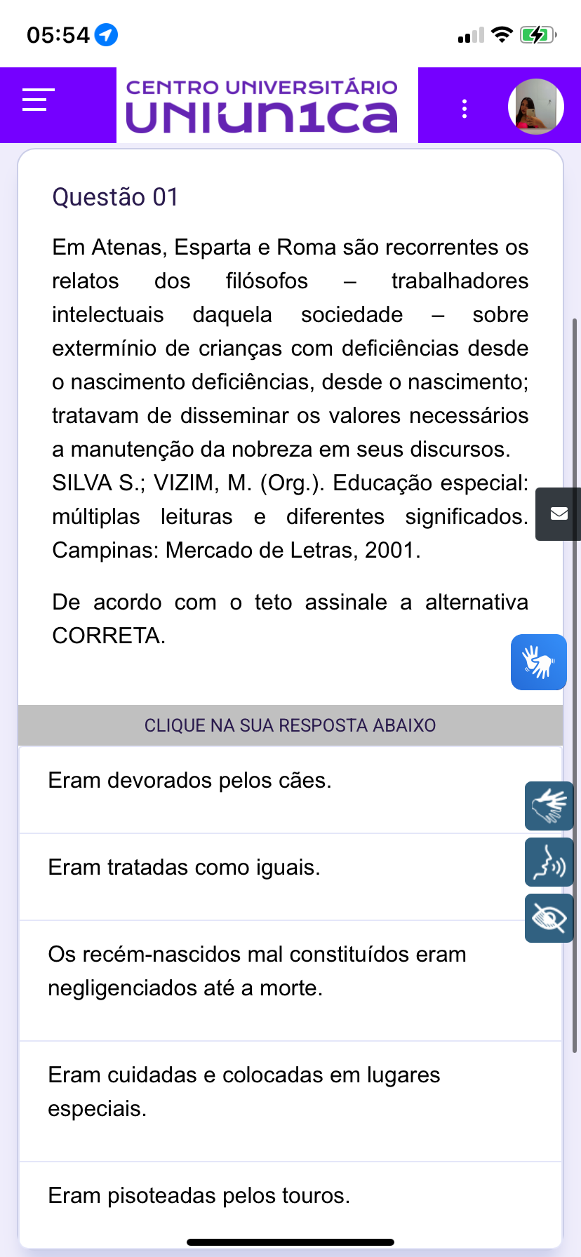 05:54 CENTRO UNIVERSITÁRIO ... Questão 01 Em Atenas, Esparta e Roma são recorrentes os relatos dos filósofos - trabalhadores intelectuais daquela sociedade - sobre extermínio de crianças com deficiências desde o nascimento deficiências, desde o nascimento; tratavam de disseminar os valores necessários a manutenção da nobreza em seus discursos. SILVA S.; VIZIM, M. (Org.). Educação especial: múltiplas leituras e diferentes significados. Campinas: Mercado de Letras, 2001. De acordo com o teto assinale a alternativa CORRETA. CLIQUE NA SUA RESPOSTA ABAIXO Eram devorados pelos cães. Eram tratadas como iguais. Os recém-nascidos mal constituídos eram negligenciados até a morte. Eram cuidadas e colocadas em lugares especiais. Eram pisoteadas pelos touros.