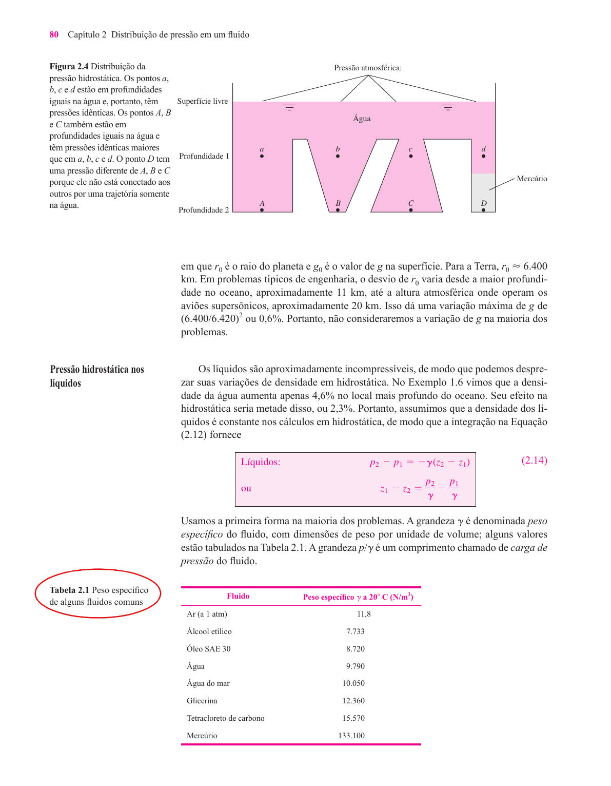 80 Capítulo 2 Distribuição de pressão em um fluido em que r0 é o raio do planeta e g0 é o valor de g na superfície. Para a Terra, r0velocidade média é a mesma em qualquer ponto: Altura de velocidade V2 2g (1,84 m/s)2 2(9,81 m/s2) 0,173 m Vent Vsai Q A Q ( /4)D2 (75 m3/h)/(3.600 s/h) ( /4)(0,12 m)2 1,84 m s Substitua esse resultado na Equação (3.69) e resolva para a perda de carga por atrito. Use pascals para a pressão e note que as alturas de velocidade se cancelam porque a área do tubo é constante. ou hp 364,7 15,2 150 199 m (24)(101.350 N/m2) 6.670 N/m3 0,173 m 0 m 101.350 N/m2 6.670 N/m3 0,173 m 150 m hp pent V2 ent 2g zent psai V2 sai 2g zsai hp Resposta A perda de carga é maior do que a diferença de elevação Dz, e a bomba tem que fazer o escoa- mento vencer ambas as cargas, de onde se explica a alta pressão na entrada. A razão entre as alturas de atrito e de velocidade é hp V2/(2g) 199 m 0,173 m 1.150 Resposta Comentários:• Essa alta razão é típica de tubulações longas. (Observe que não utilizamos diretamente a informação de que a tubulação tinha 10.000 m de comprimento, cujo efeito está implícito em hp.) No Capítulo 6, podemos enunciar esse problema de uma forma mais direta: Dada a vazão, o fluido e o tamanho do tubo, qual é a pressão necessária na entrada? Nossas correlações para hp nos levarão à estimativa de pentrada 24 atm, conforme estabele- cemos anteriormente. EXEMPLO 3.18 Ar [R 5 287 e cp 5 1.004 m2/(s2 K)] escoa em regime permanente, Figura E3.18, através de uma turbina que produz 700 hp. Para as condições de entrada e saída mostradas, estime (a) a velocidade V2 na saída e (b) o calor transferido em W. Figura E3.18 1 2 Turbomáquina We = 700 hp� D1 = 150 mm p1 = 1.034 kPa T1 = 149 �C V1 = 30,5 m/s D2 = 150 mm p2 = 276 kPa T2 = 1,7 �CQ ?� Solução As massas específicas de entrada e saída podem ser calculadas pela lei dos gases perfeitos: 2 p2 RT2 276.000 287(273 � 1,7) 1 p1 RT1 1.034.000 287(273 � 149) 8,54 kg/m3 3,50 kg/m3 O fluxo de massa é determinado pelas condições de entrada ṁ 1A1V1 (8,54) 4 2(0,15) 4,60 kg/s(30,5) Conhecendo o fluxo de massa, calculamos a velocidade de saída ou V2 74,37 m/s ṁ 4,60 2A2V2 (3,50) (0,15) 4 2V2 Resposta (a) A equação da energia para escoamento permanente, (3.65), é aplicada com Ẇ 0, z1 z2, e ĥ cpT: Ẇ 0, z1 z2, e ĥ cpT: Q̇ Ẇe ṁ 1cpT2 1 2 V2 2 cpT1 1 2 V2 12 Converta o trabalho da turbina para watts com o fator de conversão 1 hp 5 745,7 W. O trabalho da turbina Ẇe é positivo ou Q̇ 147,719 W Q̇ 700(745,7) 4,60 31.004(274,7) 1 2(74,37)2 1.004(422) 1 2(30,5)2 4 Resposta (b) O sinal negativo indica que a transferência de calor é uma perda do volume de controle. Parte (a) Parte (b) Frequentemente, o escoamento que atravessa uma seção não é estritamente unidi- mensional. Em particular, a velocidade pode variar através da seção transversal, como na Figura E3.4. Nesse caso, o termo de energia cinética da Equação (3.64), para uma dada seção, deve ser modificado por um fator adimensional de correção a, tal que a integral seja proporcional ao quadrado da velocidade média da seção para escoamento incompressívelem que Vm 1 A u dA seção 112 V2 2 1 2(V n) dA K 1 2 V2 m ṁ Fator de correção da energia cinética 3.6 A equação da energia 191 194 Capítulo 3 Relações integrais para um volume de controle (2g), em que K 7,5 é um coeficiente adimensional de perdas (ver Seção 6.7). Considere a 1,06. Encontre a potência em hp requerida para essa bomba, sendo de 80% a sua eficiência. 2 1 z1 = 0 Bomba he (negativo) Água Máquina D2 = 75 mm z2 = 6 m p2 = 68,95 kPa p1 = 101,35 kPa abs Figura E3.20 Solução Esboço do sistema:• A Figura E3.20 mostra a seleção adequada para as seções 1 e 2. Hipóteses:• Escoamento permanente, trabalho viscoso desprezível, reservatório grande (V1 0). Abordagem:• Primeiro, encontre a velocidade V2 na saída; depois, aplique a equação da ener- gia para o escoamento permanente. Passos da solução:• Encontre V2 com base na vazão conhecida e no diâmetro do tubo: V2 Q A2 0,0425 m3/s ( /4)(0,075)2 9,62 m/s2 A equação da energia para escoamento permanente (3.71), com uma bomba (sem turbina) mais z1 0 e V1 0, torna-se ou hb p2 p1 z2 ( 2 K) V2 2 2g p1 1V2 1 2g z1 p2 2V2 2 2g z2 hb h , hp K V2 2 2g 1 ( ) 1 1 2 1 1 z2 hp, h Comentário:• A bomba deve equilibrar quatro efeitos diferentes: a mudança de pressão, a mudança de elevação, a energia cinética do jato de saída e as perdas por atrito. Solução final:• Para os dados fornecidos, podemos avaliar a altura manométrica requerida para a bomba: hb (68,95 101,35) � 102 9.790 N/m3 6 m (1,07 7,5) (9,62 m/s)2 2(9,81 m/s2) 3,31 � 6 � 40,42 � 43,11 m Com a altura manométrica da bomba conhecida, a potência fornecida à bomba é calculada de forma similar ao cálculo para a turbina no Exemplo 3.19: 17.937 W 745,7 W/hp P Php ṁwe Qhp (9.970 N/m3)(0,0425 m3/s)(43,11 m) = 17.937 Wr � 24 hp Se a bomba tiver uma eficiência de 80%, então dividimos pela eficiência para encontrar a po- tência necessária para acioná-la: Prequerida P eficiência 24 hp 0,8 30 hp Resposta Comentário:• A inclusão do fator de correção da energia cinética a nesse caso fez uma dife- rença de aproximadamente 1% no resultado. A perda por atrito, não o jato de saída, foi o parâmetro predominante. Estreitamente relacionada à equação da energia para escoamento permanente, existe uma relação entre pressão, velocidade e elevação para um fluido sem atrito, co- nhecida como a equação de Bernoulli. Ela foi estabelecida em 1738 (vagamente), em palavras, em um livro-texto, por Daniel Bernoulli. Uma dedução completa da equação foi dada em 1755, por Leonhard Euler. A equação de Bernoulli é muito famosa e bas- tante usada, mas é necessário estar atento às suas restrições — todos os fluidos são viscosos e, portanto, todos os escoamentos aprese