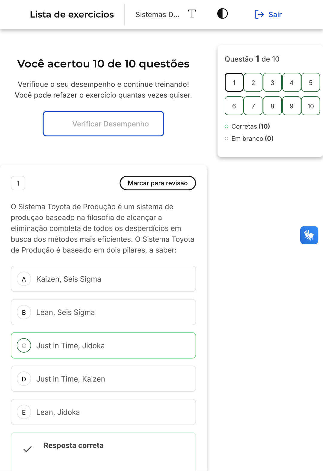 Lista de exercícios Sistemas D... T Sair Questão 1 de 10 Você acertou 10 de 10 questões Verifique seu desempenho e continue treinando! 1 2 3 4 5 Você pode refazer exercício quantas vezes quiser. 6 7 8 9 10 Verificar Desempenho Corretas (10) Em branco (0) 1 Marcar para revisão Sistema Toyota de Produção é um sistema de produção baseado na filosofia de alcançar a eliminação completa de todos os desperdícios em busca dos métodos mais eficientes. Sistema Toyota de Produção é baseado em dois pilares, a saber: A Kaizen, Seis Sigma Lean, Seis Sigma c Just in Time, Jidoka D Just in Time, Kaizen E Lean, Jidoka Resposta corretaParabéns, você selecionou a alternativa correta. Confira gabarito comentado! Gabarito Comentado Sistema Toyota de Produção (STP) fundamenta-se em dois conceitos principais: Jidoka e Just-in-Time. Jidoka, que pode ser interpretado como "automação com um toque humano", é um princípio que garante que, quando surge um problema, equipamento para imediatamente, evitando a produção de itens defeituosos. Por outro lado, conceito de Just- in-Time se refere à produção de apenas necessário para próximo processo em um fluxo contínuo, otimizando a eficiência e reduzindo desperdício. Portanto, a alternativa correta é a que menciona esses dois pilares fundamentais do Sistema Toyota de Produção. 2 Marcar para revisão Os fluxos de linha são caracterizados por altos custos fixos e baixos custos variáveis e são frequentemente vistos como os mais eficientes dos tipos de processos. A habilidade do trabalho, especialmente nas operações da linha de montagem, é geralmente muito baixa, pois os trabalhadores precisam aprender apenas algumas operações simples. Os fluxos de linha são usados apenas para os maiores volumes de produtos, são muito focados e, consequentemente, são os mais inflexíveis dos processos. Qual dos seguintes é geralmente considerado uma característica de um processo de linha?Os clientes compram as capacidades da A organização. trabalho não é fixo, mas se move através B de uma sequência de operações. produto ou serviço será feito para um c pedido específico do cliente. D Produtos ou serviços são únicos. trabalho é normalmente controlado por um E operador que move trabalho para os processos. Resposta correta Parabéns, você selecionou a alternativa correta. Confira gabarito comentado! Gabarito Comentado Uma linha de produção, também chamada de linha de montagem ou linha de fábrica, refere-se ao caminho organizado de montagem de um produto. Na maioria dos casos, a linha de produção se concentra em uma correia transportadora ou outro sistema mecânico que move fisicamente produto de uma estação para a próxima, e é um equívoco comum chamar esse transportador de linha de produção. Em cada estação do processo de produção, um operário ou máquina adiciona uma peça ao produto acabado, realiza uma verificação de controle de qualidade ou algum outro trabalho essencial para a conclusão do projeto. trabalho não é fixo, mas se move através de uma sequência deoperações, é uma característica de um processo de linha. 3 Marcar para revisão A classificação de qualquer sistema de produção depende de muitos fatores. Qual das seguintes afirmações geralmente seria considerada correta? processamento em lote produz uma gama A de produtos mais padronizada do que os processos de fluxo contínuo. Os processos por Job shops podem produzir B uma gama maior de produtos do que os sistemas de projeto. Os processos por Job shops normalmente c competem oferecendo um preço mais baixo do que seus concorrentes. Os custos de mão de obra são mais altos em D uma operação de job shop do que na maioria dos outros processos. Os ciclos de produção são mais curtos para E sistemas de fluxo contínuo do que para sistemas de produção em massa. Resposta correta Parabéns, você selecionou a alternativa correta. Confira o gabarito comentado! Gabarito Comentadoprocesso Job shop é caracterizado por uma planta que possui ferramentas, máquinas e instalações com funções ou desempenhos similares. As estações de trabalho separadas realizam diferentes tarefas durante processo de fabricação de um produto. Os produtos finais são produzidos em pequenos lotes, com quantidades variadas, e os clientes personalizam seus pedidos para atender às suas necessidades específicas. Isso implica que uma empresa produzirá um pequeno volume de produtos que não são padronizados. No entanto, essa personalização e produção em pequena escala resultam em custos mais elevados, especialmente em termos de mão de obra, quando comparados à maioria dos outros processos de produção. Portanto, a alternativa correta é: Os custos de mão de obra são mais altos em uma operação de job shop do que na maioria dos outros processos. 4 Marcar para revisão Uma análise de localização foi reduzida a dois locais: Akron e Boston. Os principais atores da decisão serão fornecimento de matéria-prima com peso de 0,50, custos de transporte com peso de 0,40 e custos de mão de obra com peso de 0,10. As pontuações para matérias-primas, transporte e mão de obra são para Akron 60, 80 e 70 respectivamente e para Boston 70, 50 e 90 respectivamente. Dadas essas informações e uma pontuação composta mínima aceitável de 75, podemos dizer que gestor deveA ser indiferente entre esses locais escolha Akron c escolha Boston D rejeitar ambos os locais E construir uma fábrica em ambas as cidades Resposta correta Parabéns, você selecionou a alternativa correta. Confira gabarito comentado! Gabarito Comentado A análise de localização é uma ferramenta que auxilia na tomada de decisão sobre a localização de uma empresa. Ela considera diversos fatores, como custos de transporte, mão de obra, impostos, entre outros. No caso da questão, os fatores considerados são fornecimento de matéria-prima, custos de transporte e custos de mão de ob