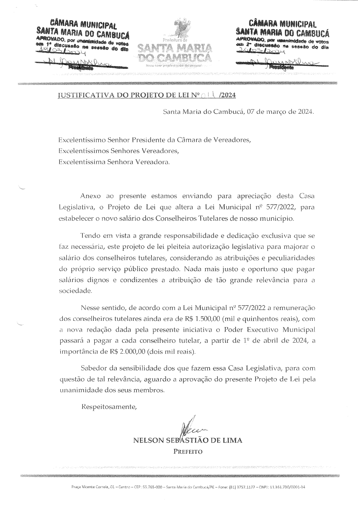CÂMARA MUNICIPAL CÂMARA MUNICIPAL SANTA MARIA DO CAMBUCÁ SANTA MARIA DO CAMBUCÁ APROVADO. por unanimidade de votos Prefeitura de APROVADO, de votos discussão sessão do dia SANTA MARIA discussão sessão do dia DO CAMBUCA projeto das Presidente JUSTIFICATIVA DO PROJETO DE LEI /2024 Santa Maria do Cambucá, 07 de março de 2024. Excelentíssimo Senhor Presidente da Câmara de Vereadores, Excelentíssimos Senhores Vereadores, Excelentíssima Senhora Vereadora. Anexo ao presente estamos enviando para apreciação desta Casa Legislativa, Projeto de Lei que altera a Lei Municipal 577/2022, para estabelecer novo salário dos Conselheiros Tutelares de nosso município. Tendo em vista a grande responsabilidade e dedicação exclusiva que se faz necessária, este projeto de lei pleiteia autorização legislativa para majorar salário dos conselheiros tutelares, considerando as atribuições e peculiaridades do próprio serviço público prestado. Nada mais justo e oportuno que pagar salários dignos e condizentes a atribuição de tão grande relevância para a sociedade. Nesse sentido, de acordo com a Lei Municipal 577/2022 a remuneração dos conselheiros tutelares ainda era de 1.500,00 (mil e quinhentos reais), com a nova redação dada pela presente iniciativa Poder Executivo Municipal passará a pagar a cada conselheiro tutelar, a partir de de abril de 2024, a importância de 2.000,00 (dois mil reais). Sabedor da sensibilidade dos que fazem essa Casa Legislativa, para com questão de tal relevância, aguardo a aprovação do presente Projeto de Lei pela unanimidade dos seus membros. Respeitosamente, NELSON SEBASTIÃO DE LIMA PREFEITO Praça Vicente Correia, 01 Centro CEP: 55.765-000 Santa Maria do Fone: (81) 3757.1177 CNPJ: 11.361.730/0001-34CÂMARA MUNICIPAL CAMARA MUNICIPAL SANTA MARIA DO CAMBUCÁ SANTA MARIA DO CAMBUCÁ Prefeitura de por de votos APROVADO, por de votos em discussão na sessão do SANTA MARIA discussão na sessão do dia DO CAMBUCA Nosso cuidar das Presidente Presidente PROJETO DE LEI 011 /2024 ALTERA A LEI MUNICIPAL 577/2022, FIXANDO NOVA REMUNERAÇÃO AOS CONSELHEIROS TUTELARES DO MUNICÍPIO DE SANTA MARIA DO CAMBUCÁ E DÁ OUTRAS PROVIDÊNCIAS. O PREFEITO DO MUNICÍPIO DE SANTA MARIA DO CAMBUCÁ, no uso das atribuições que lhes são conferidas pela Constituição Federal, pela Constituição do Estado de Pernambuco e pela Lei Orgânica Municipal, submete à apreciação da Câmara Municipal seguinte PROJETO DE LEI: ART. O artigo 18 da Lei Municipal 478/2014, passa a vigorar com a seguinte redação: "Art. 18. A partir de de abril de 2024 a remuneração mensal do Conselheiro Tutelar do Município de Santa Maria do Cambucá-PE, passará a ser de R$ 2.000,00 (dois mil reais)". ART. 2° A despesa decorrente desta Lei correrá por conta das dotações orçamentárias existentes na Lei Orçamentária vigente. ART. Esta Lei entra em vigor na data de sua publicação. Santa Maria do Cambucá/PE, 07 de março de 2024. NELSON SEBASTIÃO DE LIMA PREFEITO Praça Vicente Correia, 01 Centro CEP: - Santa Maria do Fone: CNPJ: 11.361.730/0001-34