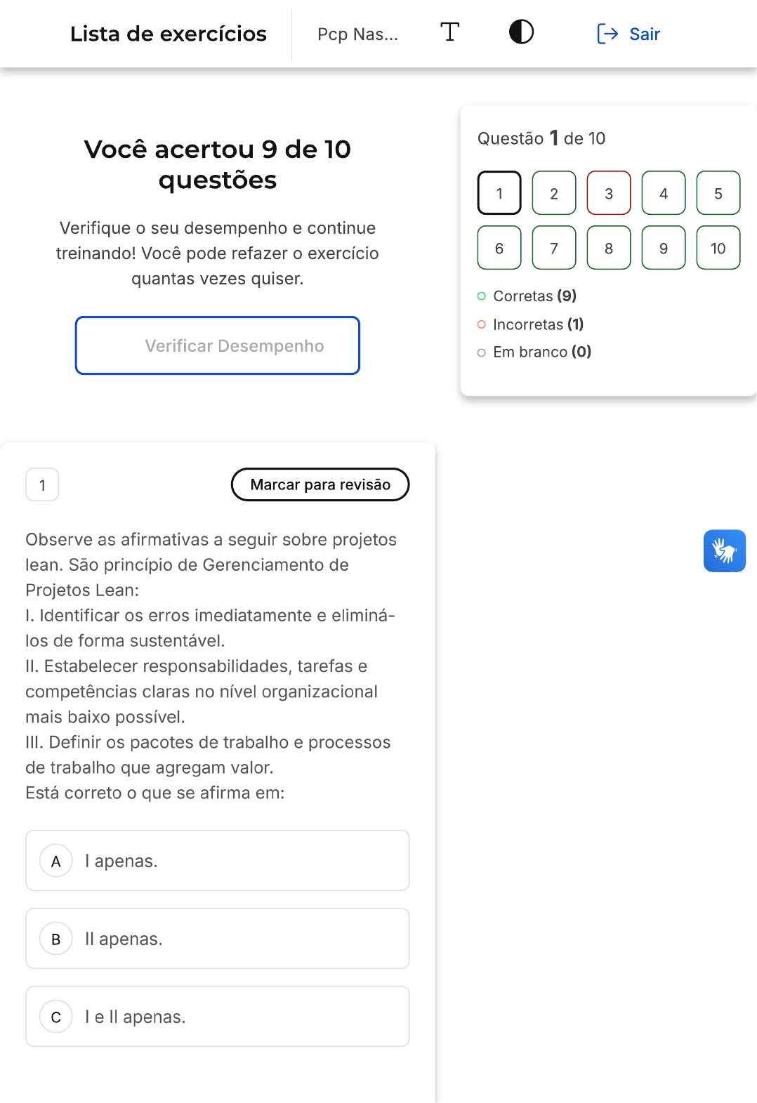 Lista de exercícios Pcp Nas... T Sair Questão 1 de 10 Você acertou 9 de 10 questões 1 2 3 4 5 Verifique seu desempenho e continue treinando! Você pode refazer exercício 6 7 8 9 10 quantas vezes quiser. Corretas (9) Incorretas (1) Verificar Desempenho Em branco 1 Marcar para revisão Observe as afirmativas a seguir sobre projetos lean. São princípio de Gerenciamento de Projetos Lean: I. Identificar os erros imediatamente e eliminá- los de forma sustentável. II. Estabelecer responsabilidades, tarefas e competências claras no nível organizacional mais baixo possível. III. Definir os pacotes de trabalho e processos de trabalho que agregam valor. Está correto que se afirma em: A I apenas. apenas. c I e apenas.D I e III apenas. E I, e III. Resposta correta Parabéns, você selecionou a alternativa correta. Confira o gabarito comentado! Gabarito Comentado pensamento enxuto tem sido aplicado com muito sucesso em muitas indústrias e organizações prestadoras de serviços. Os conceitos Lean podem ser aplicados a qualquer esforço recorrente no trabalho, em casa ou no lazer. A indústria da construção reconhece que precisa de muitas melhorias para acompanhar a complexidade cada vez maior do ambiente construído e progredir em direção aos mesmos ganhos de eficiência alcançados por outros setores de negócios. 2 Marcar para revisão Observe os dados a seguir referentes a um projeto.Duração Atividades Predecessoras (semanas) A 7 B 2 A C 3 B; E D 5 E 6 D F 1 D G 4 F H 2 C;G I 2 F J 3 H; I Assinale a alternativa que indica caminho crítico. A 19 semanas. 16 semanas. c 14 semanas. D 21 semanas. E 18 semanas. Resposta correta Parabéns, você selecionou a alternativa correta. Confira gabarito comentado! Gabarito Comentado Montando a rede:0 7 7 7 2 9 11 3 14 14 2 16 16 3 19 A B C H 2 2 9 9 2 11 11 0 14 14 0 16 16 0 19 0 5 5 5 6 11 6 4 10 D E G 0 0 5 5 0 11 12 6 16 5 1 6 6 2 8 F 9 4 10 14 8 16 3 Marcar para revisão Seu projeto tem a tarefa de escavação de 1.000.000 metros cúbicos de solo. De acordo com plano de gerenciamento do projeto, você precisa escavar 60.000 metros cúbicos de solo por semana a um custo de $5 por metro cúbico. De acordo com relatório de progresso do primeiro mês, EV do projeto foi de 1.000.000 e AC foi de 1.200.000. Já de acordo com relatório de progresso do segundo mês, EV do projeto foi de 2.200.000 e foi de 4.400.000. Após 3° mês (12 semanas), você tem 250.000 metros cúbicos de solo restantes para serem escavados e seu custo total até momento é de 4.000.000. SPI (Schedule Performance Index) do projeto será. A 1,04. B 0,94.c 1,18. D 1,87. E 0,87. X Resposta incorreta A alternativa correta é a letra Confira gabarito comentado! Gabarito Comentado SPI é calculado como valor agregado (EV) dividido pelo valor planejado (PV). valor planejado é valor que projeto deveria ter alcançado no momento atual. valor agregado é valor que projeto realmente alcançou no momento atual. Neste caso, valor planejado é de 3.600.000,00 (12 semanas / 16,6667 semanas * 5.000.000,00). valor agregado é de 3.750.000,00 (75% * 5.000.000,00). Portanto, SPI é de 1,04 (3.750.000,00 / 3.600.000,00). 4 Marcar para revisão Para a construção de um galpão para armazenagem de produtos agrícolas, foi elaborado seguinte cronograma da obra:Cronograma financeiro da obra Meses Serviços Custo 1 2 3 4 5 6 Terraplanagem 100% 1.800 Fundações 100% 7.600 Estrutura metálica 15% 85% 14.200 Cobertura 30% 70% 13.200 Piso 50% 50% 4.500 Pintura 30% 70% 2.800 Limpeza 100% 700 No final do terceiro mês engenheiro civil responsável pelo acompanhamento da obra resolveu verificar seu andamento. O percentual de serviços executados acumulados é: A c D E Resposta correta Parabéns, você selecionou a alternativa correta. Confira o gabarito comentado! Gabarito ComentadoCronograma financeiro da obra Meses Serviços Custo Realizado 1 2 3 4 5 6 Terraplanagem 100% 1.800 1.800 Fundações 100% 7.600 7.600 Estrutura metálica 15% 85% 14.200 14.200 Cobertura 30% 70% 13.200 3.960 Piso 50% 50% 4.500 Pintura 30% 70% 2.800 Limpeza 100% 700 Total 44.800 27.560 Realizado 61,52% 5 Marcar para revisão Você está gerenciando um projeto de construção. Você completou metade do trabalho do projeto. custo total planejado nesta fase é de $ 1.000. trabalho real que foi concluído nesta fase vale $ 1200. Você já gastou $ 1500 no projeto. Qual é CPI? A 0,5. B 0,8. c 4. D 1,25. E 0,9.Resposta correta Parabéns, você selecionou a alternativa correta. Confira gabarito comentado! Gabarito Comentado CPI = EV/AC = 1200/ 1500 = 0,8. 6 Marcar para revisão Uma atividade que agrega valor é qualquer ação tomada que aumente benefício de um bem ou serviço para um cliente. Uma empresa pode aumentar enormemente sua lucratividade reconhecendo quais atividades aumentam valor e quais não, e eliminando as atividades que não agregam valor. Na maioria das organizações, há uma proporção muito menor de atividades de valor agregado do que de atividades sem valor agregado. Portanto com base a este conceito, que é uma atividade de valor agregado (VA)? Trabalho que é solicitado pela equipe A de aplicação. Trabalho que deixará a equipe de gestão orgulhosa. Trabalho que cliente está disposto a c pagar.Trabalho que deve ser concluído D imediatamente. Trabalho que a equipe está disposta a E executar. Resposta correta Parabéns, você selecionou a alternativa correta. Confira gabarito comentado! Gabarito Comentado Uma atividade de valor agregado (VA) é uma atividade que cliente está disposto a pagar. Isso significa que a atividade agrega valor ao produto ou serviço para cliente. 7 Marcar para revisão Observe as afirmativas a seguir: I. A construção enxuta pode ser definida como maximizar valor e minimizar desperdício. II. Os maiores desafios enfrentados pela indústria da construção como um todo são a escassez de mão de obra qualificada e materiais de construção. III. Não há distinção entre e