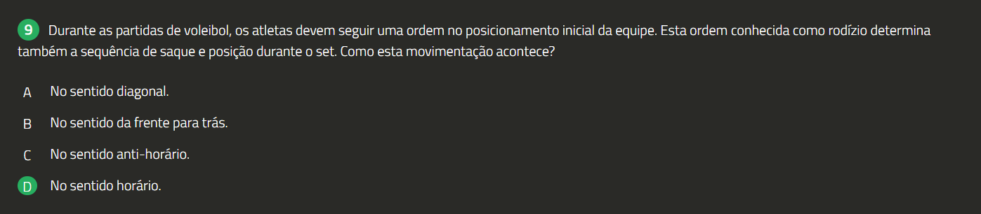 9 Durante as partidas de voleibol, atletas devem seguir uma ordem no posicionamento inicial da equipe. Esta ordem conhecida como rodízio determina também a sequência de saque e posição durante 0 set. Como esta movimentação acontece? A No sentido diagonal. B No sentido da frente para trás. No sentido anti-horário. D No sentido horário.