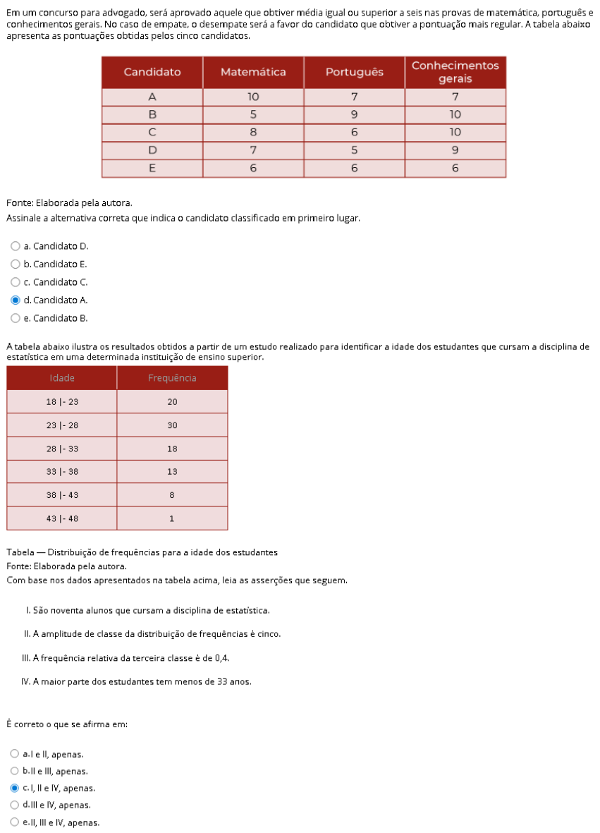 Em um concurso para advogado, será aprovado aquele que obtiver média igual ou superior a seis nas provas de matemática, português e conhecimentos gerais. No caso de empate, 0 desempate será a favor do candidato que obtiver a pontuação mais regular. A tabela abaixo apresenta as pontuações obtidas pelos cinco candidatos. Conhecimentos Candidato Matemática Português gerais A 10 7 7 5 9 10 8 6 10 D 7 5 9 E 6 6 6 Fonte: Elaborada pela autora. Assinale a alternativa correta que indica candidato classificado em primeiro lugar. a. Candidato D. b. Candidato E. C. Candidato C. d. Candidato A. e. Candidato B. A tabela abaixo ilustra 05 resultados obtidos a partir de um estudo realizado para identificar a idade dos estudantes que cursam a disciplina de estatística em uma determinada instituição de ensino superior. Idade Frequência 18 23 20 23 28 30 28 33 18 33 38 13 38 43 8 43 48 1 Tabela Distribuição de frequências para a idade dos estudantes Fonte: Elaborada pela autora. Com base nos dados apresentados па tabela acima, leia as asserções que seguem. I. São noventa alunos que cursam a disciplina de II. A amplitude de classe da distribuição de frequências è cinco. III. A frequência relativa da terceira classe è de 0,4. IV. A maior parte dos estudantes tem menos de 33 anos. correto que se afirma em: e II, apenas. b.ll e III, apenas. e IV, apenas. e IV, apenas. e.ll, III e IV, apenas.João Vitor trabalha em uma empresa de produção de bebidas e deseja verificar se 0 volume médio de uma garrafa de um determinado produto está dentro das especificações de qualidade. Para isso, ele coletou uma amostra aleatória de 10 garrafas do produto, obtendo seguintes volumes (em mililitros): 500 495 502 499 497 501 498 500 496 503. É sabido que volume médio ideal do referido produto é de 500 mL e que 0 desvio padrão amostral aceitável é de 2 A respeito dessa situação, identifique se são verdadeiras (V) ou falsas (F) as afirmativas a seguir. volume médio da amostra coletada é de 499,1 mL. II. O desvio padrão da amostra coletada é de 2,35 mL. III. volume médio da amostra está abaixo do volume ideal. IV. desvio padrão da amostra está acima do ideal. Assinale a alternativa que apresenta a sequência correta. Uma pesquisa buscou fazer um levantamento dos salários dos cinquenta funcionários de uma empresa. Os resultados obtidos no estudo encontram-se ilustrados na distribuição de frequências abaixo. Frequência Salário (R$) Frequência Frequência relativa acumulada 1000 2000 4 0,100 0,100 2000 3000 8 0,200 0,300 3000 4000 12 0,300 0,600 4000 5000 9 0,225 0,825 5000 6000 5 0,125 0,950 6000 7000 2 0,050 1 Tabela Distribuição de frequências para OS salários Fonte: Elaborada pela autora. Em relação à tabela apresentada, é correto que se afirma em: a. 12 pessoas ganham de R$ 1.000,00 a b.5 pessoas ganham entre R$6.000,00 a C. 30% das pessoas ganham entre a d. das pessoas ganham entre a e. 8 pessoas ganham de aUma pesquisa buscou identificar de colesterol (em mg/100 ml) medido no sangue de oitenta pacientes. Os resultados obtidos no estudo encontram-se ilustrados na distribuição de frequências abaixo. Colesterol Frequência Frequência (mg/100 ml) Frequência relativa acumulada 150 170 21 0,2625 0,2625 170 190 24 0,3000 0,5625 190 210 17 0,2125 0,7750 210 230 15 0,1875 0,9625 230 250 3 0,0375 1 Tabela Distribuição de frequências para OS dados de colesterol Fonte: Elaborada pela autora. A respeito dos dados apresentados na tabela, é correto que se afirma em: a. 3,75%% das pessoas entrevistadas têm colesterol entre 210 e 230 mg/100 ml. b. .30% das pessoas entrevistadas têm colesterol entre 150 e 170 mg/100 ml. C. 17 pessoas entrevistadas têm colesterol maior ou igual a 190 e menor que 210 mg/100 ml. d. 18,75% das pessoas entrevistadas têm colesterol entre 170 e 190 mg/100 ml. e. 3 pessoas entrevistadas têm colesterol maior ou igual a 210 e menor que 230 mg/100 ml. Na sequência, encontramos dados referentes a vinte observações relativas ao índice pluviométrico (mm) em uma determinada cidade, observe: 120 144 160 152 130 119 160 143 159 156 145 123 126 100 132 136 147 145 159 Fonte: Elaborada pela autora. Assinale a alternativa correta que contempla a mediana do índice pluviométrico da cidade. a. 145 mm. b. 143,5 mm. C. 142 mm. d. .150,5 mm. e. 153,5 mm.Ana Maria é investidora na bolsa de valores e tem como meta um preço médio de R$ 15,00 na ação AABB4 no ano. Observando os preços de compra da referida ação nos meses de janeiro a novembro, qual deverá ser 0 preço a se pagar na AABB4 no mês de dezembro para que a média seja 15? Jan. Fev. Mar. Abr. Mai. Jun. Jul. Ago. Set. Out. Nov. Dez. 12,60 13,80 15,40 12,80 12,80 13,50 16,80 17,10 18,40 15,70 16,30 ? Fonte: Elaborada pela autora. Assinale a alternativa correta. a. R$ b. R$ 15,00. C. R$ 14,80. d. R$ 14,70. e. R$ 14,20. Realizou-se um estudo experimental para verificar a capacidade das pessoas perderem peso quando submetidas a dieta e exercícios físicos regulares por um período de dois meses. A tabela abaixo ilustra resultados obtidos para cinco participantes. Segunda Participante Peso inicial (kg) Média pesagem (kg) Peso final (kg) Desvio padrão A 80 77 71 75 74 72 81 78 77 D 90 87 82 E 77 75 76 Fonte: Elaborada pela autora. A partir dos dados expostos, leia as asserções que seguem. 1.0 peso médio do candidato C foi de 74 kg. II. O candidato com maior desvio padrão amostral foi candidato D. III. candidato A foi que perdeu mais peso no experimento. IV. O candidato mais homogêneo nas pesagens foi É correto o que se afirma em: III e IV, apenas. e IV, apenas. C. IV, apenas. d.ll e IV, apenas. e III, apenas.