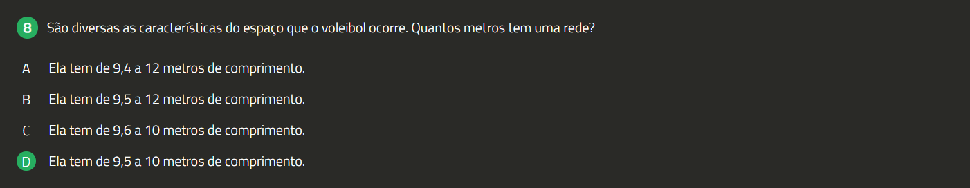 8 São diversas as características do espaço que 0 voleibol ocorre. Quantos metros tem uma rede? A Ela tem de 9,4 a 12 metros de comprimento. Ela tem de 9,5 a 12 metros de comprimento. Ela tem de 9,6 a 10 metros de comprimento. D Ela tem de 9,5 a 10 metros de comprimento.