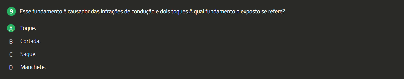 9 Esse fundamento é causador das infrações de condução e dois toques.A qual fundamento 0 exposto se refere? A Toque. B Cortada. Saque. D Manchete.