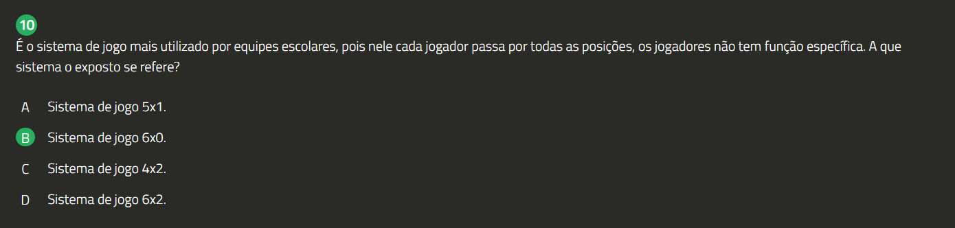 10 É 0 sistema de jogo mais utilizado por equipes escolares, pois nele cada jogador passa por todas as posições, jogadores não tem função específica. A que sistema 0 exposto se refere? A Sistema de jogo 5x1. Sistema de jogo 6x0. Sistema de jogo 4x2. D Sistema de jogo 6x2.