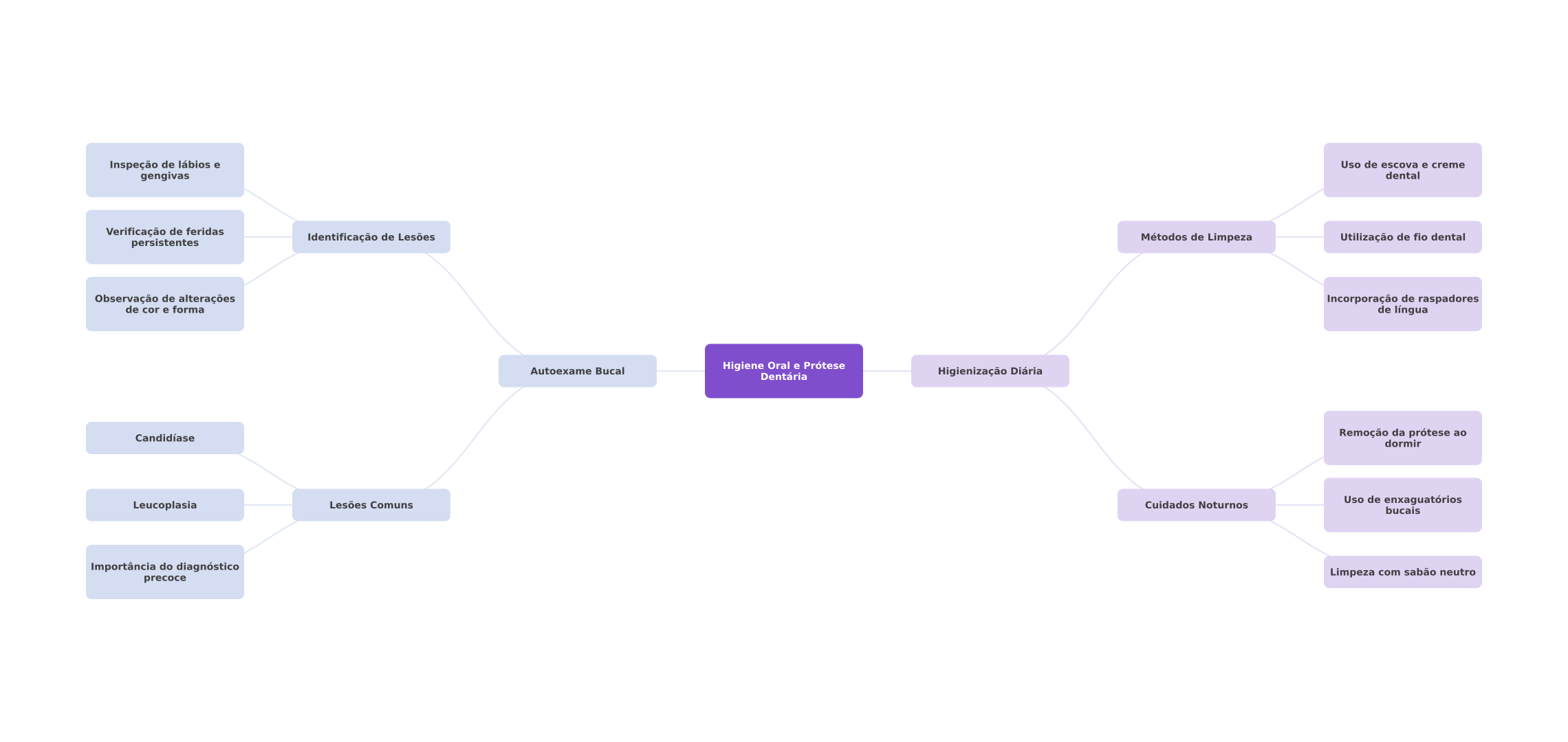 Inspeção de lábios e Uso de escova e creme gengivas dental Verificação de feridas Identificação de Lesões persistentes Métodos de Limpeza Utilização de fio dental Observação de alterações Incorporação de raspadores de cor e forma de língua Autoexame Bucal Higiene Oral e Prótese Higienização Diária Dentária Candidíase Remoção da prótese ao dormir Leucoplasia Lesões Comuns Cuidados Noturnos Uso de enxaguatórios bucais Importância do diagnóstico Limpeza com sabão neutro precoce