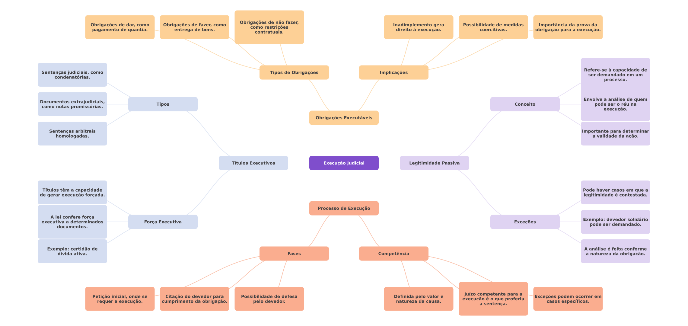 Obrigações de dar, como Obrigações de fazer, como Obrigações de não fazer, como restrições Inadimplemento gera Possibilidade de medidas Importância da prova da pagamento de quantia. entrega de bens. contratuais. direito à execução. coercitivas. obrigação para a execução. Refere-se à capacidade de Sentenças judiciais, como Tipos de Obrigações Implicações ser demandado em um condenatórias. processo. Documentos extrajudiciais, Envolve a análise de quem Tipos Conceito pode ser réu na como notas promissórias. execução. Obrigações Executáveis Sentenças arbitrais Importante para determinar homologadas. a validade da ação. Títulos Executivos Execução Judicial Legitimidade Passiva Títulos têm a capacidade Pode haver casos em que a de gerar execução forçada. legitimidade é contestada. Processo de Execução A lei confere força executiva a determinados Exemplo: devedor solidário Força Executiva Exceções documentos. pode ser demandado. Exemplo: certidão de A análise é feita conforme dívida ativa. Fases Competência a natureza da obrigação. Petição inicial, onde se Citação do devedor para Possibilidade de defesa Definida pelo valor e Juízo competente para a pelo devedor. natureza da causa. execução é que proferiu Exceções podem ocorrer em requer a execução. cumprimento da obrigação. a sentença. casos específicos.