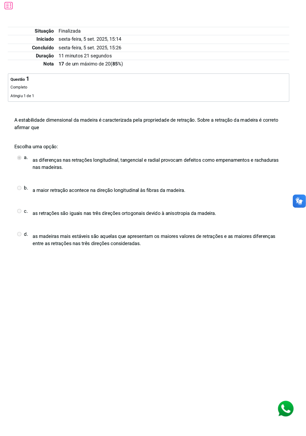 Situação Finalizada Iniciado sexta-feira, 5 set. 2025, 15:14 Concluído sexta-feira, 5 set. 2025, 15:26 Duração 11 minutos 21 segundos Nota 17 de um máximo de 20(85%) Questão 1 Completo Atingiu 1 de 1 A estabilidade dimensional da madeira é caracterizada pela propriedade de retração. Sobre a retração da madeira é correto afirmar que Escolha uma opção: a. as diferenças nas retrações longitudinal, tangencial e radial provocam defeitos como empenamentos e rachaduras nas madeiras. b. a maior retração acontece na direção longitudinal às fibras da madeira. c. as retrações são iguais nas três direções ortogonais devido à anisotropia da madeira. d. as madeiras mais estáveis são aquelas que apresentam os maiores valores de retrações e as maiores diferenças entre as retrações nas três direções consideradas. Questão 2 Completo Atingiu 1 de 1 Questão 3 Completo Atingiu 1 de 1 De acordo com as propriedades mecânicas da madeira, transversais complete corretamente as lacunas: ____________: esforço de compressão no sentido normal às fibras, após a fase das deformações elásticas, a madeira pode sofrer esmagamento. ____________: tende a torcer um corpo em torno de um eixo. ____________:: esforço de tração aplicado na extremidade de uma peça a fim de descolar as fibras. Escolha uma opção: a. compressão, torção e fendilhamento b. resiliência, tração, cisalhamento c. compressão, resiliência e cisalhamento d. tração, compressão e fadiga Qual o material que diferencia uma pasta de uma argamassa? Escolha uma opção: a. areia b. brita zero c. cimento d. sílica Questão 4 Completo Atingiu 0 de 1 Questão 5 Completo Atingiu 1 de 1 A desforma de concreto é uma etapa posterior à cura do concreto, envolvendo a desmontagem e a limpeza de todas as formas, bem como os equipamentos que dão sustentação à estrutura. Quando os cimentos utilizados não são de alta resistência inicial e não tiverem sido aplicados aditivos para acelerar o endurecimento, os prazos mínimos precisam seguir alguns critérios mínimos no plano de desforma. Qual o prazo para retirada das escoras? Escolha uma opção: a. 5 dias b. 7 dias c. 3 dias d. 21 dias Em relação às áreas de vivências em canteiros de obras, analise as assertivas abaixo, assinalando V, se verdadeiras, ou F, se falsas. ( ) O vestiário deve estar o mais próximo possível da entrada da obra e das instalações sanitárias, com o seu acesso protegido das intempéries. ( ) É proibido cozinhar e aquecer qualquer tipo de refeição dentro do alojamento, bem como guardar alimentos perecíveis. ( ) As instalações sanitárias devem ser construídas na ocasião da instalação do próprio canteiro de obras. A ordem correta de preenchimento dos parênteses, de cima para baixo, é: Escolha uma opção: a. F – F – F. b. F – F – V. c. V – V – V. d. F – V – V. Questão 6 Completo Atingiu 1 de 1 Depois de endurecer, o concreto apresenta qual característica? Escolha uma opção: a. Alta resistência à tração; b. Comportamento frágil, isto é, rompe com grandes deformações; c. Boa resistência à compressão; d. Baixa resistência à compressão; Questão 7 Completo Atingiu 1 de 1 De acordo com os conhecimentos adquiridos, preencha corretamente as lacunas abaixo: 1- O tempo que decorre desde a adição da água de amassamento até o início das reações no cimento é denominado tempo de ________de pega. Esse fenômeno se evidencia pelo aumento brusco de viscosidade da pasta e pela elevação da temperatura. ” 2- Denomina-se _____de pega a situação em que a pasta deixa de ser deformável para pequenas cargas e se torna um bloco rígido. 3- O _____ de pega se evidencia pelo aumento brusco de viscosidade da pasta e pela elevação da temperatura. 4- No ______ da pega, ocorre uma queda brusca da condutividade elétrica da pasta de cimento, tendo sido feitas tentativas de determinação da pega por meios elétricos. A ordem que completamente corretamente as lacunas é? Escolha uma opção: a. início, início, fim, fim. b. fim, fim, início, início. c. início, fim, início, fim. d. fim, início, fim, início. Questão 8 Completo Atingiu 1 de 1 Questão 9 Completo Atingiu 1 de 1 Nas lajes armadas em uma direção, os esforços solicitantes de maior magnitude ocorrem segundo a direção de qual vão? Escolha uma opção: a. são distribuídas igualmente em quatro vãos. b. maior vão. c. são distribuídas igualmente em três vãos. d. menor vão. Assinale a alternativa que não representa um tipo de fundação profunda. Escolha uma opção: a. Tubulões. b. Estaca Franki. c. Estaca Strauss. d. Sapatas. Questão 10 Completo Atingiu 1 de 1 Questão 11 Completo Atingiu 1 de 1 Os elementos estruturais destinados a transmitir ao terreno as cargas de uma estrutura, compreendem: Escolha uma opção: a. As estacas b. Os baldrames c. As fundações d. As cargas Em relação ao recebimento e armazenamento de materiais em canteiro de obras, é correto afirmar que: Escolha uma opção: a. a organização precisa elaborar procedimento para manuseio, estocagem e condicionamento dos materiais controlados, caso estejam sob responsabilidade de subcontratada b. o recebimento consiste em medição ou contagem e verificação da qualidade (sempre após a descarga) c. durante o recebimento, deve ser feita uma confrontação das quantidades, qualidades e discriminações, entre outros d. o recebimento deve ser sempre feito pelo engenheiro fiscal Questão 12 Completo Atingiu 1 de 1 Questão 13 Completo Atingiu 1 de 1 As fundações em que a carga da estrutura é transmitida ao solo de suporte diretamente pela fundação são chamadas de: Escolha uma opção: a. Próximas b. Rasas c. Pontas de setas d. Sentido único Associe as duas colunas, relacionando as fundações e suas definições. I. Tubulão. Il. Sapata. IIl. Estaca. ( ) Componente de fundação rasa de concreto armado. ( ) Elemento de fundação prof