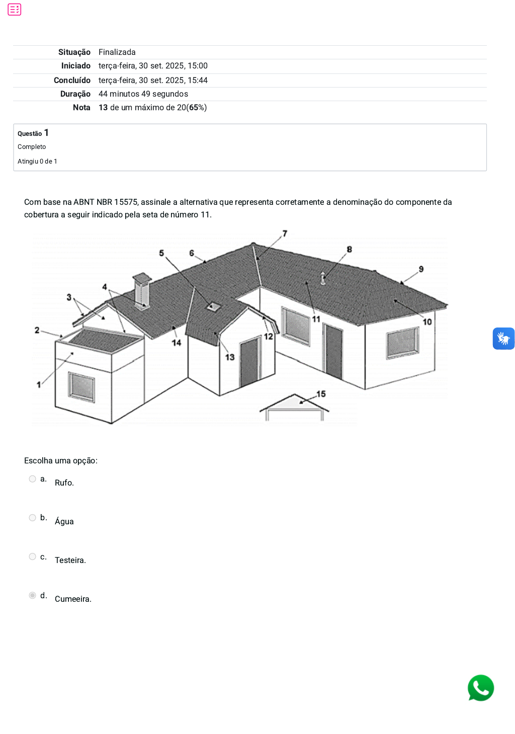 Situação Finalizada Iniciado terça-feira, 30 set. 2025, 15:00 Concluído terça-feira, 30 set. 2025, 15:44 Duração 44 minutos 49 segundos Nota 13 de um máximo de 20(65%) Questão 1 Completo Atingiu 0 de 1 Com base na ABNT NBR 15575, assinale a alternativa que representa corretamente a denominação do componente da cobertura a seguir indicado pela seta de número 11. Escolha uma opção: a. Rufo. b. Água c. Testeira. d. Cumeeira. Questão 2 Completo Atingiu 0 de 1 Questão 3 Completo Atingiu 1 de 1 Maternidade é a instalação utilizada para o parto das porcas, pois é nesta fase que muitos cuidados devem ser tomados. Qualquer erro na construção poderá trazer graves problemas, de umidade (empoçamento de fezes e urina), esmagamento de leitões, deficiência ou excesso de calor e frio, que é um dos grandes problemas na maternidade, devido a porca necessitar de temperaturas mais baixas que o leitão em um mesmo local. A baia deve ter uma proteção contra esmagamento dos leitões, quando a porca vai deitar-se. Essa proteção deve ficar a qual distância do piso e da parede? Escolha uma opção: a. Essa proteção deve ficar a 35 cm do piso e a 35 cm da parede b. Essa proteção deve ficar a 35 cm do piso e a 25 cm da parede c. Essa proteção deve ficar a 25 cm do piso e a 25 cm da parede d. Essa proteção deve ficar a 25 cm do piso e a 35 cm da parede Calcule o peso específico de um metro quadrado de uma parede com 3 metros de comprimento por 2,70 metros de altura, vedada com bloco cerâmico com furos horizontais com espessura de 9 cm e argamassa de 1,5 cm nas duas faces. Escolha uma opção: a. 1,56 kN/m² b. 30,42 Kn/m² c. 1,43 Kn/m² d. 25,74 kN/m² Questão 4 Completo Atingiu 1 de 1 Questão 5 Completo Atingiu 0 de 1 Para a determinação do Nº de gaiolas individuais necessária para a fase de aleitamento, utiliza-se a fórmula: Escolha uma opção: a. nº de gaiolas =( nº de porcas )/(nº de porcas/sala) b. nº de gaiolas =( nº de porcas + nº de porca/ano + período de ocupação)/(nº de semanas do ano) c. nº de gaiolas =( nº de porcas * nº de porca/ano * período de ocupação)/(nº de semanas do ano) d. nº de gaiolas =( nº de porcas * nº ciclos/ano + período de ocupação)/(nº de semanas do ano) Qual o espaço que uma única porca ocupa em média por m²? Escolha uma opção: a. 2,0 m² b. 1,5 m² c. 1,0 m² d. 2,5 m² Questão 6 Completo Atingiu 1 de 1 Questão 7 Completo Atingiu 0 de 1 Quando se pretende executar uma obra de construções e instalações rurais, um bom planejamento precisa considerar além de fatores como localização, condições físicas e climáticas da área que receberá a obra, também é de suma importância dar uma atenção especial aos materiais que serão utilizados. Estes por sua vez, podem ser de natureza simples ou compostos. O conhecimento das características desses materiais vai permitir a escolha mais adequada a cada situação. Do seu correto uso depende em grande parte a solidez, a durabilidade, o custo e a beleza (acabamento) das obras. Para que sejam considerados adequados, devem ser considerados os fatores de: I. Resistência e Durabilidade. II. Trabalhabilidade e Econômico. III. Higiene e Saúde. Estão CORRETAS as seguintes afirmativas: Escolha uma opção: a. I, II e III b. Apenas I e II c. Apenas I d. Apenas III A plataforma de ordenha de caprinos e ovinos é fixada a qual altura do piso? Escolha uma opção: a. 90 a 100 cm do piso b. 60 a 80 cm do piso c. 70 a 90 cm do piso d. 50 a 70 cm do piso Questão 8 Completo Atingiu 1 de 1 Questão 9 Completo Atingiu 1 de 1 Nos meses de verão, todas as precauções devem ser tomadas para manter a instalação do galpão com temperatura mais amena possível, tanto durante o dia como à noite. Vários recursos são utilizados para esse fim, exceto: Escolha uma opção: a. beiral curto b. ventilação forçada c. lanternim d. cortinas Calcule o volume útil de um tanque-rede circular com diâmetro de 5 m (raio de 2,5 m), altura total de 3,5 m, sendo que 0,3 m fica acima da linha d’água. Escolha uma opção: a. 84,78 m³ b. 5,7 m³ c. 62,8 m³ d. 90,43 m³ Questão 10 Completo Atingiu 1 de 1 Questão 11 Completo Atingiu 0 de 1 Das opções abaixo, qual não representa um tipo de silo? Escolha uma opção: a. encosta b. aéreo c. submerso d. trincheira Analise as afirmativas abaixo e julgue em verdadeiro ou falso: I. A quantidade de silagem ministrada por cabeça dia varia em função da idade e raça do animal, clima, suplementação animal, manejo, etc. ficando geralmente em torno de 8 e 30 kg/animal. II. Quanto maior a profundidade do silo, pior será o acamamento da massa. É recomendável uma altura de até 2,5 m para descarga manual. III. A quantidade necessária de silagem é determinada de acordo com o número de animais, período de alimentação e a quantidade de silagem gasta diariamente. Marque a afirmativa correta: Escolha uma opção: a. Apenas I está correta b. Apenas II está incorreta c. Apenas I e III estão corretas d. Todas estão corretas. Questão 12 Completo Atingiu 1 de 1 O que é um creep feeding? Escolha uma opção: a. O creep feeding ou pedilúvios, nada mais é que um local para desinfecção espontânea dos cascos dos animais. b. O creep feeding ou manjedoura, nada mais é que uma estrutura destinada ao fornecimento de volumosos inteiros (feno, capim verde, palha de feijão, etc.), localizados acima da cabeça dos animais, apresentando espaço suficiente para o focinho alcançar o alimento. c. O creep feeding ou cocho privativo, nada mais é que um cocho cercado, uma baia, gaiola ou ainda um piquete da pastagem, que permita a entrada somente das crias. d. O creep feeding ou bebedouro, nada mais é que um local para os animais beberem água. Questão 13 Completo Atingiu 1 de 1 Calcule o volume útil de um tanque-rede circular com diâmetro de 4,0 m, altura total de 2,0 m, sendo que 0,5 m fica acima da linha d’água. Escolha uma opçã