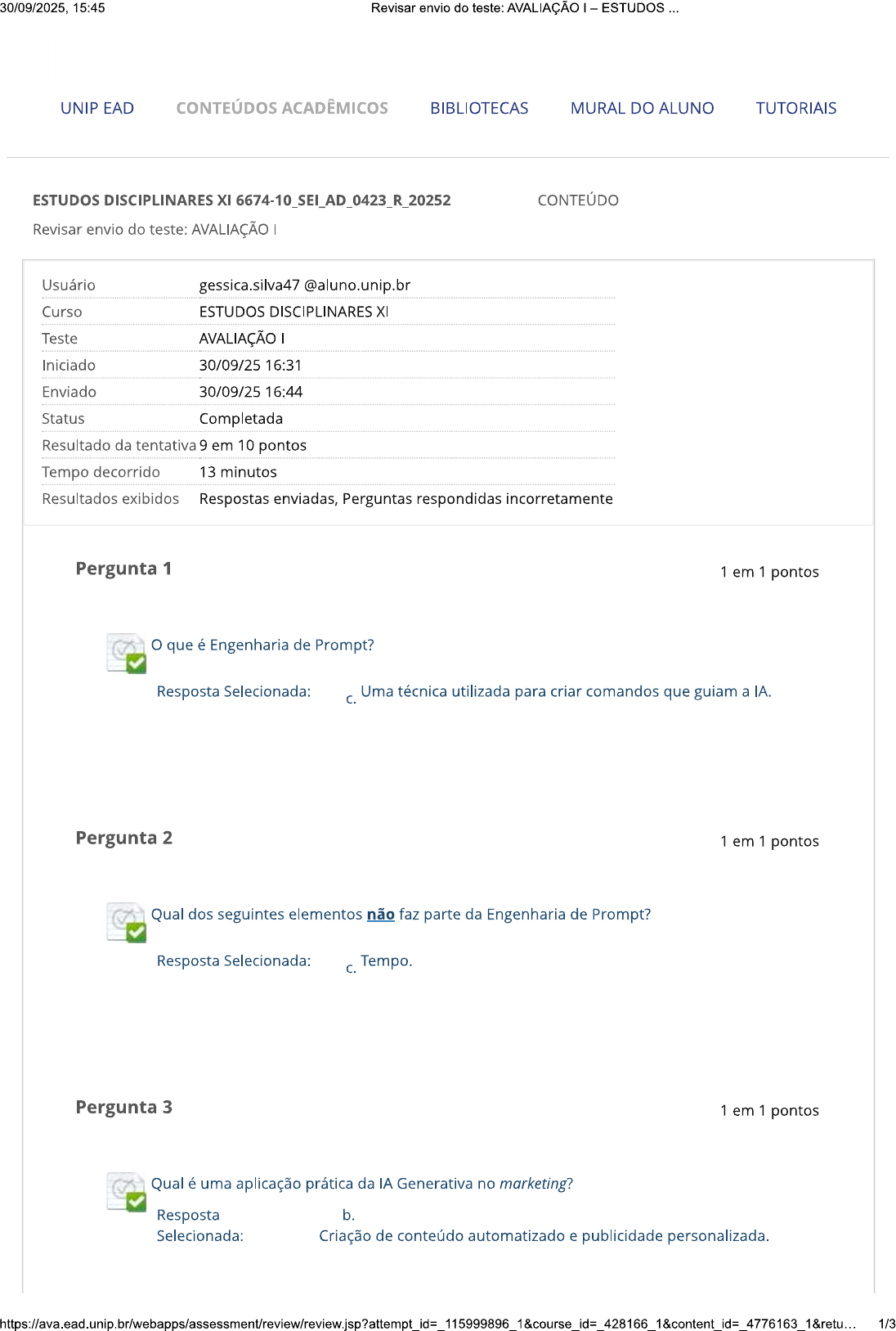 30/09/2025, 15:45 Revisar envio do teste: AVALIAÇÃO I ESTUDOS UNIP EAD CONTEÚDOS ACADÊMICOS BIBLIOTECAS MURAL DO ALUNO TUTORIAIS ESTUDOS DISCIPLINARES XI 6674-10_SEI_AD_0423_R_20252 CONTEÚDO Revisar envio do teste: AVALIAÇÃO Usuário gessica.silva47 @aluno.unip.br Curso ESTUDOS DISCIPLINARES XI Teste AVALIAÇÃO Iniciado 30/09/25 16:31 Enviado 30/09/25 16:44 Status Completada Resultado da tentativa 9 em 10 pontos Tempo decorrido 13 minutos Resultados exibidos Respostas enviadas, Perguntas respondidas incorretamente Pergunta 1 1 em 1 pontos que é Engenharia de Prompt? Resposta Selecionada: Uma técnica utilizada para criar comandos que guiam a IA. Pergunta 2 1 em 1 pontos Qual dos seguintes elementos não faz parte da Engenharia de Prompt? Resposta Selecionada: C. Tempo. Pergunta 3 1 em 1 pontos Qual é uma aplicação prática da IA Generativa no marketing? Resposta b. Selecionada: Criação de conteúdo automatizado e publicidade personalizada. 1/330/09/2025, 15:45 Revisar envio do teste: AVALIAÇÃO I ESTUDOS Pergunta 4 1 em 1 pontos Como a IA Generativa contribui para a personalização em massa no marketing? Resposta b. Selecionada: Adaptando mensagens e anúncios para diferentes segmentos de público. Pergunta 5 1 em 1 pontos Qual é a função do Teste de Turing, criado por Alan Turing em 1950? Resposta Selecionada: Determinar se uma máquina consegue simular comportamento humano. Pergunta 6 1 em 1 pontos que são Prompts na IA Generativa e qual é sua função? Resposta b. Selecionada: Comandos que orientam a máquina na geração de respostas. Pergunta 7 1 em 1 pontos Qual é papel dos chatbots com IA Generativa no atendimento ao cliente? Resposta Selecionada: b. Oferecer atendimento 24/7 com interações personalizadas. Pergunta 8 1 em 1 pontos 2/330/09/2025, 15:45 Revisar envio do teste: AVALIAÇÃO ESTUDOS. Qual é a vantagem do uso da IA na criação de personas para estratégias de marketing? Resposta b. Selecionada: A IA utiliza dados reais, como comportamento e interações online, para criar personas mais precisas. Pergunta 9 1 em 1 pontos Qual é benefício de definir restrições em um prompt, como limite de palavras ou complexidade? Resposta b. Selecionada: Garante que a resposta seja mais adequada ao uso específico, como mídias sociais ou apresentações. Pergunta 10 0 em 1 pontos Qual é uma das vantagens da coleta de dados realizada pela IA em estratégias de marketing? Resposta Selecionada: Fornecer uma visão estática do mercado. e. OK Terça-feira, 30 de Setembro de 2025 16h44min56s GMT-03:00 3/3