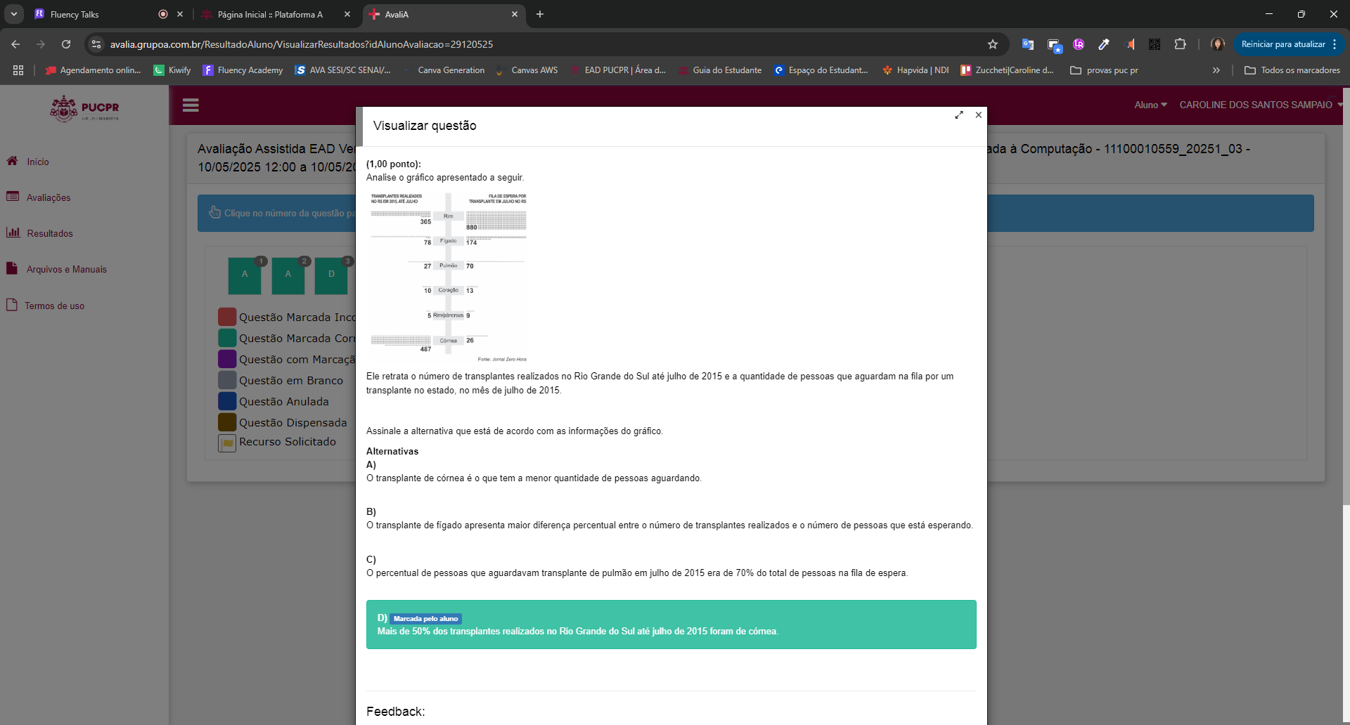 Fluency Talks Página Inicial Plataforma A AvaliA + avalia.grupoa.com.br/ResultadoAluno/VisualizarResultados?idAlunoAvaliacao=29120525 Reiniciar para atualiz Agendamento onlin... Kiwify Fluency Academy AVA SESI/SC SENAI/... Canva Generation Canvas AWS EAD PUCPR Área d... Guia do Estudante Espaço do Estudant.. Hapvida NDI Zuccheti|Caroline d... provas puc pr Todos os marca PUCPR Aluno CAROLINE DOS SANTOS X MARISTA Visualizar questão Avaliação Assistida EAD Ve ada à Computação - 11100010559_20251_03 - 10/05/2025 12:00 a 10/05/2 (1,00 ponto): Analise 0 gráfico apresentado a seguir. Avaliações JULHO TRANSPLANTE Clique no número da questão 305 880 Resultados 78 Figado 174 27 Arquivos e Manuais 70 A A D 10 Coração 13 Termos de uso Questão Marcada 5 9 Questão Marcada Cor 26 487 Questão com Marcaçã Zero Questão em Branco Ele retrata numero de transplantes realizados no Rio Grande do Sul julho de 2015 e a quantidade de pessoas que aguardam na fila por um transplante no estado, no de julho de 2015. Questão Anulada Questão Dispensada Assinale a alternativa que de acordo com as informações do Recurso Solicitado Alternativas A) O transplante de cornea é 0 que tem a menor quantidade de pessoas aguardando. B) transplante de figado apresenta maior diferença percentual entre numero de transplantes realizados e 0 número de pessoas que esperando. C) percentual de pessoas que aguardavam transplante de pulmão em julho de 2015 era de 70% do total de pessoas na fila de espera. D) Marcada pelo aluno Mais de 50% dos transplantes realizados no Rio Grande do Sul até julho de 2015 foram de cómea. Feedback: