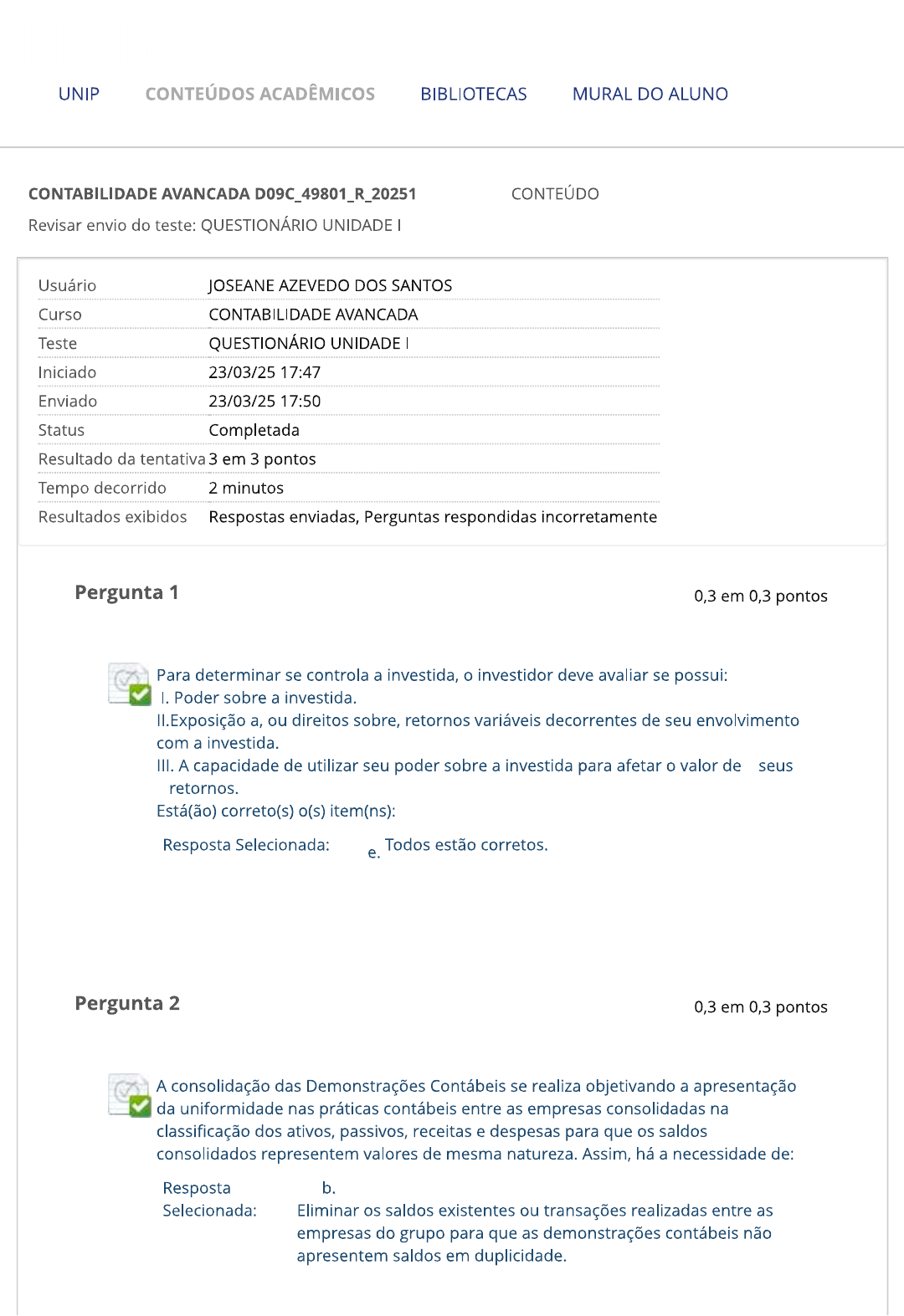 UNIP CONTEÚDOS ACADÊMICOS BIBLIOTECAS MURAL DO ALUNO CONTABILIDADE AVANCADA D09C_49801_R_20251 CONTEÚDO Revisar envio do teste: QUESTIONÁRIO UNIDADE Usuário JOSEANE AZEVEDO DOS SANTOS Curso CONTABILIDADE AVANCADA Teste QUESTIONÁRIO UNIDADE Iniciado 23/03/25 17:47 Enviado 23/03/25 17:50 Status Completada Resultado da tentativa 3 em 3 pontos Tempo decorrido 2 minutos Resultados exibidos Respostas enviadas, Perguntas respondidas incorretamente Pergunta 1 0,3 em 0,3 pontos Para determinar se controla a investida, investidor deve avaliar se possui: I. Poder sobre a investida. II.Exposição ou direitos sobre, retornos variáveis decorrentes de seu envolvimento com a investida. III. A capacidade de utilizar seu poder sobre a investida para afetar valor de seus retornos. Está(ão) correto(s) o(s) item(ns): Resposta Selecionada: Todos estão corretos. e. Pergunta 2 0,3 em 0,3 pontos A consolidação das Demonstrações Contábeis se realiza objetivando a apresentação da uniformidade nas práticas contábeis entre as empresas consolidadas na classificação dos ativos, passivos, receitas e despesas para que os saldos consolidados representem valores de mesma natureza. Assim, há a necessidade de: Resposta b. Selecionada: Eliminar os saldos existentes ou transações realizadas entre as empresas do grupo para que as demonstrações contábeis não apresentem saldos em duplicidade.Pergunta 3 0,3 em 0,3 pontos As perdas intragrupo podem indicar redução do valor recuperável dos ativos correspondentes que precisa: Resposta d. Selecionada: Ser reconhecida nas demonstrações contábeis consolidadas. Pergunta 4 0,3 em 0,3 pontos Na ausência de quaisquer acordos adicionais que alterem a tomada de decisões, a avaliação do controle se concentra em: Resposta b. Selecionada: Instrumentos patrimoniais que conferem ao seu titular direitos de voto proporcionais. Pergunta 5 0,3 em 0,3 pontos principal objetivo de se ter controle de uma companhia é: Resposta Selecionada: Determinar as políticas operacional e de financiamento da investida. Pergunta 6 0,3 em 0,3 pontos A Participação dos Não Controladores é a parte do patrimônio líquido de uma controlada não atribuível, direta ou indiretamente, à controladora. É a parcela do patrimônio líquido de empresas controladas que pertence a acionistas minoritários, representados por terceiros que não pertencem ao grupo. valor dessa participação é constituído pela parte do capital desses minoritários e pelos outrositens do patrimônio líquido. Na consolidação do Balanço, a parcela do capital desses minoritários (ou não controladores) deve: Resposta Selecionada: C. Ser destacada no patrimônio líquido consolidado. Pergunta 7 0,3 em 0,3 pontos Para muitas investidas, uma série de atividades operacionais e de financiamento afetam significativamente seus retornos. Entre elas, pode-se destacar: I. Compra e venda de bens ou serviços. II. Gestão de ativos financeiros durante sua vida (incluindo em caso de inadimplência). III. Seleção, aquisição ou alienação de ativos. IV. Pesquisa e desenvolvimento de novos produtos ou processos. V. Determinação da estrutura de capital para obtenção de recursos. Está(ão) correto(s) o(s) item(ns): Resposta Selecionada: I, II, III, IV e V. Pergunta 8 0,3 em 0,3 pontos Considerando as disposições da Lei n. 6.404/76 e as alterações posteriores, assinale a opção INCORRETA. Resposta d. Selecionada: valor contábil do investimento em coligada abrange custo de aquisição mais a equivalência patrimonial e ágio não amortizado, deduzido do deságio não amortizado e da provisão para perdas. Pergunta 9 0,3 em 0,3 pontos Deverá deixar de ser avaliado pelo método de equivalência patrimonial, investimento em sociedades coligadas e controladas de:Resposta a. Selecionada: Empresa em efetiva e clara evidência de perda de continuidade de suas operações ou no caso em que estas estejam operando sob severas restrições em longo prazo que prejudiquem significativamente a sua capacidade de transferir recursos para a investidora. Pergunta 10 0,3 em 0,3 pontos Se uma empresa do grupo vendeu, ao preço de custo, $ 16.000 de mercadorias para outra empresa do grupo, a empresa compradora tem um passivo de $ 16.000 para com a empresa vendedora, e esta, por sua vez, tem a receber $ 16.000 da empresa compradora. Nesse caso, os lançamentos de eliminações são: Resposta a. Selecionada: Fornecedores (empresa compradora) $16.000 a Duplicatas a Receber (empresa vendedora) $16.000. OK Domingo, 23 de Março de 2025 17h50min31s BRT