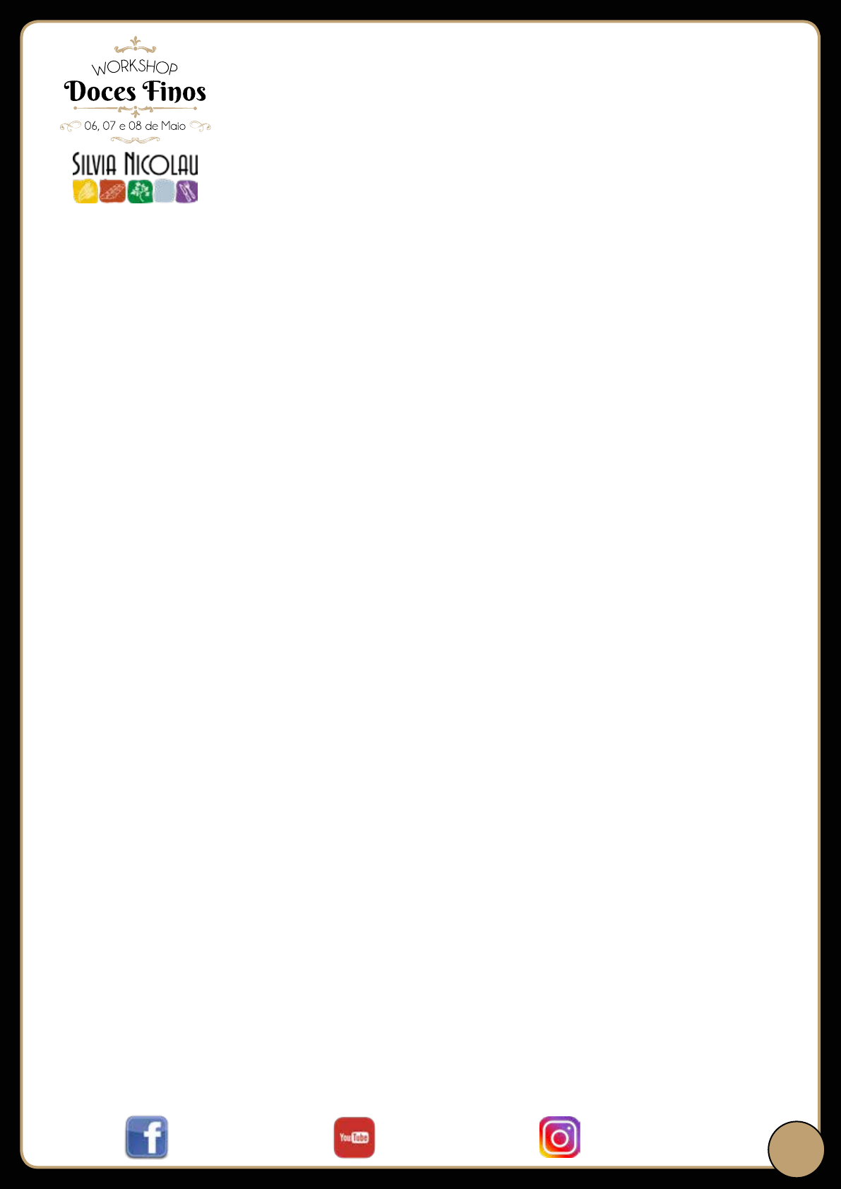 Workshop Doces Finos 1º dia BRIGADEIRO GOURMET Rendimento: aproximadamente 30 unidades Validade: 5 dias em temperatura ambiente Massa Ingredientes 1 lata de leite condensado [395g] 2 colheres (sopa) de farinha de trigo [20g] 1/4 da caixinha de creme de leite [50g] 100g de chocolate ao leite em barra, picado Decoração 1 e 1/2 xícaras (chá) de raspas de chocolate [120g] ou 1 xícara de split (granulados quadradinhos) [180g] Modo de preparo Em uma tigela apropriada para micro-ondas misture um pouco do leite condensado com a farinha de trigo peneirada. Junte o restante do leite condensado, o creme de leite e o chocolate ao leite. Cozinhe por quatro minutos em potência alta. Retire, mexa bem e cozinhe por mais quatro minutos em potência média. Transfira para um prato, cubra e deixe esfriar. Modele bolinhas e passe-as no chocolate em raspas. Acomode os doces em forminhas de sua preferência. Dica O brigadeiro pode ser preparado no fogão. Basta misturar os ingredientes em uma panela e levar ao fogo médio, mexen- do sem parar, até ferver e engrossar. BRIGADEIRO GOURMET RECHEADO Rendimento: aproximadamente 30 unidades Validade: 5 dias em temperatura ambiente Massa Ingredientes 1 lata de leite condensado [395g] 2 colheres (sopa) de farinha de trigo [20g] 1/4 da caixinha de creme de leite [50g] 100g de chocolate branco em barra, picado 5 gotas de essência de cereja (opcional) Corante vermelho (opcional) Complemento 30 cerejas miúdas em calda, escorridas [150g] Decoração 1 e 1/2 xícaras (chá) de raspas de chocolate sabor morango [120g] /ChefSilviaNicolau /chefsilvianicolau @chefsilvianicolau 1 Modo de preparo Em uma panela misture um pouco do leite condensado com a farinha peneirada. Junte o restante do leite condensado, o creme de leite e o chocolate branco. Leve ao fogo médio, mexendo sem parar, até ferver e engrossar. Junte a essência e o corante. Transfira para um prato, cubra e deixe esfriar. Divida a massa em porções, abra cada porção e recheie com uma cereja. Modele em formato de bolinhas e passe-as nas raspas de chocolate. Acomode os doces em forminhas de sua preferência. Dica O brigadeiro pode ser preparado no micro-ondas. Basta cozinhar por quatro minutos em potência alta e mais quatro em potência média. /ChefSilviaNicolau /chefsilvianicolau @chefsilvianicolau 2 Workshop Doces Finos 2º dia CHUVA DE OURO DE AMENDOIM Rendimento: aproximadamente 25 unidades Validade: 5 dias em temperatura ambiente Massa Ingredientes 250g de farinha de amendoim 5 colheres (sopa) de doce de leite [aproximadamente 125g] 1/4 xícara (chá) de açúcar refinado [45g] Modo de preparo Misture o doce de leite com a farinha de amendoim até obter uma massa maleável. Modele bolinhas e passe-as no açúcar. Prense as bolinhas em um molde para que fiquem com formato bem definido (sugestão: forma para bombons código 05). Cobertura e decoração Pedaços e farinha de amendoim Pó dourado comestível 150g cobertura fracionada sabor chocolate ao leite Modo de preparo Aplique o pó dourado na farinha e nos pedaços de amendoim. Reserve. Derreta a cobertura fracionada em banho-maria morno (50°C) ou micro-ondas (potência média). Banhe os doces um a um e acomode-os em uma bandeja forrada com papel manteiga. Aplique a decoração imediatamente e aguarde cristalização total da cobertura. Acomode os doces em forminhas de sua preferência. CHUVA DE OURO DE NOZES Rendimento: aproximadamente 25 unidades Validade: 5 dias em temperatura ambiente Massa Ingredientes 250g de nozes moídas 5 colheres (sopa) de doce de leite [aproximadamente 125g] 1/4 xícara (chá) de açúcar refinado [45g] Modo de preparo Misture o doce de leite com as nozes moídas até obter uma massa maleável. Modele bolinhas e passe-as no açúcar. Prense as bolinhas em um molde para que fiquem com formato bem definido (sugestão: forma para bombons código 1142). Cobertura e decoração Pedaços de nozes Pó dourado comestível 150g cobertura fracionada sabor chocolate branco /ChefSilviaNicolau /chefsilvianicolau @chefsilvianicolau 1 Modo de preparo Aplique pó dourado nas nozes e reserve. Derreta a cobertura fracionada em banho-maria morno (50°C) ou micro-ondas. Banhe os doces um a um e acomode-os em uma bandeja forrada com papel manteiga. Aplique a decoração imediatamente e aguarde cristalização total da cobertura. DOCE DE COCO BANHADO EM FONDANT Rendimento: aproximadamente 30 unidades Validade: 5 dias em temperatura ambiente Massa Ingredientes 1 lata de leite condensado [395g] 1 pacotinho de coco ralado [100g] 5 cravos-da-índia 1/4 xícara (chá) de açúcar refinado [60g] Modo de preparo Misture o leite condensado com o coco ralado e os cravos em um recipiente apropriado para micro-ondas. Cozinhe por quatro minutos em potência alta. Mexa bem, retire os cravos, transfira para um prato, cubra e deixe esfriar. Divida a massa em pequenas porções, modele bolinhas e passe-as no açúcar. Prense as bolinhas em um molde para que fiquem com formato bem definido (sugestão: forma para bombons código 05). Cobertura e decoração 2 e 1/2 xícaras (chá) de açúcar de confeiteiro impalpável [300g] 1/4 xícara (chá) de água [60ml] Corante em gel cor-de-rosa (ou outra cor de sua preferência) Flores comestíveis (de pasta americana ou de glacê real) Modo de preparo Peneire o açúcar em um refratário e vá adicionando água até obter uma textura pastosa. Cozinhe no micro-ondas por um minuto. Mexa vigorosamente e adicione o corante cor-de-rosa. Banhe os doces um a um e acomode-os sobre uma bandeja forrada com papel manteiga. Decore imediatamente com as flores e aguarde o fondant endurecer. Acomode os doces nas forminhas de sua preferência. Dica: Caso queira, mantenha o fondant em banho-maria enquanto banha os doces. DOCE DE COCO E AMEIXA BANHADO EM FONDANT Rendimento: aproximadamente 35 unidades Validade: 5 dias em temperatura ambiente Massa Ingredientes 1 lata de leite condensado [395g] 1 pacotinho de coco ralado [100g] 10