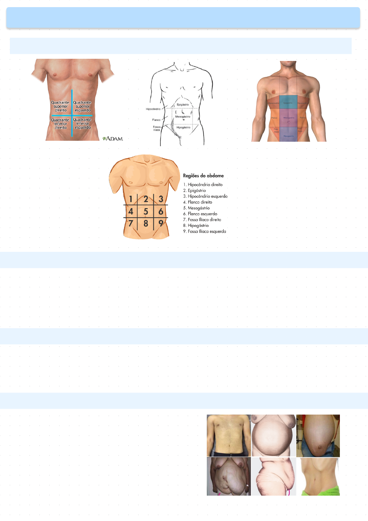 EXAME FÍSICO DO ABDÔMEN TOPOGRAFIA: ETAPAS: 1. Inspeção estática 2. Inspeção dinâmica 3. Ausculta 4. Percurssão 5. Palpação - superficial e profunda 6. Manobras especiais CARACTERIZAR DOR ABDOMINAL • Tempo: aguda ou cronica • Tipo: em pontada, em colica, em aperto, em queimação • Localização: circunscrita x difusa • Irradiação INSPEÇÃO ESTÁTICA • Forma e volume do abdômen • Abaulamento ou retrações • Veias superficieias • Movimentos • Cicatrizes • Hérnias Tipos de abdômen: • normal ou atípico • Globoso ou protuberante • Em ventre de batráquio • Pendular • Avental • Escavado Abdômen normal ou plano Globoso ou protuberante Em ventre de batráquio Pendular Avental Escavado • Inspecionar hérnias, cicatrizes de cirurgias.. INSPEÇÃO DINÂMICA • Manobra de Valsalva: solicitar ao paciente que posicione o dorso da mão no boca e assopre forte, sem deixar o ar sair, deve observar a presença de hérnias abdominais Descrição da inspeção: Apresenta abdômen plano, sem lesão elementar, sem circulação colateral, sem retração ou abaulamento, sem cicatrizes patologicas e herniações, padrão respiratório misto ou toraco abdominal, ausencia de movimentos peristalticos, ausencia de herniaçoes e massas na parede abdominal AUSCULTA DO ABDÔMEN • Auscultar em cada quadrante por 5 - 10 segundos • Em sentindo horário (fígado -> estômago) • Busca a presença de: ruídos hidroaéreos presentes e normoaudíveis. • RHA -> são sons gastrointestinais movimento pela agua e ar (hidroaereos) • Auscultar focos vasculares: aorta, arteria renal, artéria ilíaca, artéria femoral PERCUSSÃO DO ABDÔMEN • Fazer nos quadrantes do abdômen • Observar: som timpânico, hipertimpânico, sub-maciço, e maciço. Estômago: som timpânico Intestino delgado: som timpânico Fígado: som maciço Intestino grosso: timpânico Descrição da percussão: A percussão abdominal do paciente apresenta som timpânico, nos quadrantes X e apresentando som maciço nos quadrantes Y PALPAÇÃO ABDOMINAL • SUPERFICIAL • Apenas uma mão!!!! • Palpar as 9 regiões do abdômen • Em cada “linha” da topografia, deve-se sempre voltar: Direita -> esquerda • PROFUNDA • Utiliza as duas mãos!!! • Palpar as 9 regioes do abdômen • Mesmo sentido da superficial • Avaliar massas abdominais Características: • Localização • Tamanho e formato • Consistência • Superficie • Sensibilidade • Mobilidade • Pulsação - massa vascular ou massa sólida sobre estrutura vascular Descrição da palpação A palpação superficial do abdômen apresenta-se sem alterações de temperatura, e sem massas palpáveis superficialmente, na palpação profunda apresenta ausências de pontos dolorosos, ausência de massas palpáveis profundamente ou viceromegalias EXAME FÍSICO DO PRECÓRDIO ETAPAS 1. Inspeção: precórdio sem abaulamento 2. Palpação: ictus cordis palpável 1-2 polpas digitais na linha hemiclavicular esquerda no 5º espaço intercostal 3. Ausculta: bulha cardíacas rítmicas e normofonéticas em dois tempos, sem sopro ou outros ruídos Descrição do exame normal do precórdio: Precordio calmo, sem abaulamento, retração ou deformidades, ictus cordis palpáveis 1-2 polpas digitais na linha hemiclavicular esquerda no 5º EIC. Bulhas cardíacas rítmicas, normofonéticas em dois tempos, sem sopros INSPEÇÃO E PALPAÇÃO • São realizados ao mesmo tempo!! Deve analisar: • Pesquisa de abaulamento • Análise do ictus cordis ou choque da ponta • Análise de batimentos ou movimentos visíveis ou palpáveis • Pesquisa de frêmito cardiovascular - sopro. Palpação do ictus cordis O que é? Ictus cordis ou choque de ponta é a pulsação do ápice do coração, que corresponde ao ventrículo esquerdo sincrônico com a sístole cardíaca, que pode ser visto ou palpado • Localização: 5 EIC e linha hemiclavicular esquerda, lobo abaixo da aureola • Extensão: um ou duas polpas digitais • Mobilidade: desloca-se 1 a 2 cm com a mudança do decúbito dorsal para lateral FISIOLOGIA BULHAS CARDÍACAS • TUM 1º Bulha B1: sístole, fechamento das valvas mitral é tricúspide. Coincide com a ictus cordis e com o pulso carotídeo. Tem timbre mais grave, com tempo de duração maior que o da 2º bulha “-> junto com o pulso carotídeo • TA 2º Bulha B2: diástole, fechamento das valvas aortica e pulmonar. • TU 3º Bulha B3: é o terço inicial da diástole, barulha na parede durante a diástole, enchimento ventricular, mais audível na área mitral em decúbito lateral esquerdo e com a campânula do estetoscópio • TU 4º Bulha B4: é o final da diástole, correspondendo a pré-diástole, brusca desacelarações do fluxo sanguineo na contração atrial AUSCULTA • Sentado flexionado para frente • decúbito dorsal • Decúbito lateral esquerdo • Sentado • Em pe com o tronco flexionado Posição do paciente: Focos de ausculta: • Foco aórtico: 2º EID • Foco pulmonar: 2º EIE • Foco aórtico acessório: 3/4º EIE • Foco tricúspide: 5º EIE • Foco mitral: 5º EIE na linha hemiclavicular Reconhecer as bulhas cardíacas: • 1º Bulha TUM: coincide com o pulso carotídeo e do ictus cordis - timbre mais grave • 2º Bulha TÁ: acontece após o pequeno silencio - timbre mais agudo e duração menos que a 1º Caracterizar as bulhas: • Ritmo: regular ou irregular • Tempo: normalmente duas bulhas, diz-se ritmo cardiaco em dois tempos • Fonese: intensidade audível/ normal (normofonetica), diminuida (hipofonetica) ou aumentada (hiperfonética) AUSCULTA SOPROS • Patológico • São ruídos que ocorrem quando passam em estruturas alteradas - câmeras cardíacas, aparelhos valvares e parede de vasos, ou até mesmo por modificação na velocidade da corrente e viscosidade do sangue Considerar: • Situação do ciclo cardiaco - sistólica, diastólica, sistodiastolico, ou contínuos • Localização - qual foco