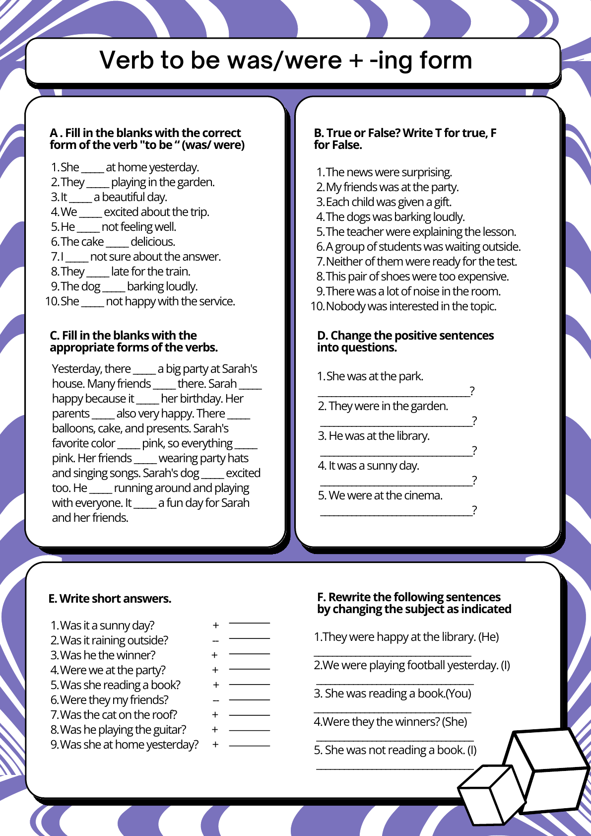 1.Was it a sunny day? + 2.Was it raining outside? -- 3.Was he the winner? + 4.Were we at the party? + 5.Was she reading a book? + 6.Were they my friends? -- 7.Was the cat on the roof? + 8.Was he playing the guitar? + 9.Was she at home yesterday? + 1.They were happy at the library. (He) __________________________________ 2.We were playing football yesterday. (I) __________________________________ 3. She was reading a book.(You) __________________________________ 4.Were they the winners? (She) __________________________________ 5. She was not reading a book. (I) __________________________________ Verb to be was/were + -ing form 1.She _____ at home yesterday. 2.They _____ playing in the garden. 3.It _____ a beautiful day. 4.We _____ excited about the trip. 5.He _____ not feeling well. 6.The cake _____ delicious. 7.I _____ not sure about the answer. 8.They _____ late for the train. 9.The dog _____ barking loudly. 10.She _____ not happy with the service. B. True or False? Write T for true, F for False. A . Fill in the blanks with the correct form of the verb "to be “ (was/ were) 1.The news were surprising. 2.My friends was at the party. 3.Each child was given a gift. 4.The dogs was barking loudly. 5.The teacher were explaining the lesson. 6.A group of students was waiting outside. 7.Neither of them were ready for the test. 8.This pair of shoes were too expensive. 9.There was a lot of noise in the room. 10.Nobody was interested in the topic. C. Fill in the blanks with the appropriate forms of the verbs. Yesterday, there _____ a big party at Sarah's house. Many friends _____ there. Sarah _____ happy because it _____ her birthday. Her parents _____ also very happy. There _____ balloons, cake, and presents. Sarah's favorite color _____ pink, so everything _____ pink. Her friends _____ wearing party hats and singing songs. Sarah's dog _____ excited too. He _____ running around and playing with everyone. It _____ a fun day for Sarah and her friends. F. Rewrite the following sentences by changing the subject as indicated D. Change the positive sentences into questions. 1.She was at the park. __________________________________? 2. They were in the garden. __________________________________? 3. He was at the library. __________________________________? 4. It was a sunny day. __________________________________? 5. We were at the cinema. __________________________________? E. Write short answers. Write a short paragraph (8-10 sentences) about an important experience in your life using the present perfect tense. Be sure to include details like when it happened, how it made you feel, and why it was important. 3. Writing activity