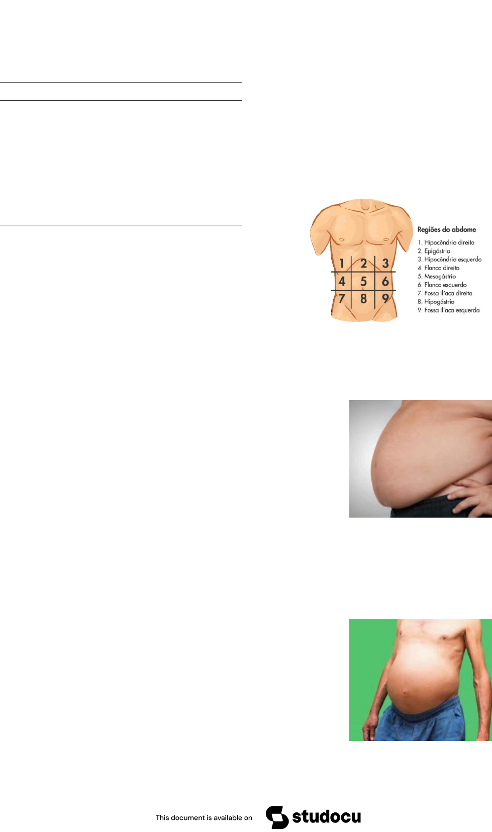 Semiologia do Abdome 1 Gabriela Erthal – T13 ANAMNESE - Identificação; - Queixa principal; - História da doença atual; - Revisão dos sistemas; - Antecedentes pessoais e familiares; - Hábitos de vida; - Condições socioeconômicas e culturais. EXAME FÍSICO - O paciente só se sente verdadeiramente exa- minado quando está sendo inspecionado, pal- pado, percutido, auscultado, pesado e medido; - Respeito mútuo, seriedade e segurança são fundamentais no exame físico. PASSOS DO EXAME FÍSICO GERAL - Estado geral: bom, regular ou ruim; - Nível de consciência: lúcido, atento, coerente e orientado; - Fala e linguagem: disfonia (rouco), disartria (alteração na fonologia), disfasia (dificuldade de expressão e compreensão devido à lesão cerebral); - Hidratação das mucosas, da pele, dos olhos e da urina; Urina: Poliúria: excreção de urina superior a 2500mL por dia; Oligúria: excreção de urina abaixo de 500mL por dia Anúria: ausência da produção e elimina- ção da urina; - Antropometria e estrado nutricional; Antropometria: peso, altura, IMC, avaliação da circunferência abdominal; - Desenvolvimento físico; - Fácies e atitude; - Pele, mucosas e fâneros; - Tecido subcutâneo e panículo adiposo; - Musculatura; - Linfonodos; - Veias superficiais/circulação colateral; - Edemas; - Biotipo, postura e marcha; - Sinais vitais: PA, temperatura, frequência car- díaca e respiratória. BOCA E ANEXOS - Com o paciente sentado e uma boa iluminação - Médico sempre com luvas; - É usada uma espátula de madeira que auxilia na inspeção e na palpação; Verificar a arcada dentária: se usa próteses ou não. - Primeiramente se faz um exame das condi- ções gerais e, após, exame das estruturas in- dividuais. ABDOME Inspeção - Inspeção estática Forma do abdome: Globoso: Gravídico; Obesidade: forma de avental; Neoplasia: o que deixa o abdome mais disforme é o tumor de ovário, quase que simulando um abdome gravídico; Ascite (acúmulo de líquido): abdome batráquio, ou seja, abdome dilatado exageradamente nos flancos. A famo- sa “barriga de sapo”. Downloaded by Carol Moura (caroldipace@gmail.com) lOMoARcPSD|39506450 https://www.studocu.com/pt-br?utm_campaign=shared-document&utm_source=studocu-document&utm_medium=social_sharing&utm_content=semiologia-do-abdome 2 Gabriela Erthal – T13 Escavado; Plano. Simetria; Simétrico; Assimétrico; Cicatriz umbilical e cicatrizes cirúrgicas; Cicatriz retraída ou normal; Cicatriz abaulada ou protrusa: hérnia. Superfície cutânea; Circulação colateral: No esôfago: pode causar varizes e san- gramento; Hipertensão portal: Manobra de enchimento; Cabeça de medusa - Inspeção dinâmica: Padrão ventilatório; Diafragmático; Supra costal. Herniações: Diástase de retos; Umbilical; Inguinal. Palpação - Palpação superficial: Técnica: Mãos espalmadas; Palpar os 4 quadrantes; Iniciar longe da região dolorosa; Observar dor pelo fácies ou verbalização Aprofundar 1 a 2cm. Objetivos: Resistência da parede: flácido ou tenso; Sensibilidade; Continuidade da parede - Palpação profunda: Técnica: Mãos espalmadas, paralelas ou sobre- postas; Palpar as 9 regiões; Iniciar longe da região dolorosa; Observar dor pelo fácies ou verbalização Utilizar manobras órgão-específicas. Downloaded by Carol Moura (caroldipace@gmail.com) lOMoARcPSD|39506450 3 Gabriela Erthal – T13 Objetivos: Visceromegalias; Nodulações; Sensibilidade. Fossa ilíaca esquerda: sigmoide; Parte do cólon mais fácil de palpar; Especialmente em magros e com ab- dome flácido; Observar suas disposições na FIE. Posicionar as mãos no plano perpendi- cular; Normal: cordão firme, móvel, 1 a 2cm de diâmetro; Anormal: Dor leve a moderada no intestino irri- tável; Dor forte na diverticulite/apendagite; Massa: tumor, fecaloma, abscesso, volvo. Flanco esquerdo: cólon descendente e rim; Cólon descendente é difícil de palpar; Mais provável em magros e com ab- dome flácido; Dor pode indicar diverticulite ou apen- dagite. Rim é normal não palpar. Palpação bimanual; Volume aumentado: hidronefrose, tu- mor, cistos; Doloroso: pielonefrite. Hipocôndrio esquerdo: baço; Normal não ser palpável; Esplenomegalia: cresce inferior, medial e anterior. I: palpável sob o rebordo costal es- querdo (RCE); II: entre RCE e a linha umbilical trans- versal; III: palpável abaixo da linha umbilical. Schuster Epigástrio: estômago, fígado e transverso; O normal é não sentir nada. Massa tumoral. Hipocôndrio direito: Bordo hepático Palpação em garra (2) é preferível; Hepatomegalia: mediar em dedos abaixo do rebordo; Normal: palpar até 1 dedo do rebordo à inspiração; Avaliar: forma, consistência, nodulari- dade e dor. Limite superior do fígado: Percussão intercostal hemiclavicular direita; Difícil na mulher por causa da mama; Permite a hepatimetria: em torno de 8cm. Vesícula biliar: Ponto cístico Downloaded by Carol Moura (caroldipace@gmail.com) lOMoARcPSD|39506450 https://www.studocu.com/pt-br?utm_campaign=shared-document&utm_source=studocu-document&utm_medium=social_sharing&utm_content=semiologia-do-abdome 4 Gabriela Erthal – T13 Lei de Curvosier-Terrier: vesícula pal- pável e indolor, por obstrução neoplá- sica das vias biliares extra-hepáticas, principalmente na cabeça do pan- creas; Sinal de Murphy: colecistite aguda. Flanco direito: cólon ascendente e rim; Cólon ascendente é difícil de palpar; Mais provável em magos com abdo- me flácido; Dor pode indicar apendicite retrocecal Rim: em magros pode se palpar o polo inferior. Volume aumentado: hidronefrese, tu- mor, cisto; Doloroso: pielomefrite (+ punho-per- cussão lombar no ângulo costoverte- bral). Fossa ilíaca direita: ceco e apêndice; Ceco: é comum palpar, especialmente em magros; Órgão elástico e com formato cilíndri- co; Sinal de gargarejo nos quadros diar- reicos. Apêndice: dor à palpação - ponto de Mc- Burney - que piora na descompressão rápida - 