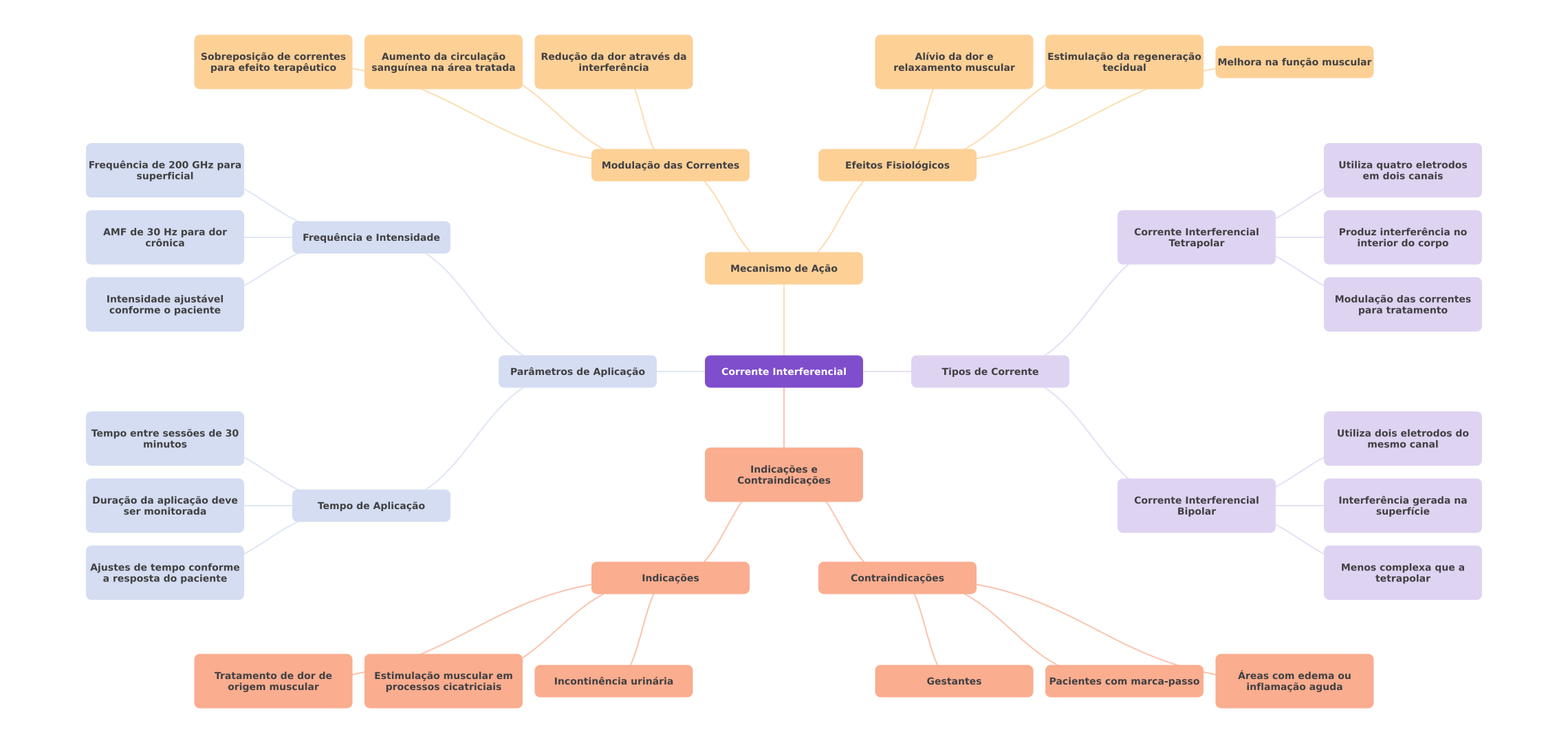 Sobreposição de correntes Aumento da circulação Redução da dor através da Alívio da dor e Estimulação da regeneração para efeito terapêutico sanguínea na área tratada interferência relaxamento muscular tecidual Melhora na função muscular Frequência de 200 GHz para Modulação das Correntes Efeitos Fisiológicos Utiliza quatro eletrodos superficial em dois canais AMF de 30 Hz para dor Corrente Interferencial Produz interferência no crônica Frequência e Intensidade Tetrapolar interior do corpo Mecanismo de Ação Intensidade ajustável Modulação das correntes conforme paciente para tratamento Parâmetros de Aplicação Corrente Interferencial Tipos de Corrente Tempo entre sessões de 30 Utiliza dois eletrodos do minutos mesmo canal Indicações e Contraindicações Duração da aplicação deve Corrente Interferencial Tempo de Aplicação Interferência gerada na ser monitorada Bipolar superfície Ajustes de tempo conforme Menos complexa que a a resposta do paciente Indicações Contraindicações tetrapolar Tratamento de dor de Estimulação muscular em Áreas com edema ou Incontinência urinária Gestantes origem muscular processos cicatriciais Pacientes com marca-passo inflamação aguda