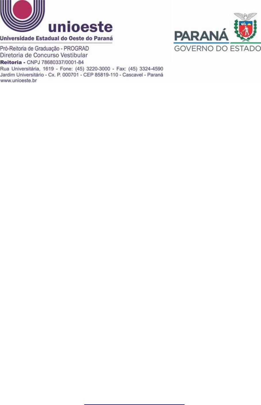 EDITAL Nº 012/2024-PROGRAD ABERTURA DE INSCRIÇÕES PARA A PRIMEIRA EDIÇÃO DA SELEÇÃO DE INGRESSO EM VAGAS REMANESCENTES NOS CURSOS DE GRADUAÇÃO DA UNIOESTE, PARA O ANO LETIVO DE 2024. O Pró-Reitor de Graduação da Universidade Estadual do Oeste do Paraná, no uso de suas atribuições, considerando: − Lei nº 13.709, de 14 de agosto de 2018 (Lei Geral de Proteção de Dados Pessoais – LGPD), alterada pela Lei nº 13.853, de 8 de julho 2019; − Lei Estadual nº 12.256, de 10 de agosto de 1998, que dispõe sobre transferência de alunos, para Instituições Estaduais de Ensino Superior; − a Resolução nº 100/2023-CEPE, de 29 de junho de 2023 (Aprova a política de ingresso nos Cursos de Graduação da Unioeste, a partir do ano letivo 2024), alterada pelo Ato Executivo nº 017/2024, de 20 de fevereiro de 2024; − a existência de vagas remanescentes nos cursos de graduação da Unioeste para ingresso no ano letivo de 2024; TORNA PÚBLICO: 1. DISPOSIÇÕES GERAIS Art. 1º A abertura das inscrições para a Primeira Edição da Seleção para Ingresso em Vagas Remanescentes nos cursos de graduação da Unioeste (Seleção), para o ano letivo de 2024, que é realizado de acordo com as normas deste Edital, levando a certame público as vagas descritas no Anexo I deste Edital. § 1º A inscrição é um ato voluntário do candidato que, ao se inscrever, aceita as condições e regulamentações deste Edital e seus anexos bem como de editais complementares e outras normas e instruções da Universidade, incluídas aquelas publicadas em www.unioeste.br/remanescentes, não podendo alegar desconhecimento delas. § 2º A Seleção se destina, ao candidato que comprove as condições para ocupação das vagas ofertadas, nos termos deste Edital, respeitadas as modalidades http://www.unioeste.br/remanescentes de ocupação. § 3º A Seleção é organizada e executada pela Pró-Reitoria de Graduação da Unioeste – PROGRAD, por meio da Diretoria de Concurso Vestibular – DCV. § 4º O endereço eletrônico oficial da Seleção é www.unioeste.br/remanescentes, por meio do qual, todas as orientações, normas, instruções, regulamentações e informações são publicadas, não sendo admitido outro canal em sua substituição, atribuindo-se responsabilidade exclusiva ao candidato quanto ao acompanhamento das publicações realizadas para seu pleno conhecimento. § 5º O ambiente eletrônico para registro da inscrição é denominado Sistema e permite, entre outras funcionalidades e nos casos em que se aplica, o envio de arquivos, além de outros tipos de interações no que tange às demandas relacionadas à Seleção e previstas em Edital. § 6º Para utilização do Sistema, o candidato deve cadastrar senha, de cunho pessoal e intransferível. Art. 2º Para efeito desta Seleção, ficam estabelecidas as seguintes definições: I. Série inicial: primeira série de ingresso no curso de graduação da Unioeste; II. Série posterior: cada série do curso, exceto a primeira; III. Instituição pública brasileira de ensino: instituição mantida exclusivamente pelo governo municipal, estadual ou federal; IV. Vaga remanescente: vaga não ocupada após convocados os candidatos classificados nos processos seletivos para ingresso ou após as matrículas de veteranos; Art. 3º Para efeito de pontuação na Seleção é considerado o desempenho do candidato que não tenha obtido nota zero na redação e participado de qualquer um dos seguintes processos seletivos: Concurso Vestibular Unioeste (Edições 2020, 2021, 2022, 2023 e 2024), Exame Nacional do Ensino Médio (Edições 2019, 2020, 2021, 2022 e 2023) e de todas as Edições Trimestrais da Prova Paraná referentes ao Ano Escolar 2023. Parágrafo Único: Ao candidato que não tenha participado dos processos seletivos mencionados no caput deste Artigo ou que tenha obtido nota zero na redação, é permitido participar da Seleção, nos termos nos termos deste Edital. Art. 4º Ao iniciar o processo de registro de inscrição e dando ciência quanto às determinações da Lei Federal nº 13.709/2018 (Lei Geral de Proteção de Dados http://www.unioeste.br/remanescentes Pessoais) - LGDP, o candidato autoriza a utilização dos dados fornecidos no registro de inscrição para fins de identificação, emissão de documento para arrecadação de taxas, ensalamento, divulgação de resultado, matrícula e registro acadêmico, permitindo ser contatado para esses fins e pelos agentes envolvidos nas respectivas atividades, por meio do e-mail ou telefone informado. Parágrafo Único: Os dados pessoais, sensíveis ou não, solicitados ao candidato no ato da inscrição e ao longo deste processo, bem como a coleta de imagens e voz para geração de conteúdo institucional e jornalístico, com a finalidade de divulgação institucional, sem finalidade lucrativa, serão tratados em observância aos princípios da publicidade e transparência que regem a Administração Pública e nos termos da LGPD. Art. 5º Todas as determinações deste Edital aplicam-se aos candidatos e/ou seu representante legal. Art. 6º Os efeitos decorrentes desta edição da Seleção são válidos somente para o ano letivo de 2024 e cessarão ao término das matrículas. 2. DAS MODALIDADES Art. 7º A Unioeste utiliza, respeitada a ordem a seguir, as seguintes modalidades de ocupação de vagas remanescentes nos seus cursos: I. ingresso por ensino médio concluído (Ingresso EM); II. transferência interna (Ingresso TI) III. recuperação de vínculo acadêmico por abandono de curso (Ingresso RV); IV. transferência externa (Ingresso TE); V. ingresso como portador de diploma de graduação (Ingresso PD). § 1º O Ingresso EM é restrito à vaga de SÉRIE INICIAL e permitido para o candidato que tenha obtido a conclusão do Ensino Médio até o ato da matrícula. § 2º O Ingresso TI/TE é concedido a discente para mesmo curso ou curso afim, para SÉRIE POSTERIOR, desde que e