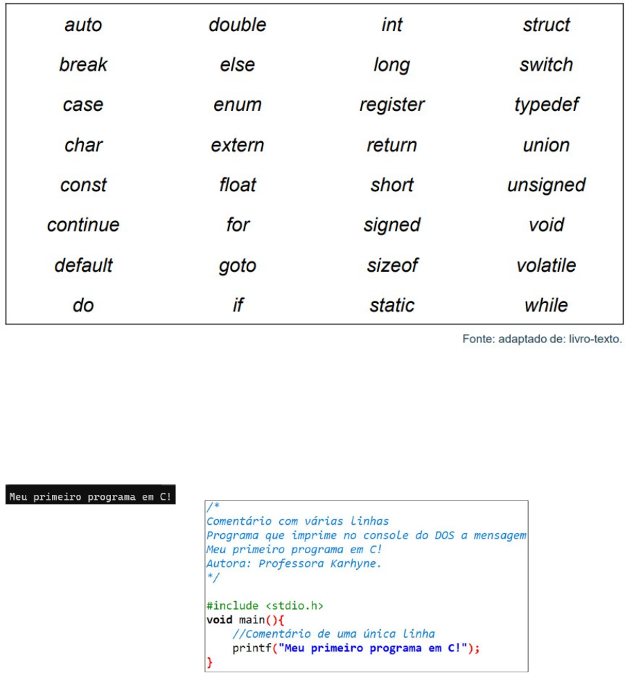 LINGUAGEM E TÉCNICAS DE PROGRAMAÇÃO Unidade II Bloco I ⚬ Linguagem C A linguagem de programação C foi criada em 1972 por Dennis Ritchie nos Laboratórios Bell e no AT&T para desenvolver o sistema operacional Unix. C é uma linguagem geral, estruturada e compilada, reconhecida pela ISO. Ela se destaca pela flexibilidade, portabilidade e eficiência, sendo usada para desenvolver diversas aplicações, por exemplo: jogos eletrônicos, sistemas de controle de satélites, sistemas operacionais, como o Unix e o Linux. Vantagem: Programas em C podem rodar em várias plataformas sem grandes alterações, oferecendo rapidez e economia de memória. Regras da Linguagem C Todo texto delimitado por /* e */ é considerado como comentário, podendo ter uma ou várias linhas. O comando // serve como comentário de apenas uma linha. A diretiva #include causa a inclusão de arquivos de cabeçalho contendo declarações necessárias à compilação, exemplo: #include O comando include inclui o arquivo-cabeçalho stdio.h, onde há uma série de funções de entrada e saída de dados, por exemplo printf() e scanf(). As chaves { e } servem para delimitar um bloco de instruções, ou seja, início e fim do bloco. Importante destacar também que C é sensível a maiúsculas e minúsculas, ou seja, as letras maiúsculas diferem das minúsculas (case sensitive). Aluno é diferente (≠) de aluno As variáveis devem ser declaradas antes de serem usadas, logo no início do bloco. A sintaxe em C é muito rígida (regras detalhadas). Tipos: Propriedade dos dados (obrigatório para declarar o tipo da variável). Declarações: Definem o identificador, para alocar memória, definir conteúdo inicial e determinar funções. Expressões: Fórmulas que atribuem e alteram valores. Funções: São sub-rotinas ou subprogramas que executam tarefas específicas em C. Há funções básicas que estão definidas nas bibliotecas-padrão da linguagem e outras que são desenvolvidas por terceiros, com rotinas específicas. Exemplos de Funções: main(): Função principal onde a execução do programa começa. printf(): Função usada para imprimir texto e valores na saída-padrão. scanf(): Função usada para ler os dados a partir do teclado. Os parênteses após o nome de uma função, como em main(), são obrigatórios. A primeira função que o programa executa é o main(), portanto é obrigatória a sua declaração no programa principal. Regras da Linguagem C: Comandos de Entrada e Saída A linguagem C utiliza os comandos de entrada e saída por meio de funções, por exemplo: através da biblioteca-padrão stdio.h (Standard Input Output). A inclusão é inserida no início do programa por meio da instrução: #include Função que executa a visualização de informações na tela printf() printf(“ formato ” , lista de variáveis/expressões); Função que permite a entrada de dados pelo teclado scanf() scanf(“ formato ”, &variável); Palavras Reservadas pelo Padrão Ansi A tabela abaixo lista palavras-chave reservadas pela linguagem C. As palavras-chave não podem ser abreviadas, usadas como nomes de variáveis ou usadas como identificadores. Conforme o compilador, poderão existir mais palavras-chave Estrutura de um Programa em C void main(): Define o nome da função main. Todo programa em C precisa ter essa função, pois essa é premissa de funcionamento e é a função que o programa executa ao ser inicializado. A palavra void indica que a função não retorna valor. Ao executar o programa, teremos uma mensagem no console do DOS dizendo: Bloco II Tipos Primitivos de Dados Tipos primitivos de dados: em C temos os seguintes tipos básicos de variáveis: lógico: A linguagem C trata como verdadeiro (true) o valor inteiro 1 e como falso (false) o valor inteiro 0. char: Guarda um caractere ou uma cadeia de caracteres, declarando um vetor de char[]; int: Guarda um número inteiro; float: Guarda um número real, ou seja, valores com ponto e vírgula, com determinada precisão; double: Guarda um número real com precisão maior que o tipo float; void: Tipo vazio. A dimensão do float é de 4 bytes (precisão simples) e a do double é de 8 bytes (precisão dupla). Tipos de Informações, Variáveis e Constantes Para declarar uma constante, acrescenta-se a palavra-chave const no início e atribui-se um valor a ela. Sintaxe para declaração de constante: const = valor; Exemplo: const float pi = 3.14159; A linguagem C permite também atribuir valor no momento da declaração da variável, assim como declarar muitas variáveis do mesmo tipo na mesma linha, ou realizar ambas as ações. Para declarar uma variável, temos a seguinte sintaxe: ; Exemplo: int a; /* declara uma variável do tipo int */ float a; /* declara uma variável do tipo float */ int a = 5; // declara e armazena o valor 5 em a int a, b, c; // declara várias variáveis do tipo int int a, b = 6, c; /* declara várias variáveis do tipo int atribuindo valor a uma ou a todas as variáveis*/ Declaração de variáveis: Exemplo de um Programa em C Os códigos dos exemplos foram feitos e compilados na ferramenta codeblocks. Link do manual de instalação: https://wiki.codeblocks.org/index.php/Installing_a_supported_compiler Link para baixar: https://www.codeblocks.org/downloads/ Exemplo: Neste exemplo, temos um algoritmo que imprime uma mensagem para o usuário, pedindo para digitar seu primeiro nome, em seguida imprime o nome digitado. O uso da ferramenta será mostrado e explicado na aula prática de laboratório. Bloco III Código de Barra Invertida A linguagem C possui algumas constantes para facilitar a exibição de resultados na tela, a manipulação de cadeias ou a impressão. São caracteres que podem ser usados como quaisquer outros. Ao lado temos uma tabela com os códigos de barra invertida. Operadores Matemáticos Em C temos diversos operadores matemáticos. A tabela acima mostra os operadores com exemplos. Sintaxes Específicas A linguagem 