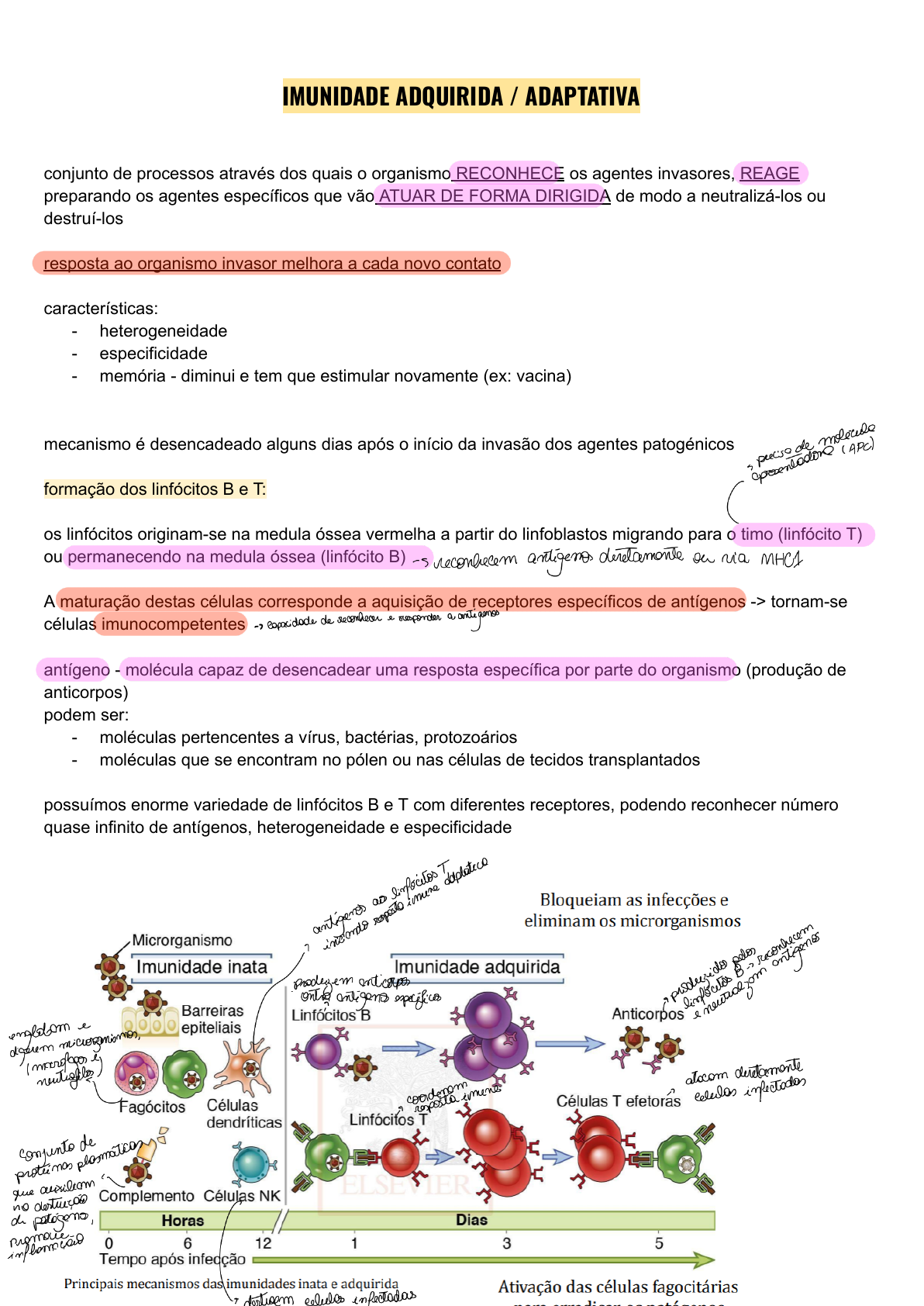 IMUNIDADE ADQUIRIDA / ADAPTATIVA conjunto de processos através dos quais o organismo RECONHECE os agentes invasores, REAGE preparando os agentes específicos que vão ATUAR DE FORMA DIRIGIDA de modo a neutralizá-los ou destruí-los resposta ao organismo invasor melhora a cada novo contato características: - heterogeneidade - especificidade - memória - diminui e tem que estimular novamente (ex: vacina) mecanismo é desencadeado alguns dias após o início da invasão dos agentes patogénicos formação dos linfócitos B e T: os linfócitos originam-se na medula óssea vermelha a partir do linfoblastos migrando para o timo (linfócito T) ou permanecendo na medula óssea (linfócito B) A maturação destas células corresponde a aquisição de receptores específicos de antígenos -> tornam-se células imunocompetentes antígeno - molécula capaz de desencadear uma resposta específica por parte do organismo (produção de anticorpos) podem ser: - moléculas pertencentes a vírus, bactérias, protozoários - moléculas que se encontram no pólen ou nas células de tecidos transplantados possuímos enorme variedade de linfócitos B e T com diferentes receptores, podendo reconhecer número quase infinito de antígenos, heterogeneidade e especificidade Epitopos: determinante antigênico - pequenas moléculas ou porções de ag que desencadeia RI Imunidade adquirida requer diferenciação de linfócitos em resposta a microrganismos antes que ela possa oferecer uma defesa eficaz pode ser induzida em um indivíduo pela infecção ou pela vacinação (imunidade ativa) ou conferida a um indivíduo pela transferência de AC (imunidade passiva) imunização ativa - provoca imunidade protetora e memória imunológica - exposição subsequente provoca resposta imune aumentada capaz de eliminar o patógeno ou prevenir a doença - infecção natural ou adquirida artificialmente por meio de vacinas imunização passiva - proteção transitória - AC pré formados são transferidos para um receptor ● naturalmente: ac materno contra difteria, tétano, estreptococos, rubéola, sarampo e poliovírus protegem o feto em desenvolvimento e, após o nascimento, ac no colostro e leite Imunidade humoral: mediada por anticorpos produzidos pelos linfócitos B (plasmócitos) principal função: impedir que patógenos presentes na circulação tenham acesso e colonizam as células e os tecidos do hospedeiro Imunidade celular: defesa contra os microrganismos intracelulares, é mediada pelos linfócitos T Propriedades da resposta adquirida expansão clonal: aumenta rapidamente o número de células específicas para determinado AG, garantindo o acompanhamento da proliferação dos microrganismos CD4+ ativa LB que se ligou a ag atividade - imunidade humoral 1- selecção clonal 2- proliferação clonal dos linfócitos ativados 3- diferenciação dos linfócitos B Memória imunológica otimiza a habilidade do SI para combater infecções persistentes e recorrentes, porque cada encontro com o mesmo ag ativa as células de memória existentes e gera mais células de memória *prova a célula T citotóxica reconhece o complexo do peptídeo viral com o MHC de classe I e mata a célula infectada Homeostase: todas as respostas imunológicas diminuem à medida que a infecção é eliminada, permitindo que o sistema retorne a um estado de repouso e esteja preparado para responder a uma próxima infecção Tolerância imunológica: capacidade do SI de coexistir com moléculas, células e tecidos próprios do hospedeiro (autoantígenos) Fases da resposta adquirida janela imunológica: definida como período entre a infecção e o ínicio da formação de anticorpos específicos contra o agente causador *exames negativos de uma pessoa já contaminada, mas em período de janela imunológica, são conhecidos por falsos negativos Células do sistema imunológico adaptativo: linfócito B: mediadores da imunidade humoral linfócito T: mediadores da imunidade mediada por célula células NK: células da imunidade inata *reconhecimento específico de antígenos células apresentadoras de antígenos: - células dendríticas: iniciação da resposta de células T - macrófagos: fase efetora da imunidade mediada por célula - células dendríticas foliculares: exposição dos antígenos aos linfócitos B na resposta imunológica humoral células efetoras: - linfócitos T: células T auxiliares e linfócitos T citotóxicos - macrófagos e monócitos: células do sistema fagocitico monoclear - granulócitos: neutrófilos, eosinófilos Células do sistema imunológico adaptativo linfócitos: todos os linfócitos se originam de células-tronco da medula óssea -> linhagem linfóide, as demais células brancas são originadas da linhagem mielóide linfócitos maduros: as diversas classes de linfócitos reconhecem tipos distintos de antígenos, diferenciando-se em células efetoras, cuja função é eliminar e os antígenos - cluster of differentiation (CD): proteína de superfície responsável pela diferenciação dos linfócitos durante o processo de maturação os linfócitos têm também capacidade de adquirir a capacidade de distinguir o que é próprio do que é estranho ao organismo - cada indivíduo é bioquimicamente único - a individualidade é definida pela presença na superfície das células de macromoléculas únicas - os marcadores celulares - os marcadores do próprio são designados antígenos principais de histocompatibilidade *moléculas constituem o complexo principal de histocompatibilidade (MHC) Classes de MHC - molécula do MHC de classe I apresentam peptídeos as células TCD8+ (linfocito T citotóxico) - molécula do MHC de classe II apresentam peptídeos as células TCD4+ (linfocito T auxiliar) Reconhecimento de antígenos resposta timo independente: - linfócitos B: reconhecem diretamente o ag -> produção de linfócitos específicos resposta timo dependente: - linfócitos T: necessitam das APCs (células dendría