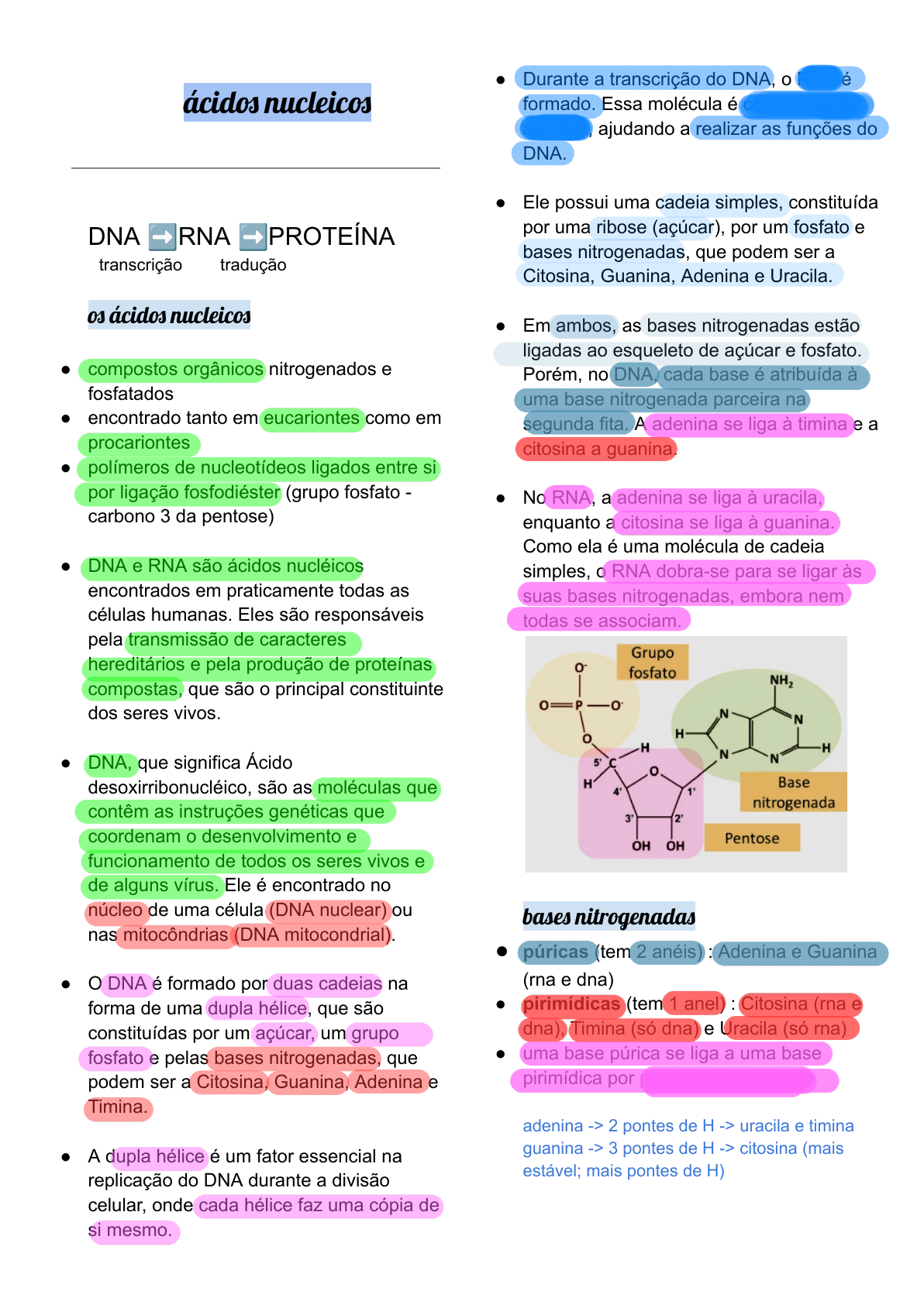 ácid� nucleic� DNA➡RNA➡PROTEÍNA transcrição tradução � ácid� nucleic� ● compostos orgânicos nitrogenados e fosfatados ● encontrado tanto em eucariontes como em procariontes ● polímeros de nucleotídeos ligados entre si por ligação fosfodiéster (grupo fosfato - carbono 3 da pentose) ● DNA e RNA são ácidos nucléicos encontrados em praticamente todas as células humanas. Eles são responsáveis pela transmissão de caracteres hereditários e pela produção de proteínas compostas, que são o principal constituinte dos seres vivos. ● DNA, que significa Ácido desoxirribonucléico, são as moléculas que contêm as instruções genéticas que coordenam o desenvolvimento e funcionamento de todos os seres vivos e de alguns vírus. Ele é encontrado no núcleo de uma célula (DNA nuclear) ou nas mitocôndrias (DNA mitocondrial). ● O DNA é formado por duas cadeias na forma de uma dupla hélice, que são constituídas por um açúcar, um grupo fosfato e pelas bases nitrogenadas, que podem ser a Citosina, Guanina, Adenina e Timina. ● A dupla hélice é um fator essencial na replicação do DNA durante a divisão celular, onde cada hélice faz uma cópia de si mesmo. ● Durante a transcrição do DNA, o RNA é formado. Essa molécula é complementar ao DNA, ajudando a realizar as funções do DNA. ● Ele possui uma cadeia simples, constituída por uma ribose (açúcar), por um fosfato e bases nitrogenadas, que podem ser a Citosina, Guanina, Adenina e Uracila. ● Em ambos, as bases nitrogenadas estão ligadas ao esqueleto de açúcar e fosfato. Porém, no DNA, cada base é atribuída à uma base nitrogenada parceira na segunda fita. A adenina se liga à timina e a citosina a guanina. ● No RNA, a adenina se liga à uracila, enquanto a citosina se liga à guanina. Como ela é uma molécula de cadeia simples, o RNA dobra-se para se ligar às suas bases nitrogenadas, embora nem todas se associam. base� nitrogenada� ● púricas (tem 2 anéis) : Adenina e Guanina (rna e dna) ● pirimídicas (tem 1 anel) : Citosina (rna e dna), Timina (só dna) e Uracila (só rna) ● uma base púrica se liga a uma base pirimídica por pontes de hidrogênio adenina -> 2 pontes de H -> uracila e timina guanina -> 3 pontes de H -> citosina (mais estável; mais pontes de H) ribose: RNA desoxirribose: DNA nucleotíde� ● unidades formadoras do DNA e RNA ● contém: 1 fosfato (grupo fosfato não muda) + 1 açúcar + base nitrogenada (púricas ou pirimídicas) nucle�íde� ● não possuem fosfato ● não forma a ligação fosfodiéster ● para o processo de polimerização ● mecanismo de alguns quimioterápicos base� nitrogenada� púrica� ● as mais comuns são a adenina (A) e a guanina (G) ● se ligam a um açúcar de 5 carbonos (uma pentose) por meio do átomo N9 pirimídica� ● as mais comuns são a timina (T), a citosina (C) e a uracila (U) ● se ligam a um açúcar de 5 carbonos (uma pentose) por meio do átomo N1 dic�: macete para não esquecer quais as bases nitrogenadas púricas A G U A PURA (púrica) adenina guanina regr� d� Chargaff: ● adenina deve parear com timina ● guanina deve parear com citosina ligaçã� f�fodiéster: une nucleotídeos da mesma fita ponte� d� hidrogêni�: une nucleotídeos de fitas diferentes 5’ = 5° carbono fora do anel 3’ = 3° carbono fora do anel ● a adição de um novo nucleotídeos é feita sempre no 3’ ● disposição antiparalela dos carbonos ● base púrica se liga com primídica ● bases nitrogenadas unem as fitas ● a adição de nucleotídeos segue a direção 5’ - 3’ ● quantidade de T é igual a quantidade de A ● a quantidade de G é igual a quantidade de C RNA tip� d� RNA RNA MENSAGEIRO (mRNA) Contém a informação genética para a sequência de aminoácidos de peptídeos e proteínas. É o responsável por levar as informações do DNA do núcleo até o citoplasma, onde a proteína será produzida. Como o RNA é uma cópia fiel de uma das fitas de DNA, é a partir dessa informação que o RNA mensageiro irá determinar quais são os aminoácidos necessários para a formação de determinada proteína, pois ele possui as trincas (códon) de bases nitrogenadas que definem cada aminoácido. ● mRNA maduro não possui íntrons - Sequência de nucleotídeos no DNA que não aparece no RNA mensageiro. RNA TRANSPORTADOR (tRNA) Identifica e transporta os aminoácidos até o ribossomo que serão utilizados na formação das proteínas, onde haverá de fato a síntese das proteínas. ● Estrutura secundária com grampos e alças formando um trevo. ● Alto número de bases modificadas depois da sua transcrição. RNA RIBOSSÔMICO (rRNA) Faz parte da constituição dos ribossomos, é nos ribossomos que a sequência de bases do RNA mensageiro é interpretada e a proteína, de fato, sintetizada. RNA NUCLEAR PEQUENO (snRNA) Combinam - se com diversas proteínas para formar ribonucleoproteínas que atuam no processo de splicing. - O splicing é um tipo de processamento de RNA no qual as sequências denominadas introns são removidas, enquanto as sequências remanescentes (exons) são unidas formando um RNA maduro, que pode ser mensageiro ou não- codificante. RNA INTERFERENTE (iRNA) ● Pequenas sequências de RNA fita dupla produzidas no núcleo que interferem na tradução protéica. ● Após ligarem a proteínas, o iRNA associa -se a um mRNA específico, inibindo a sua tradução ou ativando a sua destruição. códon: região composta por 3 nucleotídeos - codifica um aminoácido de uma proteína anticódon: região complementar de 3 nucleotídeos do tRNA. Durante a síntese de proteína pareia com um códon complementar do mRNA. éxons: segmentos codificantes de genes que determinam a sequência de aa na proteína. íntons: regiões não codificantes, presentes no pré-RNA, mas não no RNAm, visto que são removidas. RNA só libera aminoácidos se o anticódon for co
