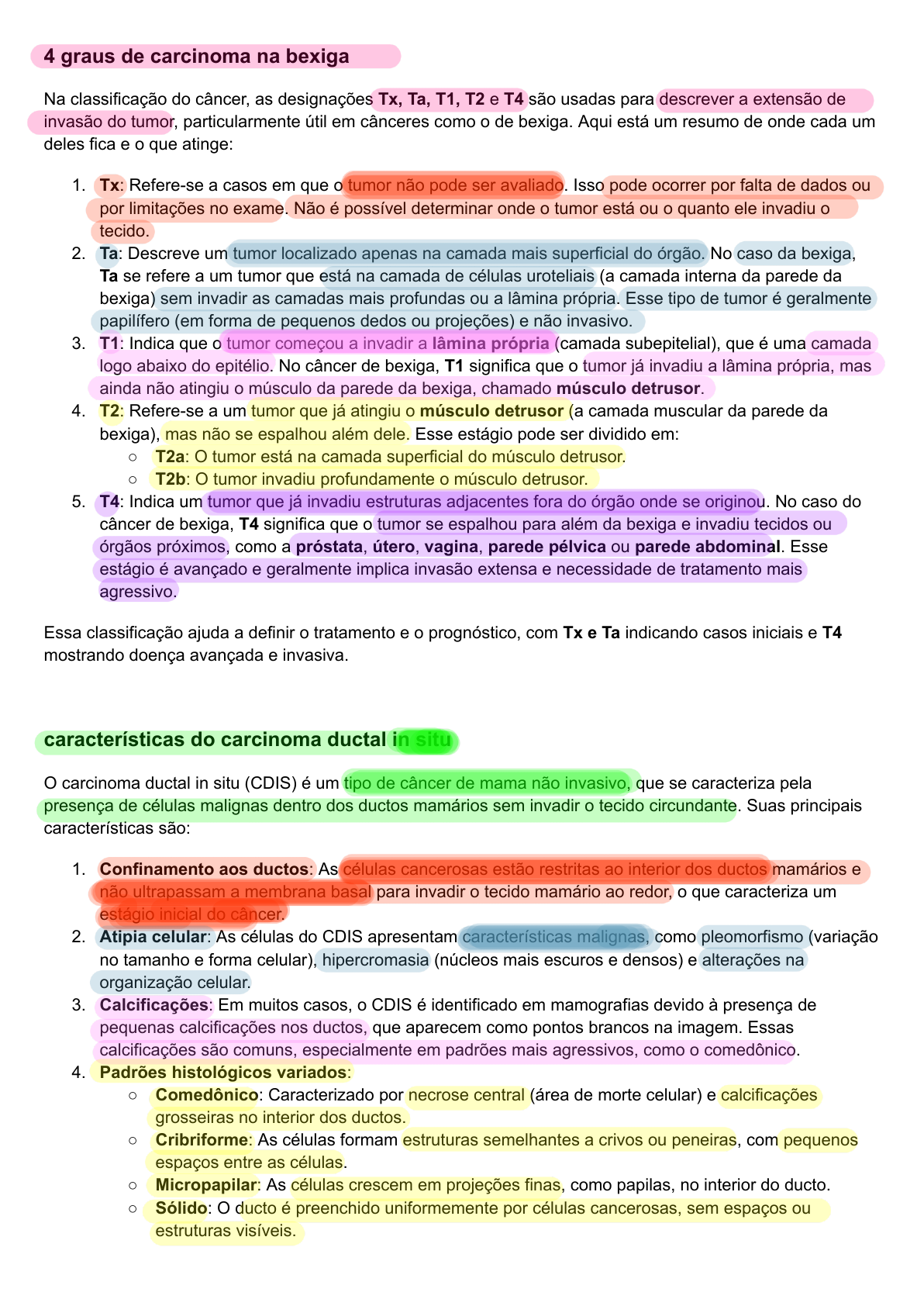 4 graus de carcinoma na bexiga Na classificação do câncer, as designações Tx, Ta, T1, T2 e T4 são usadas para descrever a extensão de invasão do tumor, particularmente útil em cânceres como o de bexiga. Aqui está um resumo de onde cada um deles fica e o que atinge: 1. Tx: Refere-se a casos em que o tumor não pode ser avaliado. Isso pode ocorrer por falta de dados ou por limitações no exame. Não é possível determinar onde o tumor está ou o quanto ele invadiu o tecido. 2. Ta: Descreve um tumor localizado apenas na camada mais superficial do órgão. No caso da bexiga, Ta se refere a um tumor que está na camada de células uroteliais (a camada interna da parede da bexiga) sem invadir as camadas mais profundas ou a lâmina própria. Esse tipo de tumor é geralmente papilífero (em forma de pequenos dedos ou projeções) e não invasivo. 3. T1: Indica que o tumor começou a invadir a lâmina própria (camada subepitelial), que é uma camada logo abaixo do epitélio. No câncer de bexiga, T1 significa que o tumor já invadiu a lâmina própria, mas ainda não atingiu o músculo da parede da bexiga, chamado músculo detrusor. 4. T2: Refere-se a um tumor que já atingiu o músculo detrusor (a camada muscular da parede da bexiga), mas não se espalhou além dele. Esse estágio pode ser dividido em: ○ T2a: O tumor está na camada superficial do músculo detrusor. ○ T2b: O tumor invadiu profundamente o músculo detrusor. 5. T4: Indica um tumor que já invadiu estruturas adjacentes fora do órgão onde se originou. No caso do câncer de bexiga, T4 significa que o tumor se espalhou para além da bexiga e invadiu tecidos ou órgãos próximos, como a próstata, útero, vagina, parede pélvica ou parede abdominal. Esse estágio é avançado e geralmente implica invasão extensa e necessidade de tratamento mais agressivo. Essa classificação ajuda a definir o tratamento e o prognóstico, com Tx e Ta indicando casos iniciais e T4 mostrando doença avançada e invasiva. características do carcinoma ductal in situ O carcinoma ductal in situ (CDIS) é um tipo de câncer de mama não invasivo, que se caracteriza pela presença de células malignas dentro dos ductos mamários sem invadir o tecido circundante. Suas principais características são: 1. Confinamento aos ductos: As células cancerosas estão restritas ao interior dos ductos mamários e não ultrapassam a membrana basal para invadir o tecido mamário ao redor, o que caracteriza um estágio inicial do câncer. 2. Atipia celular: As células do CDIS apresentam características malignas, como pleomorfismo (variação no tamanho e forma celular), hipercromasia (núcleos mais escuros e densos) e alterações na organização celular. 3. Calcificações: Em muitos casos, o CDIS é identificado em mamografias devido à presença de pequenas calcificações nos ductos, que aparecem como pontos brancos na imagem. Essas calcificações são comuns, especialmente em padrões mais agressivos, como o comedônico. 4. Padrões histológicos variados: ○ Comedônico: Caracterizado por necrose central (área de morte celular) e calcificações grosseiras no interior dos ductos. ○ Cribriforme: As células formam estruturas semelhantes a crivos ou peneiras, com pequenos espaços entre as células. ○ Micropapilar: As células crescem em projeções finas, como papilas, no interior do ducto. ○ Sólido: O ducto é preenchido uniformemente por células cancerosas, sem espaços ou estruturas visíveis. 5. Classificação por grau: ○ Grau baixo: Células com menor grau de atipia e crescimento mais lento, com menor risco de progressão. ○ Grau intermediário: Alterações celulares mais pronunciadas que indicam uma atividade moderada. ○ Grau alto: Células altamente atípicas, associadas a um risco maior de evolução para carcinoma invasivo se não tratadas. 6. Risco de progressão: Embora seja um câncer não invasivo, o CDIS pode evoluir para um carcinoma invasivo se não tratado, especialmente nos casos de alto grau. O diagnóstico precoce do CDIS permite tratar o tumor antes que ele se torne invasivo, o que geralmente leva a um excelente prognóstico para o paciente. alterações celulares de carcinoma na bexiga No carcinoma de bexiga, especialmente no carcinoma urotelial (o tipo mais comum), são observadas várias alterações celulares que ajudam no diagnóstico e refletem o comportamento maligno do tumor. As principais alterações celulares encontradas são: 1. Pleomorfismo celular: As células apresentam variações no tamanho e na forma, o que indica perda de controle sobre o crescimento e a diferenciação celular, características típicas das células malignas. 2. Hipercromasia nuclear: Os núcleos das células cancerosas são mais escuros e densos devido ao aumento do conteúdo de DNA, uma alteração comum em células malignas. 3. Aumento do núcleo-citoplasma: As células apresentam núcleos grandes em relação ao citoplasma, evidenciando a desorganização estrutural e a rápida divisão celular. 4. Cromatina irregular: A cromatina nuclear é grosseira, irregular e densa, refletindo mutações e anormalidades genéticas nas células tumorais. 5. Nucléolos proeminentes: Nucléolos aumentados e bem visíveis indicam uma maior atividade celular, já que os nucléolos estão envolvidos na síntese de proteínas e no crescimento celular. 6. Alterações na arquitetura celular: As células do carcinoma urotelial tendem a perder a organização normal e a coesão entre as células, formando agregados irregulares ou desorganizados. 7. Presença de mitoses atípicas: Há um aumento nas divisões celulares, muitas vezes com mitoses anormais ou atípicas, indicando uma proliferação celular acelerada e descontrolada. 8. Necrose: Nos carcinomas de alto grau, pode-se observar áreas de necrose (morte celular) dentro do tumor, um achado especialmente frequente em padrões agressivos como o carcinoma urotelial comedônico. Essas