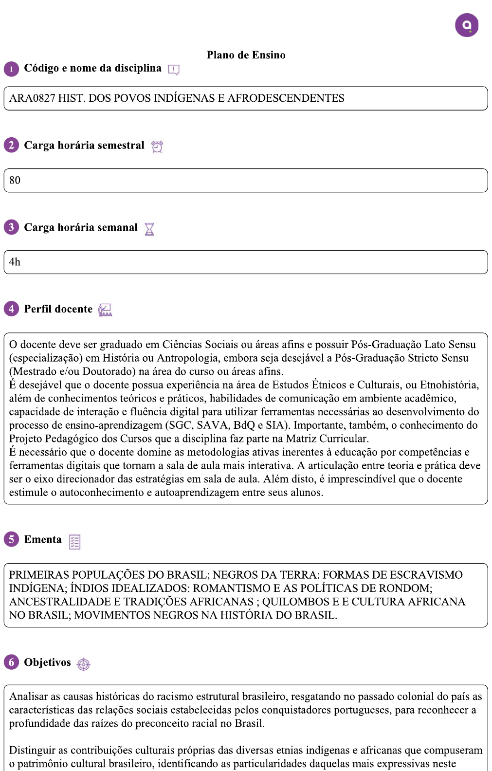 Plano de Ensino 1 Código e nome da disciplina ARA0827 HIST. DOS POVOS INDÍGENAS E 2 Carga horária semestral 80 3 Carga horária semanal 4h 4 Perfil docente O docente deve ser graduado em Ciências Sociais ou áreas afins e possuir Pós-Graduação Lato Sensu (especialização) em História ou Antropologia, embora seja desejável a Pós-Graduação Stricto Sensu (Mestrado e/ou Doutorado) na área do curso ou áreas afins. É desejável que o docente possua experiência na área de Estudos Étnicos e Culturais, ou Etnohistória, além de conhecimentos teóricos e práticos, habilidades de comunicação em ambiente acadêmico, capacidade de interação e fluência digital para utilizar ferramentas necessárias ao desenvolvimento do processo de ensino-aprendizagem (SGC, SAVA, BdQ e SIA). Importante, também, o conhecimento do Projeto Pedagógico dos Cursos que a disciplina faz parte na Matriz Curricular. É necessário que o docente domine as metodologias ativas inerentes à educação por competências e ferramentas digitais que tornam a sala de aula mais interativa. A articulação entre teoria e prática deve ser o eixo direcionador das estratégias em sala de aula. Além disto, é imprescindível que o docente estimule o autoconhecimento e autoaprendizagem entre seus alunos. 5 Ementa PRIMEIRAS POPULAÇÕES DO BRASIL; NEGROS DA TERRA: FORMAS DE ESCRAVISMO INDÍGENA; ÍNDIOS IDEALIZADOS: ROMANTISMO E AS POLÍTICAS DE RONDOM; ANCESTRALIDADE E TRADIÇÕES AFRICANAS ; QUILOMBOS E E CULTURA AFRICANA NO BRASIL; MOVIMENTOS NEGROS NA HISTÓRIA DO BRASIL. 6 Objetivos Analisar as causas históricas do racismo estrutural brasileiro, resgatando no passado colonial do país as características das relações sociais estabelecidas pelos conquistadores portugueses, para reconhecer a profundidade das raízes do preconceito racial no Brasil. Distinguir as contribuições culturais próprias das diversas etnias indígenas e africanas que compuseram o patrimônio cultural brasileiro, identificando as particularidades daquelas mais expressivas nesteprocesso, para reconhecer a essência sincrética da cultura brasileira. Criticar as políticas higienistas adotadas por sucessivos governos brasileiros ao longo de décadas dos séculos XIX e XX, debatendo as teses pretensamente científicas que as sustentavam, para identificar a permanência do preconceito racial no Brasil pós-independência. Discutir sobre as condições atuais de vida das populações afro-brasileiras relativamente ao mercado de trabalho e aos serviços educacionais, relacionando aos programas compensatórios a exemplo do sistema de cotas, para verificar o grau de efetividade da inclusão social no Brasil. 7 Procedimentos de ensino-aprendizagem Aulas interativas em ambiente virtual de aprendizagem, didaticamente planejadas para o desenvolvimento de competências, tornando o processo de aprendizado mais significativo para os alunos. Na sala de aula virtual, a metodologia de ensino contempla diversas estratégias capazes de alcançar os objetivos da disciplina. Os temas das aulas são discutidos e apresentados em diversos formatos como leitura de textos, vídeos, hipertextos, links orientados para pesquisa, estudos de caso, podcasts, atividades animadas de aplicação do conhecimento, simuladores virtuais, quiz interativo, simulados, biblioteca virtual e Explore + para que o aluno possa explorar conteúdos complementares e aprofundar seu conhecimento sobre as temáticas propostas. 8 Temas de aprendizagem 1. PRIMEIRAS POPULAÇÕES DO BRASIL 1.1 MIGRAÇÕES 1.2 EXPANSÃO TUPI 1.3 TAPUIAS 2. NEGROS DA TERRA: FORMAS DE ESCRAVISMO INDÍGENA 2.1 O NOVO MUNDO COM VELHOS HABITANTES 2.2 NEGROS DA TERRA: FORMAS DO ESCRAVISMO INDÍGENA 2.3 GUERRAS CONTRA A CONQUISTA 3. ÍNDIOS IDEALIZADOS: ROMANTISMO E AS POLÍTICAS DE RONDOM 3.1 A QUESTÃO INDÍGENA NO BRASIL: DISPUTA DOS DISCURSOS 3.2 AS FORÇAS ARMADAS E A QUESTÃO DO INDIGENISMO 3.3 A DECOLONIALIDADE DO DEBATE 4. ANCESTRALIDADE E TRADIÇÕES AFRICANAS 4.1 PARA UMA ANTROPOLOGIA DA ANCESTRALIDADE 4.2 RECUPERANDO HISTÓRIAS E TRADIÇÕES 5. QUILOMBOS E E CULTURA AFRICANA NO BRASIL 5.1 A ESCRAVIZAÇÃO DE AFRICANOS NO BRASIL 5.2 OS AFRICANOS E A RESISTÊNCIA À ESCRAVIZAÇÃO 5.3 OS AFRICANOS LIVRES NO IMPÉRIO 5.4 O PÓS-ABOLIÇÃO E A RESISTÊNCIA DA CULTURA AFRICANA 6. MOVIMENTOS NEGROS NA HISTÓRIA DO BRASIL 6.1 O CONCEITO DE RAÇA E O RACISMO NO BRASIL 6.2 AS AÇÕES DOS MOVIMENTOS NEGROS (1930-1970) 6.3 O MOVIMENTO NEGRO UNIFICADO AÇÕES E SUJEITOS 6.4 O SÉCULO XXI - NOVAS E ANTIGAS QUESTÕES7. DIVERSIDADE E INCLUSÃO 7.1 PENSANDO O MUNDO E ENTENDENDO OS DESAFIOS 9 Procedimentos de avaliação Os procedimentos de avaliação contemplarão as competências desenvolvidas durante a disciplina por meio de provas presenciais, denominadas AV e AVS, sendo a cada uma delas atribuído o grau de 0,0 (zero) a 10 (dez) no formato PNI Prova Nacional Integrada. Caso o aluno não atinja o resultado desejado na prova de AV, ele poderá recuperar sua nota na prova de AVS. Será composta por uma prova no formato PNI Prova Nacional Integrada, com total de 10 pontos, e substituirá a nota da AV, caso seja maior. Para aprovação na disciplina, o aluno deverá, ainda: atingir nota igual ou superior a 6 (seis) na prova de AV ou AVS; frequentar, no mínimo, 75% das aulas ministradas. 10 Bibliografia básica MARCHIORO, Márcio. A questão indígena no Brasil: uma questão histórica. 1.a. Curitiba: InterSaberes, 2018. Disponível em: https://plataforma.bvirtual.com.br/Leitor/Loader/158941/pdf MELO, Elizabete & BRAGA, Luciano. História da África e Afro-brasileira: em busca das nossas origens. 1a.. São Paulo:: Selo Negro, 2010. Disponível em: https://plataforma.bvirtual.com.br/Acervo/Publicacao/3695 RIBEIRO, Darcy Editora Global, 2017. Os índios e a civilização: a integração das populações indígenas no Brasil 1a. edição eletrônica. São Paulo: Editora Global, 2017. Disponível em: 11 Bibliografia compleme