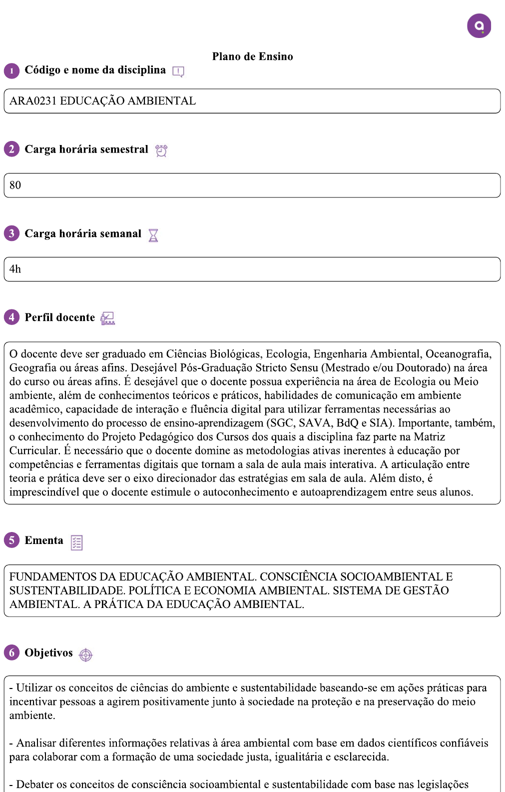 Plano de Ensino 1 Código e nome da disciplina ARA0231 EDUCAÇÃO AMBIENTAL 2 Carga horária semestral 80 3 Carga horária semanal 4h 4 Perfil docente O docente deve ser graduado em Ciências Biológicas, Ecologia, Engenharia Ambiental, Oceanografia, Geografia ou áreas afins. Desejável Pós-Graduação Stricto Sensu (Mestrado e/ou Doutorado) na área do curso ou áreas afins. É desejável que o docente possua experiência na área de Ecologia ou Meio ambiente, além de conhecimentos teóricos e práticos, habilidades de comunicação em ambiente acadêmico, capacidade de interação e fluência digital para utilizar ferramentas necessárias ao desenvolvimento do processo de ensino-aprendizagem (SGC, SAVA, BdQ e SIA). Importante, também, o conhecimento do Projeto Pedagógico dos Cursos dos quais a disciplina faz parte na Matriz Curricular. É necessário que o docente domine as metodologias ativas inerentes à educação por competências e ferramentas digitais que tornam a sala de aula mais interativa. A articulação entre teoria e prática deve ser o eixo direcionador das estratégias em sala de aula. Além disto, é imprescindível que o docente estimule o autoconhecimento e autoaprendizagem entre seus alunos. 5 Ementa FUNDAMENTOS DA EDUCAÇÃO CONSCIÊNCIA SOCIOAMBIENTAL E POLÍTICA E ECONOMIA AMBIENTAL. SISTEMA DE GESTÃO AMBIENTAL. A PRÁTICA DA EDUCAÇÃO AMBIENTAL. 6 Objetivos Utilizar os conceitos de ciências do ambiente e sustentabilidade baseando-se em ações práticas para incentivar pessoas a agirem positivamente junto à sociedade na proteção e na preservação do meio ambiente. Analisar diferentes informações relativas à área ambiental com base em dados científicos confiáveis para colaborar com a formação de uma sociedade justa, igualitária e esclarecida. Debater os conceitos de consciência socioambiental e sustentabilidade com base nas legislaçõesambientais para atuar de maneira colaborativa na proteção do planeta. Analisar as Diretrizes Curriculares Nacionais para a Educação Ambiental observando as orientações pertinentes para o exercício da cidadania ambiental no processo de ensino-aprendizagem. 7 Procedimentos de ensino-aprendizagem Aulas interativas em ambiente virtual de aprendizagem, didaticamente planejadas para o desenvolvimento de competências, tornando o processo de aprendizado mais significativo para os alunos. Na sala de aula virtual, a metodologia de ensino contempla diversas estratégias capazes de alcançar os objetivos da disciplina. Os temas das aulas são discutidos e apresentados em diversos formatos como leitura de textos, vídeos, hipertextos, links orientados para pesquisa, estudos de caso, podcasts, atividades animadas de aplicação do conhecimento, simuladores virtuais, quiz interativo, simulados, biblioteca virtual e Explore + para que o aluno possa explorar conteúdos complementares e aprofundar seu conhecimento sobre as temáticas propostas. 8 Temas de aprendizagem 1. FUNDAMENTOS DA EDUCAÇÃO AMBIENTAL 1.1 EDUCAÇÃO AMBIENTAL 1.2 AGENDA 21 1.3 POLÍTICA NACIONAL 2. CONSCIÊNCIA E SUSTENTABILIDADE 2.1 POLÍTICAS E DEFINIÇÕES DE CONSCIÊNCIA SOCIOAMBIENTAL E SUSTENTABILIDADE 2.2 LEGISLAÇÃO AMBIENTAL NO BRASIL 2.3 GESTÃO COMUNITÁRIA DO MEIO AMBIENTE 3. DCNS PARA A EDUCAÇÃO AMBIENTAL 3.1 CIDADANIA AMBIENTAL 3.2 EDUCAÇÃO AMBIENTAL 4. A PRÁTICA DA EDUCAÇÃO AMBIENTAL 4.1 A EDUCAÇÃO AMBIENTAL NO AMBIENTE URBANO 4.2 A EDUCAÇÃO AMBIENTAL NO AMBIENTE RURAL E EM POPULAÇÕES TRADICIONAIS 9 Procedimentos de avaliação Os procedimentos de avaliação contemplarão as competências desenvolvidas durante a disciplina por meio de provas presenciais, denominadas AV e AVS, sendo a cada uma delas atribuído o grau de 0,0 (zero) a 10 (dez) no formato PNI Prova Nacional Integrada. Caso o aluno não atinja o resultado desejado na prova de AV, ele poderá recuperar sua nota na prova de AVS. Será composta por uma prova no formato PNI Prova Nacional Integrada, com total de 10 pontos, e substituirá a nota da AV, caso seja maior. Para aprovação na disciplina, o aluno deverá, ainda: atingir nota igual ou superior a 6 (seis) na prova de AV ou AVS;frequentar, no mínimo, 75% das aulas ministradas. 10 Bibliografia básica INOTTI, Rafael. Educação Ambiental para Século XXI. Ed.. São Paulo: Blucher, 2016. Disponível em: LUZZI, Daniel. Educação e Meio Ambiente: Uma Relação Intrínseca. Barueri, SP: Manole, 2018. Disponível em: SATO, Michèle; CARVALHO, Isabel. Educação ambiental: pesquisa e desafios. 2. ed. Porto Alegre: Artmed, 2017. Disponível em: https://integrada.minhabiblioteca.com.br/books/9788536315294 11 Bibliografia complementar CARVALHO, Isabel Cristina de Moura. Educação Ambiental: A Formação do Dujeito Ecológico. São Paulo: Cortez Editora, 2017. Disponível em: https://integrada.minhabiblioteca.com.br/#/books/9788524926129 IBRAHIN, Francini Imene Dias. Educação Ambiental: Estudo dos Problemas, Ações e Instrumentos para o Desenvolvimento da Sociedade. São Paulo: Érica, 2014. Disponível em: https://integrada.minhabiblioteca.com.br/books/9788536521534 PHILIPPI JUNIOR, Arlindo PELICIONI, Maria Cecília Focesi. Educação Ambiental e Sustentabilidade. São Paulo: Manole, 2014. Disponível em: https://integrada.minhabiblioteca.com.br/#/books/9788520445020 ROSA, André Henrique; FRACETO, Leonardo Fernandes. Meio Ambiente e Sustentabilidade. São Paulo: Bookman, 2017. Disponível em: https://integrada.minhabiblioteca.com.br/#/books/9788540701977 RUSCHEINSKY, Aloisio. Educação Ambiental: Abordagens Múltiplas. São Paulo: Penso, 2019. Disponível em: https://integrada.minhabiblioteca.com.br/#/books/9788563899873