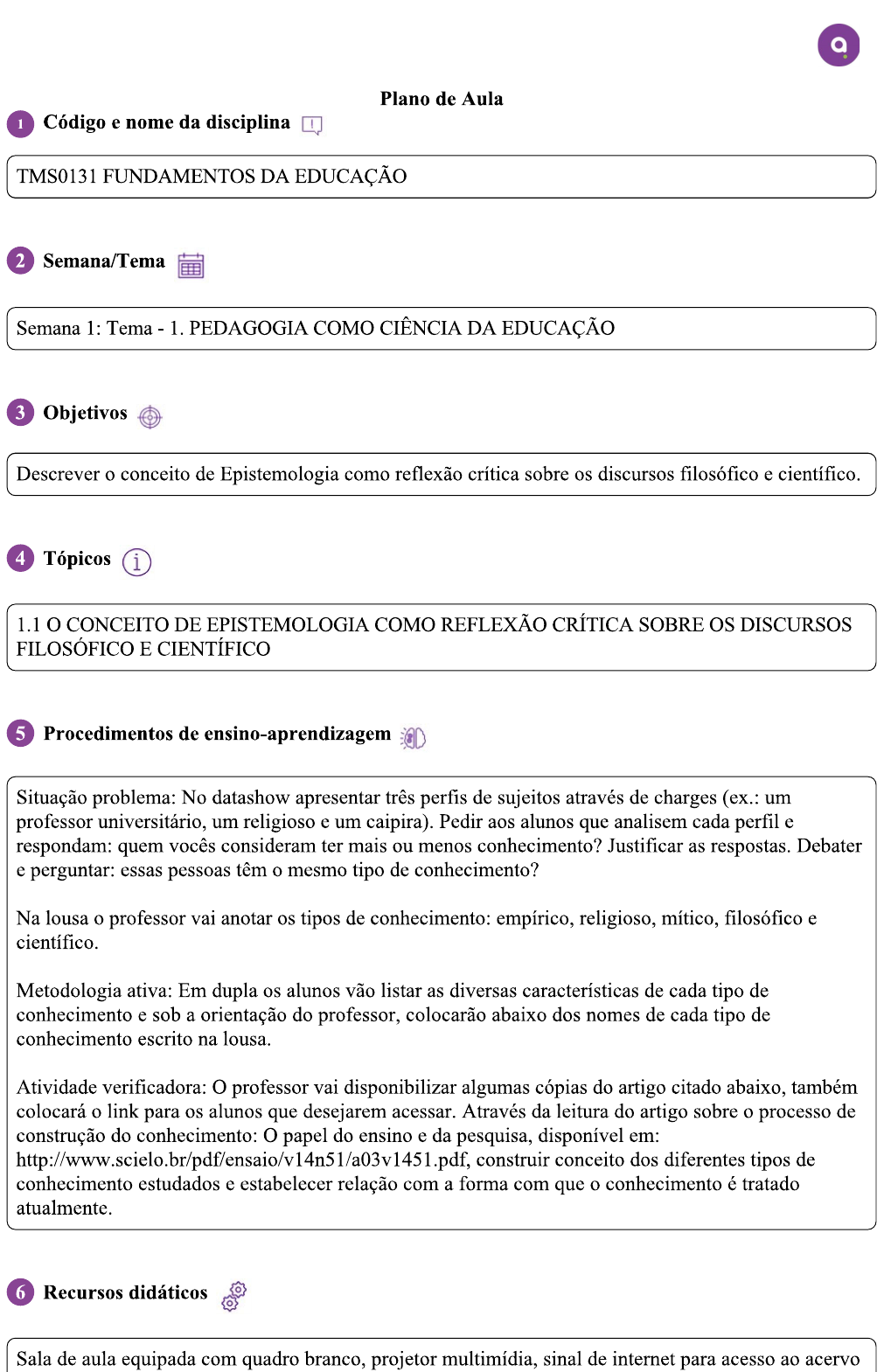 Plano de Aula 1 Código e nome da disciplina TMS0131 FUNDAMENTOS DA EDUCAÇÃO 2 Semana/Tema Semana 1: Tema 1. PEDAGOGIA COMO CIÊNCIA DA EDUCAÇÃO 3 Objetivos Descrever o conceito de Epistemologia como reflexão crítica sobre os discursos filosófico e científico. 4 Tópicos i 1.1 O CONCEITO DE EPISTEMOLOGIA COMO REFLEXÃO CRÍTICA SOBRE OS DISCURSOS FILOSÓFICO E CIENTÍFICO 5 Procedimentos de ensino-aprendizagem Situação problema: No datashow apresentar três perfis de sujeitos através de charges (ex.: um professor universitário, um religioso e um caipira). Pedir aos alunos que analisem cada perfil e respondam: quem vocês consideram ter mais ou menos conhecimento? Justificar as respostas. Debater e perguntar: essas pessoas têm o mesmo tipo de conhecimento? Na lousa o professor vai anotar os tipos de conhecimento: empírico, religioso, mítico, filosófico e científico. Metodologia ativa: Em dupla os alunos vão listar as diversas características de cada tipo de conhecimento e sob a orientação do professor, colocarão abaixo dos nomes de cada tipo de conhecimento escrito na lousa. Atividade verificadora: O professor vai disponibilizar algumas cópias do artigo citado abaixo, também colocará o link para os alunos que desejarem acessar. Através da leitura do artigo sobre o processo de construção do conhecimento: O papel do ensino e da pesquisa, disponível em: construir conceito dos diferentes tipos de conhecimento estudados e estabelecer relação com a forma com que o conhecimento é tratado atualmente. 6 Recursos didáticos Sala de aula equipada com quadro branco, projetor multimídia, sinal de internet para acesso ao acervobibliográfico no ambiente virtual 7 Leitura específica Recomenda-se leitura do texto: Leitura do Artigo: Artigo: Sobre o processo de construção do conhecimento: O papel do ensino e da pesquisa. Disponível em: http://www.scielo.br/pdf/ensaio/v14n51/a03v1451.pdf 8 Aprenda + Assista o vídeo: Tipos de conhecimento. O vídeo traz um resumo dos tipos de conhecimento tratados na aula e também suas características. Disponível em: aM Atividade Autônoma Aura Olá, seja bem vindo! Sabemos que você quer aprender mais, por isso, selecionamos duas questões que revisitam o tema/tópico ministrado nesta aula. Você deve resolvê-las, completando, assim, sua jornada de aprendizagem do dia. Questão 1 Dentre as inúmeras características que integram a produção do saber científico nas ciências humanas, quais podemos destacar? Alternativas: a) Arcabouço teórico-metodológico próprio, delimitação do objeto e da problemática de pesquisa, uso seletivo da documentação, diálogo com outras áreas do saber científico. b) Uso limitado da documentação, restrição interdisciplinar, inexistência de objeto de análise. c) Arcabouço teórico-metodológico das ciências naturais, objeto de pesquisa e problemática delimitados, diálogo restrito com outras áreas do saber científico. d) Arcabouço teórico-metodológico próprio, indefinição do objeto e da problemática de pesquisa, ausência de documentação. e) Teoria e práticas educacionais tradicionais Questão 2: Levando em consideração o contexto do século XIX, que relação podemos estabelecer entre as ciências naturais e as ciências humanas? Alternativas a) Não havia relação entre as duas naturezas científicas, uma vez que seus objetos eram absolutamente distintos. b) A relação pode ser estabelecida, entre outros, a partir da consideração do referencial teórico e metodológico das ciências naturais às ciências humanas. c) Tanto a documentação das ciências naturais quanto das humanas eram as mesmas. d) A proximidade entre as ciências naturais e as ciências humanas se dava exclusivamente pela corrente epistemológica da época e) corrente epistemológica sempre tem um viésPlano de Aula 1 Código e nome da disciplina TMS0131 FUNDAMENTOS DA EDUCAÇÃO 2 Semana/Tema Semana 2: Tema 1. PEDAGOGIA COMO CIÊNCIA DA EDUCAÇÃO 3 Objetivos Identificar a Pedagogia como a Ciência da Educação 4 Tópicos i 1.2 PEDAGOGIA COMO CIÊNCIA DA EDUCAÇÃO 5 Procedimentos de ensino-aprendizagem O docente deverá utilizar as metodologias ativas, valorizando a participação dos alunos, de forma que o processo de ensino-aprendizagem seja centrado no aluno, sendo ele o protagonista da aula. O professor deverá iniciar a aula discutindo com os alunos o que é epistemologia, trabalhando a sua importância para a produção do saber nas ciências humanas. Situação-problema: Como base de conhecimento à produção do saber, a epistemologia configura a linha que sustenta e norteia os estudos nos vários ramos que integram as ciências humanas. Atualmente, o saber científico parte de referenciais epistemológicos que, de alguma forma, validam o resultado alcançado com as pesquisas, além de permitirem uma melhor compreensão da ciência, como, por exemplo: a falseabilidade, isto é, a capacidade que as hipóteses apresentam de serem falseáveis (Karl Popper); a percepção de que o desenvolvimento científico se dá com as rupturas, não requerendo necessariamente uma acumulação (Bachelard); a consideração de que o saber científico é dinâmico, se transformando conforme o tempo (Thomas Kuhn) etc. A prática científica não se dá sem que para ela existam determinados fundamentos epistemológicos. Mesmo considerando a sua dinamicidade, eles estão lá presentes, alicerçando os resultados da ciência. Nesse sentido, orienta a presente aula a seguinte questão: No que compreende a epistemologia, e qual a sua relação com a dimensão teórica e prática nas ciências humanas? Metodologia: Iniciar a aula propondo um debate com a turma sobre a importância do saber epistemológico para a produção de conhecimento nas ciências humanas, discutindo com os alunos de que forma teoria e prática se articulam no referencial epistemológico. Sugere-se o uso da ferramenta GoConqr para construir 