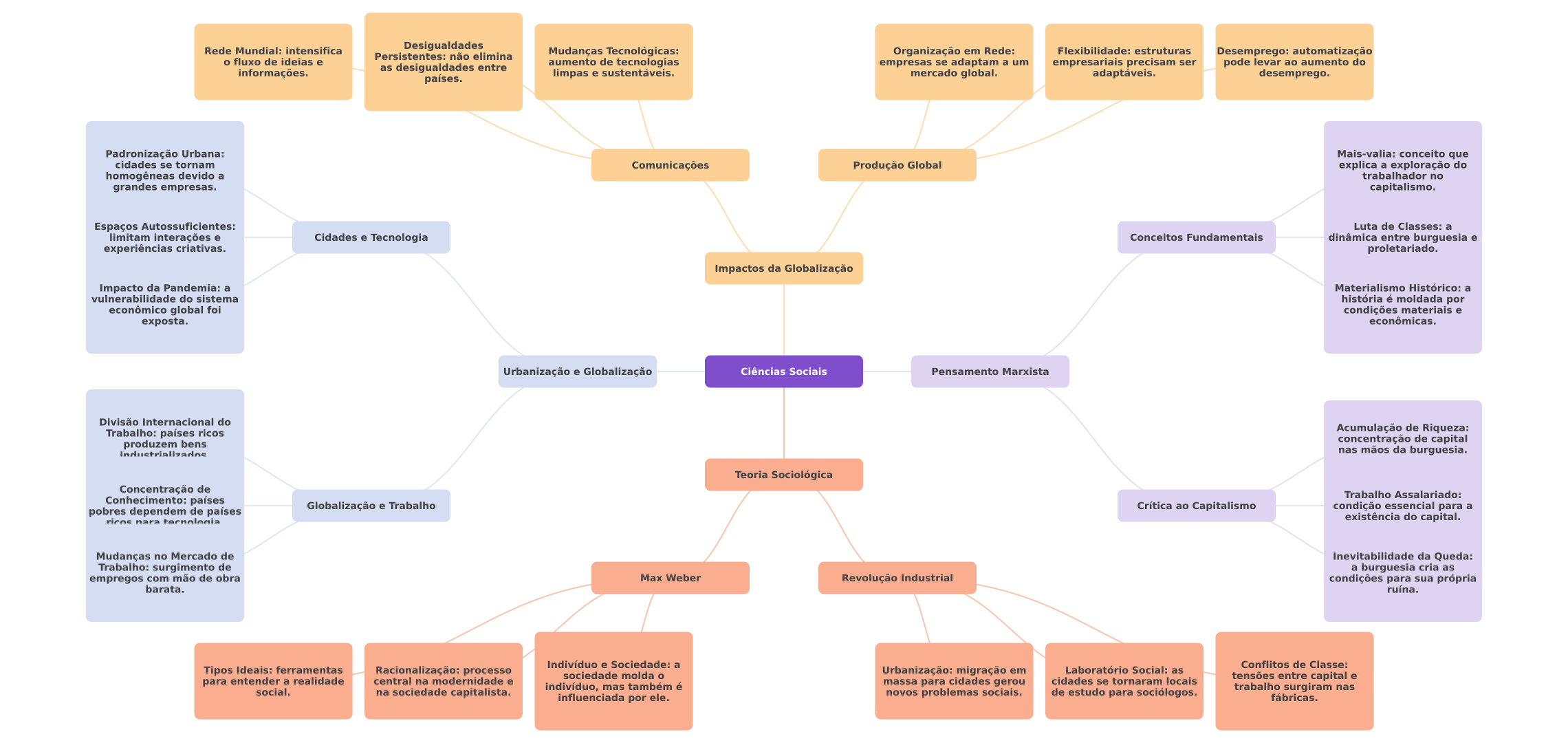 Rede Mundial: intensifica Desigualdades Persistentes: não elimina Mudanças Tecnológicas: Organização em Rede: Flexibilidade: estruturas Desemprego: automatização fluxo de ideias e as desigualdades entre aumento de tecnologias empresas se adaptam a um empresariais precisam ser pode levar ao aumento do informações. países. limpas e sustentáveis. mercado global. adaptáveis. desemprego. Padronização Urbana: Mais-valia: conceito que cidades se tornam Comunicações Produção Global explica a exploração do homogêneas devido a trabalhador no grandes empresas. capitalismo. Espaços Autossuficientes: Luta de Classes: a limitam interações e Cidades e Tecnologia Conceitos Fundamentais dinâmica entre burguesia e experiências criativas. proletariado. Impactos da Globalização Impacto da Pandemia: a Materialismo Histórico: a vulnerabilidade do sistema história é moldada por econômico global foi condições materiais e exposta. econômicas. Urbanização e Globalização Ciências Sociais Pensamento Marxista Divisão Internacional do Trabalho: países ricos Acumulação de Riqueza: produzem bens concentração de capital industrializados nas mãos da burguesia. Teoria Sociológica Concentração de Trabalho Assalariado: Conhecimento: países Globalização e Trabalho pobres dependem de países Crítica ao Capitalismo condição essencial para a ricos nara tecnologia existência do capital. Mudanças no Mercado de Inevitabilidade da Queda: Trabalho: surgimento de a burguesia cria as empregos com mão de obra Max Weber Revolução Industrial condições para sua própria barata. ruína. Conflitos de Classe: Tipos Ideais: ferramentas Racionalização: processo Urbanização: migração em Laboratório Social: as sociedade molda para entender a realidade central na modernidade e massa para cidades gerou cidades se tornaram locais tensões entre capital e social. indivíduo, mas também é na sociedade capitalista. influenciada por ele. novos problemas sociais. de estudo para sociólogos. trabalho surgiram nas fábricas.