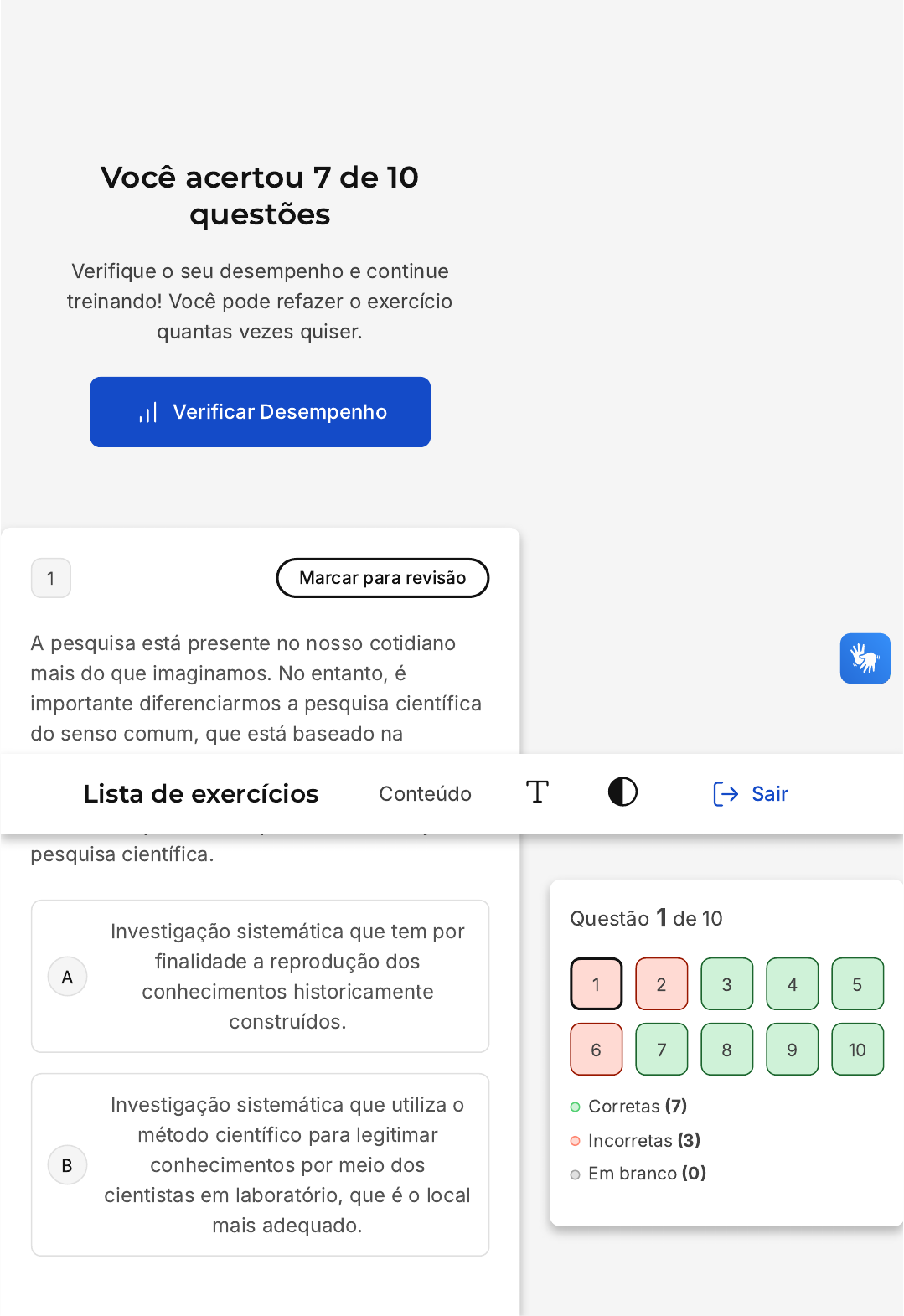 Você acertou 7 de 10 questões Verifique o seu desempenho e continue treinando! Você pode refazer o exercício quantas vezes quiser. Verificar Desempenho A B 1 Marcar para revisão A pesquisa está presente no nosso cotidiano mais do que imaginamos. No entanto, é importante diferenciarmos a pesquisa científica do senso comum, que está baseado na intuição, valores, percepções pessoais dos acontecimentos do dia a dia. Assinale a alternativa que melhor apresenta a definição de pesquisa científica. Investigação sistemática que tem por finalidade a reprodução dos conhecimentos historicamente construídos. Investigação sistemática que utiliza o método científico para legitimar conhecimentos por meio dos cientistas em laboratório, que é o local mais adequado. Questão 1 de 10 Corretas (7) Incorretas (3) Em branco (0) 1 2 3 4 5 6 7 8 9 10 Lista de exercícios Conteúdo Sair C D E Estudo das relações entre educação e sociedade, que deve ser praticado por professores desde a Educação Básica. Diálogo com a realidade, em um processo de busca por respostas sobre um determinado assunto/problema real, tendo como resultado a produção de conhecimentos. Diálogo com a comunidade científica, que produziu pesquisas anteriores e está preparada para compreender a linguagem acadêmica. Resposta incorreta Opa! A alternativa correta é a letra D. Confira o gabarito comentado! Gabarito Comentado A alternativa correta é a D. A pesquisa científica é um diálogo com a realidade, onde se busca respostas para um determinado assunto ou problema real. O objetivo é a produção de conhecimentos, e não apenas a reprodução dos já existentes. A pesquisa científica não se limita a experimentos em laboratórios, mas se estende a diversos contextos, incluindo a sala de aula, onde o professor também pode ser um pesquisador. Além disso, a pesquisa científica não se direciona apenas à comunidade acadêmica, mas busca produzir conhecimentos relevantes e contextualizados para a sociedade como um todo. A B C D E 2 Marcar para revisão Por meio de um método científico, o pesquisador testa e comprova hipóteses, com o objetivo de chegar a uma conclusão sobre o objeto investigado. São inúmeras as razões que podem conduzir à formulação de um problema de pesquisa. No que diz respeito à abordagem e à natureza da pesquisa em educação, marque a alternativa que expressa um desafio nesse sentido. A ampliação do repertório de pesquisas de cunho qualitativo, pois se tem desenvolvido um grande número de pesquisas quantitativas. A ampliação do repertório de pesquisas quantitativas, inclusive para a formulação de Políticas Públicas, mantendo os estudos qualitativos, pois são muito relevantes para a área. A ideia de que a pesquisa em educação só é possível por meio de uma análise qualitativa. A ampliação do repertório de pesquisas quantitativas, mudando o foco para uma nova perspectiva. A preparação de professores para utilizar métodos quantitativos para análise de dados. Resposta incorreta Opa! A alternativa correta é a letra B. Confira o gabarito comentado! Gabarito Comentado A alternativa correta é a B. A pesquisa em educação é um campo vasto e complexo que requer uma variedade de abordagens e métodos. Embora a pesquisa qualitativa seja crucial para entender as especificidades e nuances de determinados fenômenos educacionais, é igualmente importante ampliar o repertório de pesquisas quantitativas. As pesquisas quantitativas permitem generalizações que são necessárias para a formulação de políticas públicas, por exemplo. Sem essas generalizações, seria difícil desenvolver políticas que atendam a um país inteiro com base em estudos localizados. Portanto, é um desafio manter a relevância dos estudos qualitativos, ao mesmo tempo em que se amplia o repertório de pesquisas quantitativas. 3 Marcar para revisão Em 1951, foi criado no Brasil o Conselho de Desenvolvimento Científico e Tecnológico (CNPQ). Órgão de imensa importância para pesquisa e pesquisadores. Profissionais e estudantes pesquisadores, de todas as áreas do conhecimento, estão em sintonia através do mesmo. Dentre as estratégias estabelecidas para se manter a ética em pesquisas científicas, assinale a alternativa correta. A B C D E O respeito à vontade do sujeito da pesquisa, a não utilização do Termo de Consentimento Livre e Esclarecido, apenas caso o participante deseje. A dispensa do Termo de Consentimento Livre e Esclarecido quando a pesquisa for com menores de idade, a preservação da identidade dos participantes quando eles solicitarem. O respeito ao que os autores de referência escreveram, através da reprodução literal de suas ideias. Caso a reprodução seja breve, não é necessário atribuir créditos. O não cometimento de plágio, a utilização do Termo de Consentimento Livre e Esclarecido, a preservação da identidade dos participantes da pesquisa e a manutenção da transparência com eles. O uso do Termo de Consentimento Livre e Esclarecido, considerando que, após a assinatura do termo para a pesquisa, não se pode mais desistir. Resposta correta Parabéns, você selecionou a alternativa correta. Confira o gabarito comentado! Gabarito Comentado A B A alternativa D é a correta, pois aborda princípios fundamentais para a ética em pesquisas científicas. O não cometimento de plágio é essencial para a integridade acadêmica e científica. A utilização do Termo de Consentimento Livre e Esclarecido é uma prática obrigatória, que garante que o participante está ciente e concorda com os procedimentos da pesquisa. A preservação da identidade dos participantes é um direito que deve ser respeitado, assim como a transparência com eles. Além disso, é importante lembrar que existem outras recomendações éticas, como a necessidade de aprovação do estudo pelo Comitê de Ética e a possibilidade do sujeito da pesquisa desistir do est