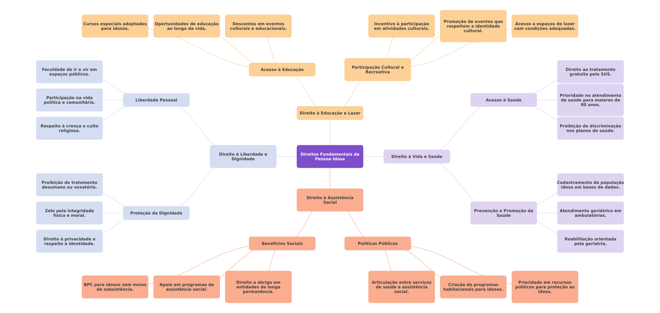 Cursos especiais adaptados Oportunidades de educação Descontos em eventos Incentivo à participação Promoção de eventos que para idosos. ao longo da vida. culturais e educacionais. em atividades culturais. respeitem a identidade Acesso a espaços de lazer cultural. com condições adequadas. Faculdade de e vir em Participação Cultural e Acesso à Educação Direito ao tratamento Recreativa espaços públicos. gratuito pelo Prioridade no atendimento Participação na vida Liberdade Pessoal Acesso à Saúde política e comunitária. de saúde para maiores de 80 anos. Direito à Educação e Lazer Respeito à crença e culto Proibição de discriminação religioso. nos planos de saúde. Direito à Liberdade e Direitos Fundamentais da Direito à Vida e Saúde Dignidade Pessoa Idosa Proibição de tratamento Cadastramento da população desumano ou vexatório. idosa em bases de dados. Direito à Assistência Social Zelo pela integridade física e moral. Proteção da Dignidade Prevenção e Promoção da Atendimento geriátrico em Saúde ambulatórios. Direito à privacidade e Reabilitação orientada respeito à identidade. Benefícios Sociais Políticas Públicas pela geriatria. BPC para idosos sem meios Apoio em programas de Direito a abrigo em Articulação entre serviços Prioridade em recursos entidades de longa de saúde e assistência Criação de programas de subsistência. assistência social. habitacionais para idosos. públicos para proteção ao permanência. social. idoso.