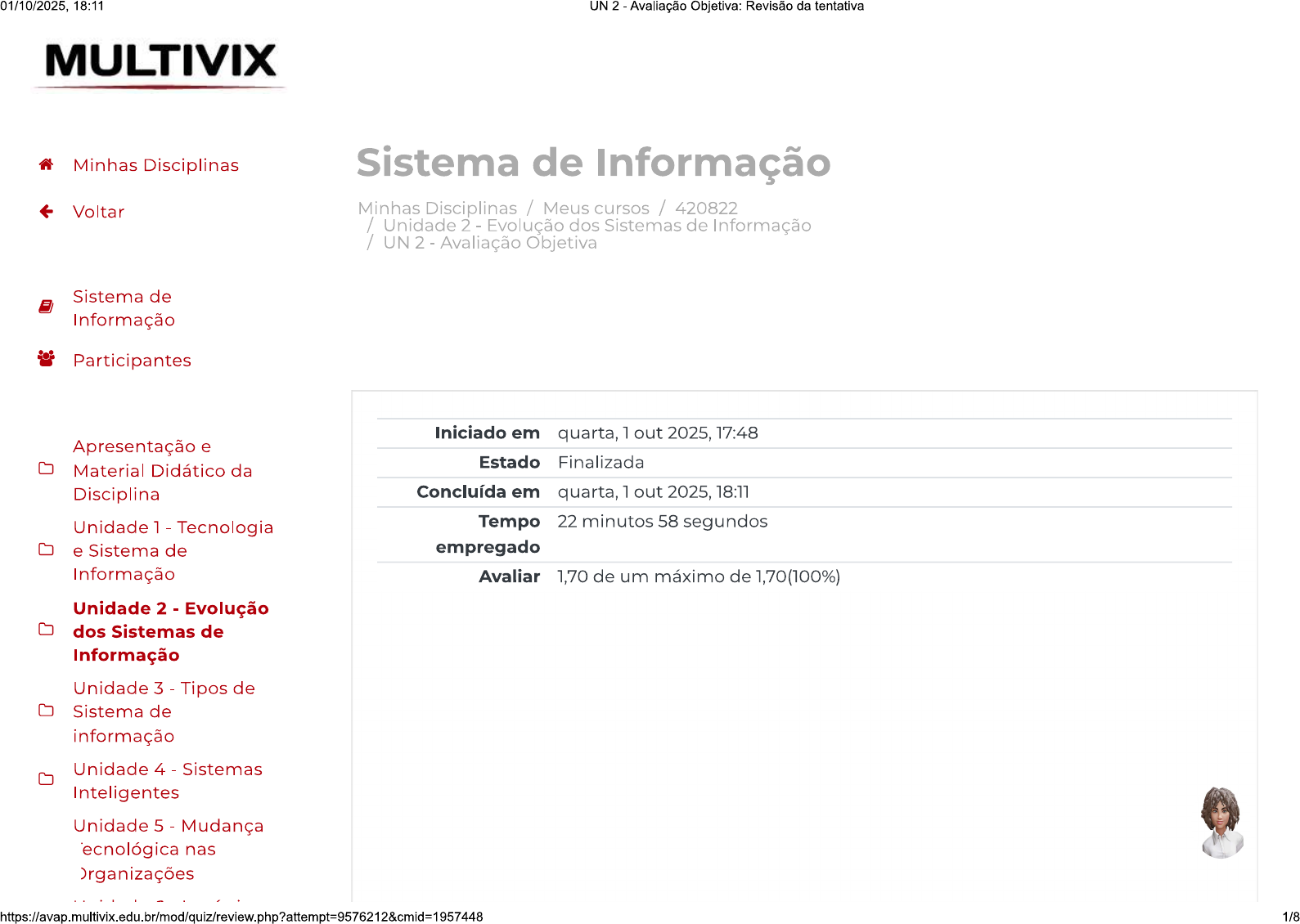01/10/2025, 18:11 UN 2 Avaliação Objetiva: Revisão da tentativa MULTIVIX Minhas Disciplinas Sistema de Informação Voltar Minhas Disciplinas / Meus cursos / 420822 / Unidade 2 Evolução dos Sistemas de Informação / UN 2 Avaliação Objetiva Sistema de Informação Participantes Iniciado em quarta, 1 out 2025, 17:48 Apresentação e Estado Finalizada Material Didático da Disciplina Concluída em quarta, 1 out 2025, 18:11 Unidade 1 Tecnologia Tempo 22 minutos 58 segundos e Sistema de empregado Informação Avaliar 1,70 de um máximo de 1,70(100%) Unidade 2 - Evolução dos Sistemas de Informação Unidade 3 Tipos de Sistema de informação Unidade 4 Sistemas Inteligentes Unidade 5 Mudança ecnológica nas Organizações https://avap.multivix.edu.br/mod/quiz/review.php?attempt=9576212&cmid=1957448 1/801/10/2025, 18:11 UN 2 Avaliação Objetiva: Revisão da tentativa Questão 1 MULTIVIX Correto A evolução dos sistemas da informação foi um grande passo para mundo Atingiu 0,34 tecnológico, analise as assertivas a seguir e a relação proposta entre elas. de 0,34 (1) Com a evolução tecnológica, a abordagem sistêmica da informação Minhas Disciplinas começou a ser uma tendência e uma necessidade nas organizações. Voltar PORQUE (2) Os Sistemas de Informação vieram a dar ao computador uma nova Sistema de dimensão, transformando-o de mero processador de dados em elemento Informação preponderante na racionalização e na dinamização do trabalho na empresa. Participantes A respeito dessas duas assertivas, assinale a opção correta. Escolha uma opção: Apresentação e Material Didático da a. As duas assertivas são verdadeiras e a segunda justifica a primeira. Disciplina Unidade 1 Tecnologia b. As duas assertivas são verdadeiras e a segunda não justifica a e Sistema de primeira. Informação Unidade 2 Evolução C. As duas assertivas são falsas. dos Sistemas de Informação d. A primeira assertiva é falsa e a segunda é verdadeira. Unidade 3 Tipos de Sistema de e. A primeira assertiva é verdadeira e a segunda é falsa. informação Unidade 4 Sistemas Inteligentes Unidade 5 Mudança ecnológica nas Organizações https://avap.multivix.edu.br/mod/quiz/review.php?atempt=9576212&cmid=1957448 2/801/10/2025, 18:11 UN 2 Avaliação Objetiva: Revisão da tentativa Questão 2 MULTIVIX A partir dos conhecimentos adquiridos sobre Sistemas de Informação, Correto analise as afirmativas: Atingiu 0,34 de 0,34 Minhas Disciplinas I Os sistemas de informação baseados em computador visam melhorar os Voltar processos de conhecimento, avaliação e gestão. Os Sistemas de informação computadorizados bem-sucedidos agregam informações da empresa e as organizam de maneira a permitir acesso e a Sistema de Informação geração de relatórios tais como padrão de comportamento e perfil de Participantes clientes e tendências de mercado. III Os sistemas de informação são projetados para trabalhar a integração das informações, se limitando a executar funções específicas como Apresentação e Material Didático da processamento de pedidos e de dados. Disciplina Unidade 1 Tecnologia e Sistema de Após a avaliação, assinale a resposta correta. Informação Unidade 2 Evolução Escolha uma opção: dos Sistemas de a. Apenas a afirmativa está certa. Informação Unidade 3 Tipos de b. Apenas a afirmativa III está certa. Sistema de informação C. As afirmativas I e estão certas. Unidade 4 Sistemas Inteligentes d. As afirmativas e III estão certas. Unidade 5 Mudança ecnológica nas Organizações 3/801/10/2025, 18:11 UN 2 Avaliação Objetiva: Revisão da tentativa e. As afirmativas e III estão certas. MULTIVIX Minhas Disciplinas Voltar Sistema de Informação Participantes Apresentação e Material Didático da Disciplina Unidade 1 Tecnologia e Sistema de Informação Unidade 2 - Evolução dos Sistemas de Informação Unidade 3 - Tipos de Sistema de informação Unidade 4 Sistemas Inteligentes Unidade 5 - Mudança ecnológica nas Organizações 4/801/10/2025, 18:11 UN 2 Avaliação Objetiva: Revisão da tentativa Questão 3 MULTIVIX Os sistemas de informação apresentam aspectos internos e externos. Neste Correto sentido, analise as afirmativas a seguir que dizem respeito exclusivamente Atingiu 0,34 de 0,34 aos aspectos internos dos Sistemas de Informação implantados em uma Minhas Disciplinas organização: I - Os aspectos internos referem-se especificamente às questões de Voltar tecnologia e materiais. Software e hardware são exemplos de aspectos internos. Sistema de Informação III processo de tomada de decisão e de definição de preço, como Participantes referem-se aos aspectos internos, dependem da estrutura montada pela empresa para suportar um sistema de informação e suas funcionalidades. Apresentação e Material Didático da Após a análise, assinale a opção correta. Disciplina Unidade 1 Tecnologia Escolha uma opção: e Sistema de a. As afirmativas e estão certas. Informação Unidade 2 Evolução b. Apenas a afirmativa está certa. dos Sistemas de Informação C. As afirmativas e III estão certas. Unidade 3 Tipos de Sistema de informação d. Apenas a afirmativa III está certa. Unidade 4 Sistemas Inteligentes e. As afirmativas I e III estão certas. Unidade 5 Mudança ecnológica nas Organizações 5/801/10/2025, 18:11 UN 2 Avaliação Objetiva: Revisão da tentativa Questão 4 MULTIVIX Sistema de Informação é um processo ou conjunto de componentes que Correto coleta, processa, armazena, analisa e discrimina informações para uma Atingiu 0,34 de 0,34 finalidade específica e, para que isto acontecer, é necessário que haja um Minhas Disciplinas fluxo de informação e uma retroalimentação do sistema. Esses sistemas são em sua grande maioria apoiado por computadores. Os sistemas de Voltar informação têm como marco cronológico de evolução, a década de 1950 do século XX, no entanto, grande salto evolutivo nos sistemas de informa