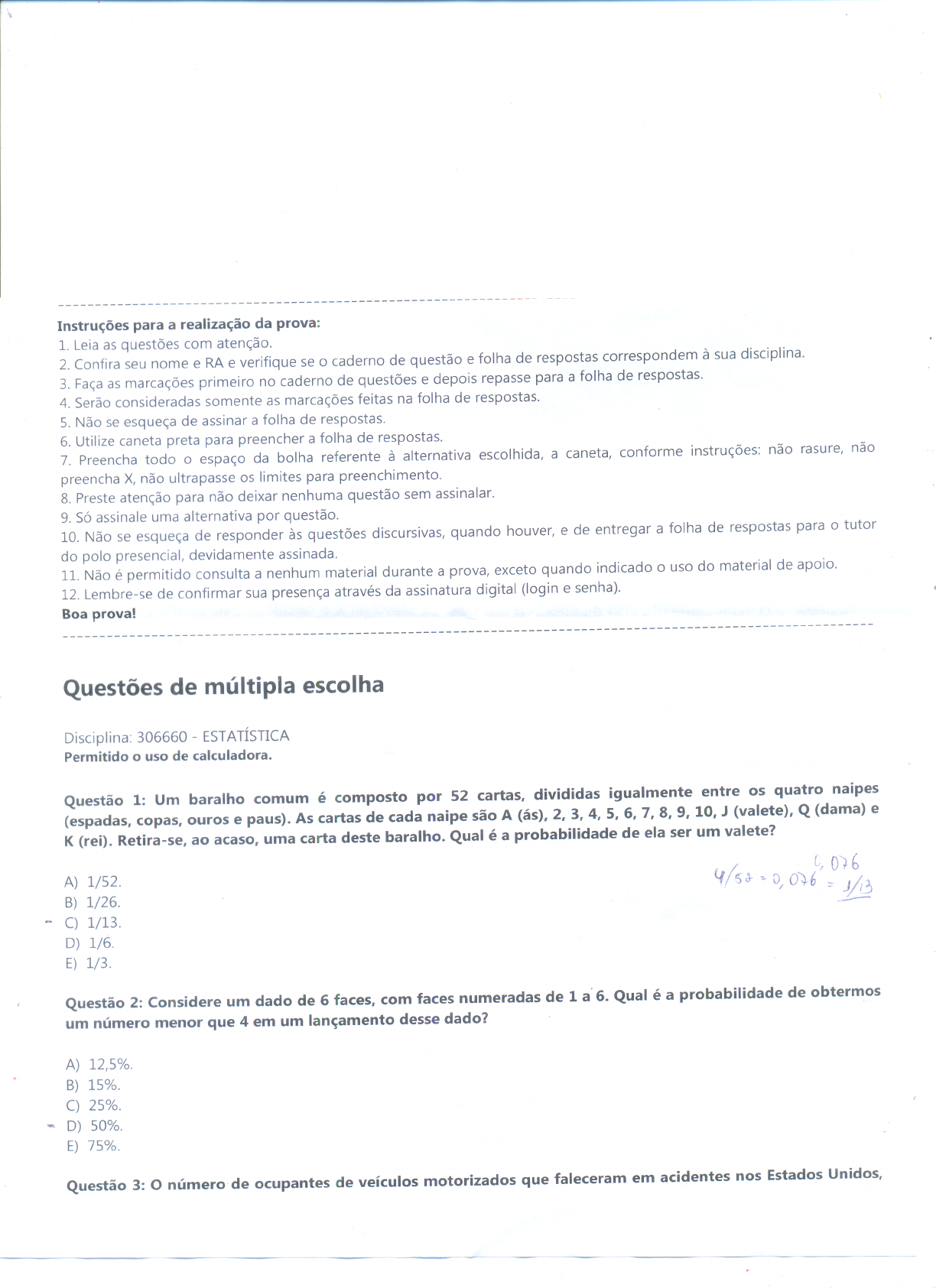 Instruções para a realização da prova: 1. Leia as questões com atenção. 2. Confira seu nome e RA e verifique se caderno de questão e folha de respostas correspondem à sua disciplina. 3. Faça as marcações primeiro no caderno de questões e depois repasse para a folha de respostas. 4. Serão consideradas somente as marcações feitas na folha de respostas. 5. Não se esqueça de assinar a folha de respostas. 6. Utilize caneta preta para preencher a folha de respostas. 7. Preencha todo espaço da bolha referente à alternativa escolhida, a caneta, conforme instruções: não rasure, não preencha X, não ultrapasse os limites para preenchimento. 8. Preste atenção para não deixar nenhuma questão sem assinalar. 9. Só assinale uma alternativa por questão. 10. Não se esqueça de responder às questões discursivas, quando houver, e de entregar a folha de respostas para tutor do polo presencial, devidamente assinada. 11. Não é permitido consulta a nenhum material durante a prova, exceto quando indicado uso do material de apoio. 12. Lembre-se de confirmar sua presença através da assinatura digital (login e senha). Boa prova! Questões de múltipla escolha Disciplina: 306660 ESTATÍSTICA Permitido uso de calculadora. Questão 1: Um baralho comum é composto por 52 cartas, divididas igualmente entre os quatro naipes (espadas, copas, ouros e paus). As cartas de cada naipe são A (ás), 2, 3, 4, 5, 6, 7, 8, 9, 10, J (valete), Q (dama) e K (rei). Retira-se, ao acaso, uma carta deste baralho. Qual é a probabilidade de ela ser um valete? A) 1/52. B) 1/26. C) 1/13. D) 1/6. E) 1/3. Questão 2: Considere um dado de 6 faces, com faces numeradas de 1 a 6. Qual é a probabilidade de obtermos um número menor que 4 em um lançamento desse dado? A) 12,5%. B) 15%. C) 25%. D) 50%. E) 75%. Questão 3: número de ocupantes de veículos motorizados que faleceram em acidentes nos Estados Unidos,em determinado ano, foi de 35.806. percentual de vítimas que ocupavam cada tipo de veículo é apresentado no gráfico a seguir. Motocicletas Outros 1% 7% Caminhões Carros 34% 58% Fonte: LARSON, R. Estatística aplicada. São Paulo: Prentice Hall, 2004, 41. Qual foi tipo de gráfico utilizado para demonstrar este conjunto de dados? A) Histograma. B) Gráfico de barras. C) Gráfico de colunas. D) Polígono de frequências. - E) Gráfico de setores. Questão 4: valor esperado E(X) de uma variável discreta aleatória X é calculado pela média ponderada dos valores xi assumidos pela variável, em que os pesos são as probabilidades unitárias p(xi): N Considere que X, uma variável discreta aleatória, possa assumir quatro valores distintos: 0, 1, 2 ou 3. A distribuição de probabilidade da variável é mostrada a seguir, com probabilidades expressas como taxas 0 16 54 135 percentuais. 205 X Probabilidade (%) 12 0 1 16 205 2 27 3 45 Nesse caso, qual é valor esperado de X? A) 1,65. B) 2,05. C) 2,75. D) 2,95. E) 3,15. Questão 5: Assinale a alternativa correta a respeito da média e do desvio-padrão. A) O desvio-padrão é uma medida de tendência central. B) A média é uma medida de dispersão. C) Tanto a média quanto desvio-padrão têm a mesma unidade de medida dos dados do conjunto.D) Desvio-padrão é mesmo que desvio médio. E) Média é mesmo que mediana. Questão 6: A distribuição de frequências abaixo resume dados de uma pesquisa envolvendo uma amostra de 20 jovens que participaram de um teste de raciocínio lógico no processo seletivo de uma empresa de desenvolvimento de software. As classes indicam a pontuação total dos participantes. São mostradas a frequência (f), a frequência relativa (fr) e a frequência acumulada (F). Assinale a alternativa que traz os valores que preenchem corretamente a frequência relativa da classe (fr2) e a frequência acumulada da classe (F4). Idade f fr F 12 14 3 0,15 3 14 16 4 7 16 18 6 0,30 13 18 20 7 0,35 20 A) fr2 0,25 e F4 15. - B) fr2 0,20 e F4 20. C) fr2 0,20 e F4 15. D) fr2 0,25 e F4 = 30. E) fr2 0,15 e F4 15. Questão 7: Abaixo, temos a tabela de frequências para uma amostra de jogadores que participaram da avaliação da versão beta do jogo Hetfield Hero, da empresa Thrash Metal Games. A variável observada na tabela é a idade dos participantes, em anos. A notação f indica frequência simples absoluta, ou seja, número de ocorrências de cada resultado no conjunto de dados. A frequência simples absoluta é comumente chamada apenas frequência. Classe f 5 5 10 8 10 15 15 15 20 12 20 25 7 25 30 3 Lembrando que, se somarmos as frequências entre si, devemos recuperar número total de elementos da amostra, quantos jogadores compõem a amostra da avaliação do jogo? A) 50. B) 60. C) 70. D) 80. E) 90. Questão 8: Assinale a alternativa correta a respeito das medidas de tendência central e das medidas de dispersão. A) O desvio médio é uma medida de tendência central.B) A moda é uma medida de tendência central. C) A mediana é representada pelo valor mais frequente do conjunto de dados. D) Média é mesmo que moda. E) Variância é mesmo que desvio-padrão. Questões discursivas Questão 1: Considere que um dado de 6 faces tenha sido lançado 50 vezes. A partir dos resultados do experimento, foi montada a tabela de frequências a seguir, que indica a frequência (f) de cada face. Face do dado f 1 6 2 10 3 8 4 8 5 10 6 8 Com base nisso, complete a tabela a seguir, indicando a frequência acumulada (Fa) associada a cada face do dado neste experimento. Face do dado 1 6 6 2 10 16 3 8 24 4 8 32 5 10 42 6 8 50 Questão 2: A seleção de uma amostra de uma população é chamada de levantamento amostral. Esse levantamento amostral pode ser de dois tipos: probabilístico ou não probabilístico. Os levantamentos amostrais probabilísticos podem ser classificados em: amostragem aleatória simples; amostragem aleatória sistemática; amostragem aleatória estratificada; amostragem aleatória por conglomerados. Explique que é um processo de amost
