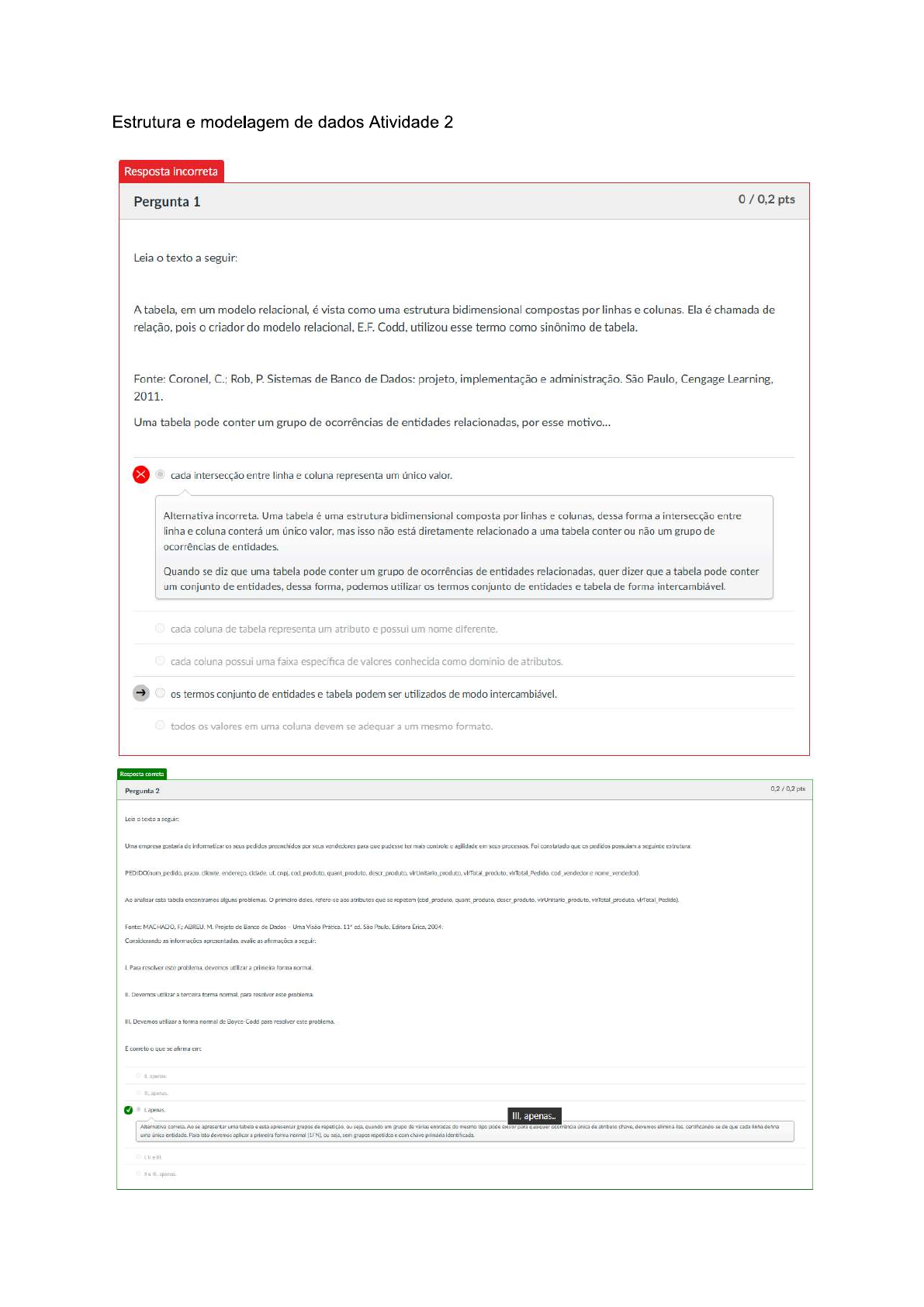 Estrutura e modelagem de dados Atividade 2 Resposta incorreta Pergunta 1 pts Leia texto a seguir: A tabela, em um modelo relacional, é vista como uma estrutura bidimensional compostas por linhas e colunas. Ela é chamada de relação, pois criador do modelo relacional, E.F. Codd, utilizou esse termo como sinônimo de tabela. Fonte: Coronel, Rob, P. Sistemas de Banco de Dados: projeto, implementação e administração. São Paulo, Cengage Learning, 2011. Uma tabela pode conter um grupo de ocorrências de entidades relacionadas, por esse motivo... cada intersecção entre linha e coluna representa um único valor. Alternativa incorreta. Uma tabela é uma estrutura bidimensional composta por linhas e colunas, dessa forma a intersecção entre linha e coluna conterá um único valor, mas isso não está diretamente relacionado a uma tabela conter ou não um grupo de ocorrências de entidades. Quando se diz que uma tabela pode conter um grupo de ocorrências de entidades relacionadas, quer dizer que a tabela pode conter um conjunto de entidades, dessa forma, podemos utilizar termos conjunto de entidades e tabela de forma intercambiável. cada coluna de tabela representa um atributo e possui um nome diferente. cada coluna possui uma faixa específica de valores conhecida como domínio de atributos. os termos conjunto de entidades e tabela podem ser utilizados de modo intercambiável. todos valores em uma coluna devem se adequar a um mesmo formato. Resposta correta Pergunta 2 pts Leia texto seguir: Uma empresa gostaria de informatizar os seus pedidos preenchidos por seus vendedores para que pudesse ter mais controle agilidade em seus processos. Foi constatado que os pedidos seguinte estrutura: PEDIDO(num cod quant produto, descr produto, virTotal virTotal Pedido, cod vendedor nome vendedor). Ao analisar esta tabela encontramos alguns problemas. primeiro refere se aos atributos que se repetem (cod quant descr virTotal Pedido). Fonte: ABREU. Projeto de Banco de Dados Uma Visão Prática. ed. São Paulo. Editora 2004. Considerando as informações avalie as afirmações seguir: Para resolver este devemos utilizar primeira forma Devemos utilizar terceira forma para resolver este problema. Devemos utilizar a forma normal de Codd para resolver este problema. correto que se afirma em: III, apenas.. Alternativa correta. Ao se apresentar uma tabela esta apresentar grupos de ou quando um grupo de várias entradas do mesmo tipo pode para única de atributo chave devemos certificando se de que cada linha defina uma única Para isto devemos aplicar primeira forma normal (1FN). ou seja, sem grupos repetidos com chave primáriaResposta correta Pergunta 3 pts Leia texto Em relação aos relacionamentos dentro do banco de dados podemos los como um para um (1:1). um para muitos (1:M) muitos para muitos (M:M). No ambiente não existe suporte direto relacionamentos dessa devem ser implementados criando se uma nova entidade no relacionamento 1:M das entidades conforme figura. Figura Adaptada Fonte: C.: Rob. P. Sistemas de Banco de Dados: implementação administração. São Cengage 2011. Considerando as informações avalie as afirmações seguir: Foi utilizado conceito de chave pois uma chave candidata foi selecionada para identificar exclusivamente todos os outros valores de atributos em uma determinada linha Foi utilizado conceito de chave pois existe um atributo em uma tabela cujos valores devem coincidir com chave primária de outra tabela ou devem ser nulos. III. Foi utilizado conceito de entidade composta ou pois essa tabela utilizada para ligar as tabelas originalmente no relacionamento M:M. correto que se afirma em: Alternativa Para que haja devida implementação de relacionamentos identificados como M:M. devemos utilizar conceitos de chave conceitos de chave estrangeira também conceito de entidade composta ou pois essa tabela utilizada para ligar as tabelas originalmente no relacionamento incluindo em sua como chaves pelo menos as chaves primárias das tabelas que estão sendo ligadas.Resposta correta Pergunta 4 Leia texto seguir: Em termo chave apresenta dois sentidos comuns. Em um banco de uma chave um valor que permite identificar registros um repositório de dados. Em uma chave um valor que deve ser passado para algoritmo, com objetivo de codificar ou decodificar uma determinada mensagem. Em bancos de dados a chave um dos campos de um registro. conceito de chave está também intimamente relacionado aos conceitos de indices tabelas. Existem vários tipos de chave. Acesso: 05/10/2020 Em bancos de dados uma chave. descrita como aquela, que identifica exclusivamente uma linha da tabela chave primária. Alternativa chave primária aquela que identifica exclusivamente uma linha da ou identifica um registro único dentro da tabela. chave composta ou chave chave chave Resposta correta Pergunta 5 Leia texto seguir: Normalização é um processo para avaliar corrigir estruturas tabelas de modo minimizar as redundâncias de dados, assim, a probabilidade de A normalização atua por meio de uma série de estágios chamados formas normais. A 1FN descreve um formato de tabela em que todos os atributos de chave estão não há grupos de repetição todos os atributos são dependentes da chave primária. Na a tabela deve estar na 1FN não incluir dependências parciais. Sendo podemos ter como exemplo as seguintes tabelas (em formato de esquema relacional): Projeto Proj Num Nome): Func Func Func SalHora): Designacao(Proj Func Num Desig Horas) Fonte: C.: Rob. P. Sistemas de Banco de Dados: implementação administração. São Paulo, Cengage 2011. Considerando as informações opção correta. As tabelas Funcionário Designação encontram- se na primeira forma normal na segunda forma normal. As tabelas Funcionario Designacao se na primeira forma pois todos atributos de chave estão não possuem grupos de repetição todos atributos são dependentes da chave primária na segunda forma pois todas as tabelas estão