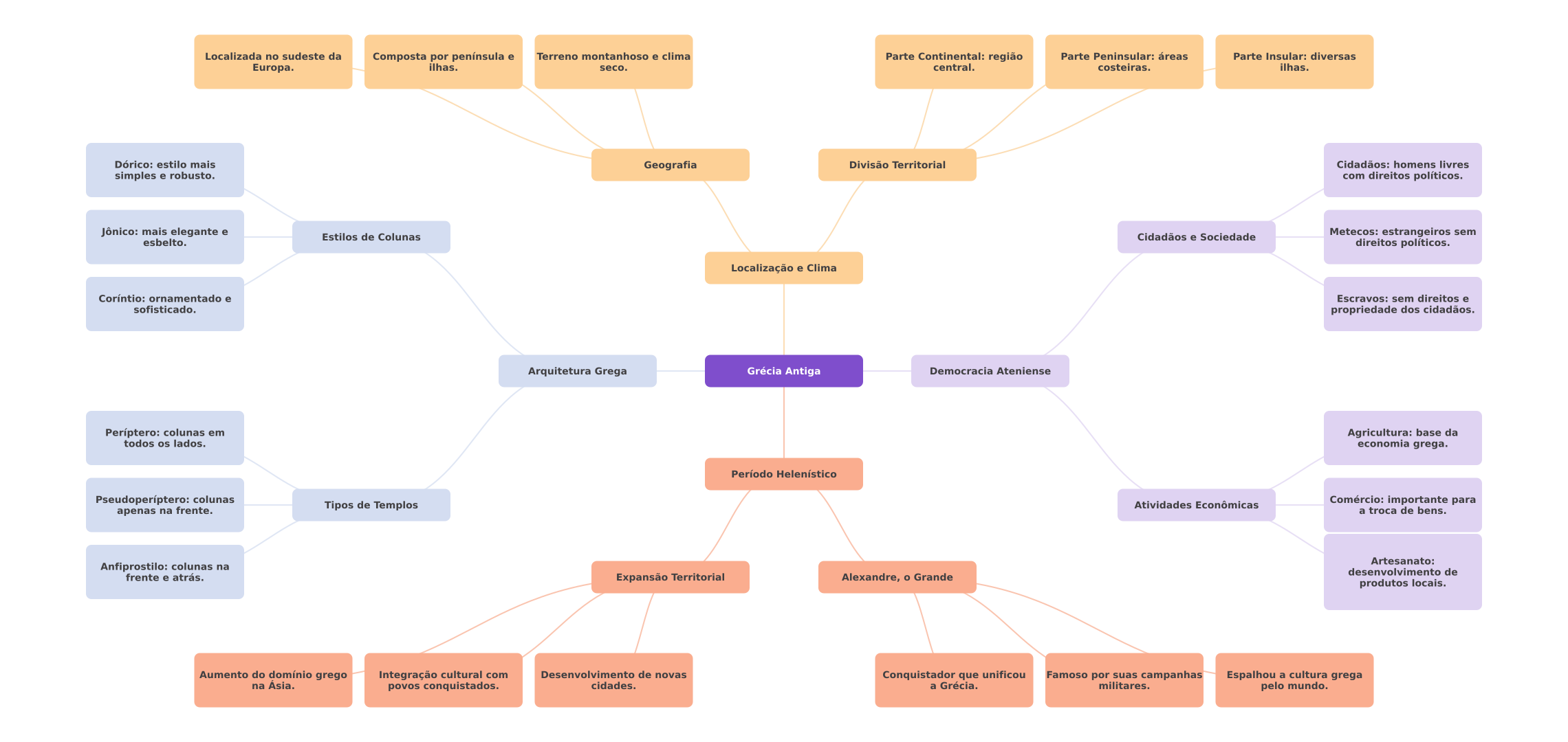 Localizada no sudeste da Composta por península e Terreno montanhoso e clima Parte Continental: região Parte Peninsular: áreas Parte Insular: diversas Europa. ilhas. seco. central. costeiras. ilhas. Dórico: estilo mais Geografia Divisão Territorial Cidadãos: homens livres simples e robusto. com direitos políticos. Jônico: mais elegante e Estilos de Colunas Cidadãos e Sociedade Metecos: estrangeiros sem esbelto. direitos políticos. Localização e Clima Coríntio: ornamentado e Escravos: sem direitos e sofisticado. propriedade dos cidadãos. Arquitetura Grega Grécia Antiga Democracia Ateniense Períptero: colunas em Agricultura: base da todos os lados. economia grega. Período Helenístico Pseudoperíptero: colunas Tipos de Templos Atividades Econômicas Comércio: importante para apenas na frente. a troca de bens. Artesanato: Anfiprostilo: colunas na desenvolvimento de frente e atrás. Expansão Territorial Alexandre, Grande produtos locais. Aumento do domínio grego Integração cultural com Desenvolvimento de novas Conquistador que unificou Famoso por suas campanhas Espalhou a cultura grega na Ásia. povos conquistados. cidades. a Grécia. militares. pelo mundo.