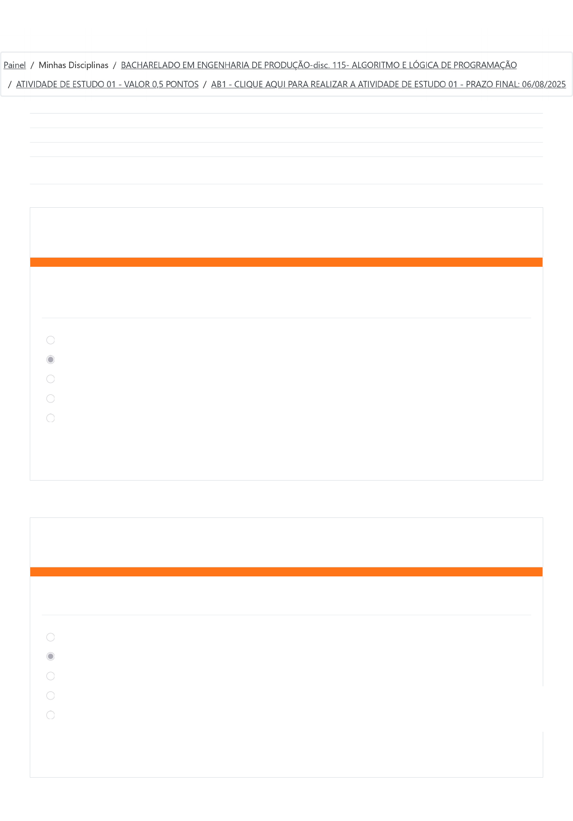 Iniciado em terça, 8 jul 2025, 14:08 Estado Finalizada Concluída em terça, 8 jul 2025, 14:22 Tempo empregado 14 minutos 14 segundos Avaliar 0,50 de um máximo de 0,50(100%) Questão 1 Completo Atingiu 0,05 de 0,05 Questão 2 Completo Atingiu 0,05 de 0,05 Representam dados ou objetos cujo valor permanece inalterado ao longo do tempo, ou durante a execução do programa. Tal afirmação diz respeito a: a. Marcador de posição. b. Constantes. c. Instrução de atribuição. d. Variáveis. e. Algoritmos. Sua resposta está correta. As constantes, no Python, geralmente são declaradas e disponibilizadas em um módulo. Esse módulo consiste em: a. Um arquivo novo, com variáveis, funções, etc., que são exportadas para o arquivo principal. b. Um arquivo novo, com variáveis, funções, etc., que são importadas para o arquivo principal. c. Um arquivo novo, limitado que não consegue importar para o arquivo principal em um computador. d. Um arquivo novo, limitado que não consegue exportar para o arquivo principal em um computador. e. Um arquivo restrito sem vínculo com o arquivo principal em um computador. Sua resposta está correta. AB1 - CLIQUE AQUI PARA REALIZAR A ATIVIDADE DE ES... https://www.eadunifatecie.com.br/mod/quiz/review.php?attempt=168... 1 of 6 08/07/2025, 14:23 Questão 3 Completo Atingiu 0,05 de 0,05 Questão 4 Completo Atingiu 0,05 de 0,05 Esse operador é o mais simples utilizado em lógica e constitui a operação lógica de inversão do estado lógico do elemento da premissa. Que operador é esse? a. Operador de AFIRMAÇÃO (+A). b. Operador de NEGAÇÃO (~A). c. Operador E (A . B). d. Operador de IMPLICAÇÃO (A→B). e. Operador OU (A + B). Sua resposta está correta. Complete a lacuna da afirmação a seguir: O sinal de igual na programação não corresponde à igualdade; ele é um ____________ e mostra que o que está à direita do sinal de igual foi calculado. Esse resultado é atribuído à variável que está à esquerda do sinal. a. Instrução de atribuição. b. Constantes. c. Operador de atribuição. d. Variáveis. e. Algoritmos. Sua resposta está correta. AB1 - CLIQUE AQUI PARA REALIZAR A ATIVIDADE DE ES... https://www.eadunifatecie.com.br/mod/quiz/review.php?attempt=168... 2 of 6 08/07/2025, 14:23 Questão 5 Completo Atingiu 0,05 de 0,05 Questão 6 Completo Atingiu 0,05 de 0,05 Neste método, as premissas ou, ainda, os fatos conduzem a uma “lei de formação”, pela repetição de algum padrão de comportamento. Que método é este? a. Lógico. b. Dedutivo. c. Indutivo. d. Direto. e. Racional. Sua resposta está correta. Julgue com “V” para verdadeiro e “F” para falso: ( ) No método dedutivo, deve-se observar as premissas sobre o problema, procurando algum padrão que revele uma lei de formação que seja a solução. ( ) O método indutivo é empregado com muita reserva no meio científico, pois as conclusões obtidas por meio dele são generalizações, que podem conduzir a inverdades. ( ) No método dedutivo, conforme Law (2008), as premissas são avaliadas e ordenadas em uma sequência de causa e efeito, de modo que a conclusão obtida seja resultante da sequência completa, emergindo como fato novo extraído ou, ainda, deduzido a partir das premissas constituintes. a. V, V, V. b. V, F, V. c. F, F, F. d. F, V, V. e. F, F, V. Sua resposta está correta. AB1 - CLIQUE AQUI PARA REALIZAR A ATIVIDADE DE ES... https://www.eadunifatecie.com.br/mod/quiz/review.php?attempt=168... 3 of 6 08/07/2025, 14:23 Questão 7 Completo Atingiu 0,05 de 0,05 Questão 8 Completo Atingiu 0,05 de 0,05 Julgue as afirmações a seguir com “V” para verdadeiro e “F” para falso, e assinale a alternativa correta: ( ) O mouse e a tela do computador são considerados dispositivos de entrada e saída, respectivamente. ( ) O disco rígido do computador também serve para armazenamento e possibilita que valores sejam armazenados e recuperados, porém se diferencia da memória e da CPU por ser mais lento. ( ) O computador também é composto de memória. É nesse local que os valores podem ser armazenados e recuperados. Trata- se de um dispositivo de armazenamento relativamente rápido, mas que perde seu conteúdo assim que o computador é desligado. A memória de um computador é dividida em diferentes locais; cada local dentro da memória tem um endereço e pode conter um valor. Assinale a alternativa correta: a. F, F, F. b. F, V, F. c. V, F, V. d. V, V, V. e. V, F, F. Sua resposta está correta. Complete a lacuna da afirmação a seguir: Para a construção das premissas, são utilizados____________, que estabelecem as relações entre os elementos que compõem a premissa. a. Mecanismos lógicos. b. Mecanismos racionais. c. Operários lógicos. d. Operadores lógicos. e. Instrumentos dedutivos e indutivos. Sua resposta está correta. AB1 - CLIQUE AQUI PARA REALIZAR A ATIVIDADE DE ES... https://www.eadunifatecie.com.br/mod/quiz/review.php?attempt=168... 4 of 6 08/07/2025, 14:23 Questão 9 Completo Atingiu 0,05 de 0,05 Questão 10 Completo Atingiu 0,05 de 0,05 Conforme lecionam Russell e Norvig (2013), para ambos os métodos de aplicação lógica (dedutivo e indutivo), aplica-se a sequência geral de análise descritiva do problema. Assinale a alternativa que contenha a sequência correta: a. Conclusão; Enunciar o problema; Descrever todas as partes constituintes do problema; Enunciar o problema; Avaliação Conclusiva; Ordenação lógica das premissas. b. Enunciar o problema; Descrever todas as partes constituintes do problema; Ordenação lógica das premissas; Avaliação Conclusiva; Conclusão. c. Ordenação lógica das premissas; Avaliação Conclusiva; Conclusão; Enunciar o problema; Descrever todas as partes constituintes do problema. d. Enunciar o problema; Ordenação lógica das premissas; Descrever todas as partes constituintes do problema; Avaliação Conclusiva; Conclusão. e. Enunciar o problema; Conclusão; Descrever todas as partes constituin