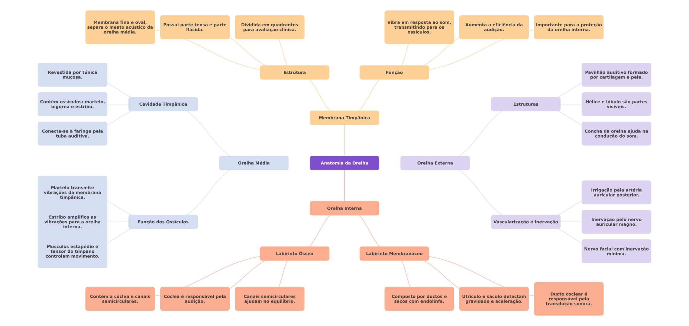 Membrana fina e oval, Possui parte tensa e parte Dividida em quadrantes Vibra em resposta ao som, Aumenta a eficiência da separa meato acústico da orelha média. para avaliação clínica. transmitindo para os Importante para a proteção flácida. audição. da orelha interna. ossículos. Revestida por túnica Estrutura Função Pavilhão auditivo formado mucosa. por cartilagem e pele. Contém ossículos: martelo, Cavidade Timpânica Estruturas Hélice e lóbulo são partes bigorna e estribo. visíveis. Membrana Timpânica Conecta-se à faringe pela Concha da orelha ajuda na tuba auditiva. condução do som. Orelha Média Anatomia da Orelha Orelha Externa Martelo transmite vibrações da membrana Irrigação pela artéria timpânica. auricular posterior. Orelha Interna Estribo amplifica as vibrações para a orelha Função dos Ossículos Vascularização e Inervação Inervação pelo nervo interna. auricular magno. Músculos estapédio e tensor do tímpano Nervo facial com inervação Labirinto Ósseo Labirinto Membranáceo mínima. controlam movimento. Ducto coclear é Contém a cóclea e canais Coclea é responsável pela Canais semicirculares Composto por ductos e Utrículo e sáculo detectam semicirculares. audição. ajudam no equilíbrio. sacos com endolinfa. gravidade e aceleração. responsável pela transdução sonora.