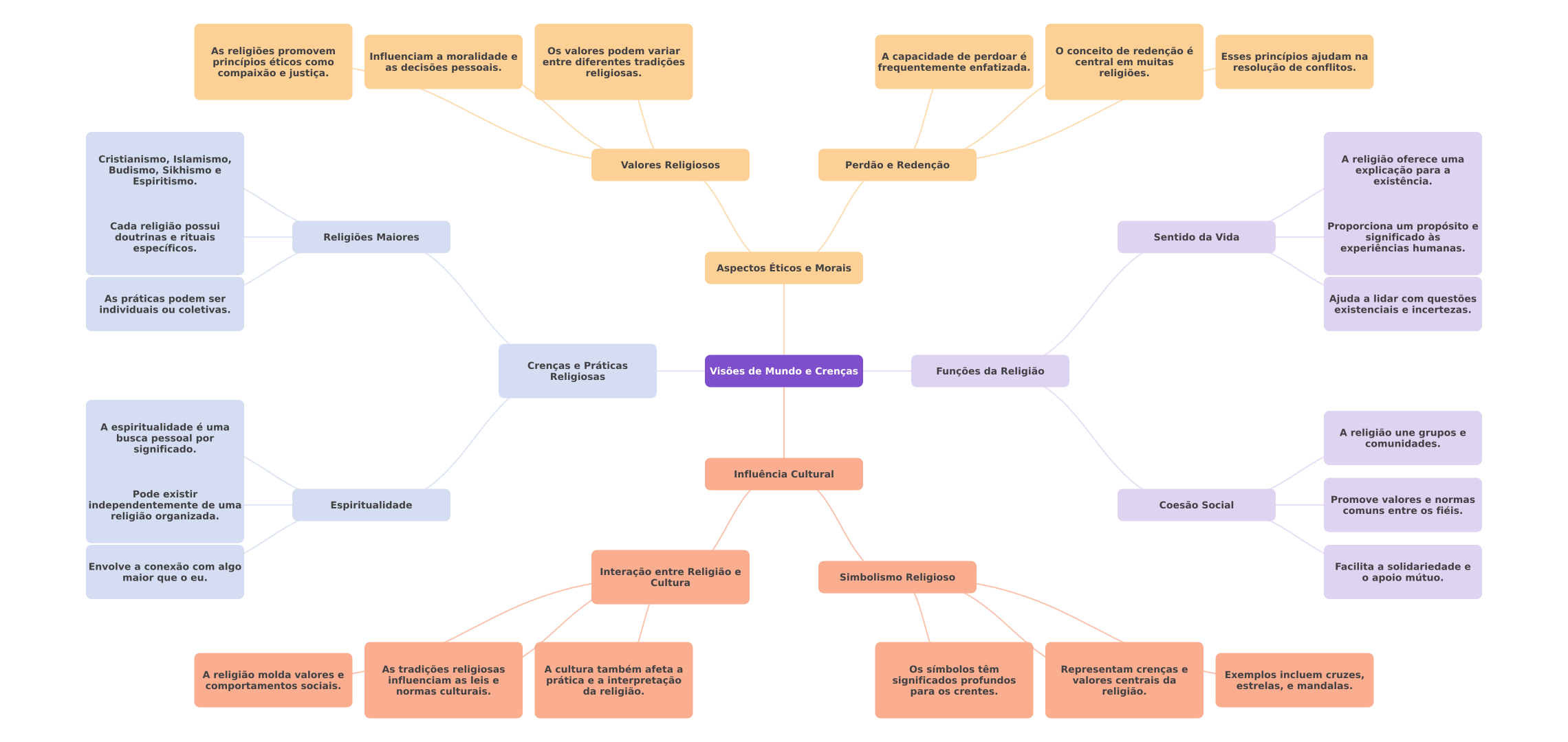 As religiões promovem Influenciam a moralidade e Os valores podem variar princípios éticos como A capacidade de perdoar é conceito de redenção é entre diferentes tradições central em muitas Esses princípios ajudam na compaixão e justiça. as decisões pessoais. religiosas. frequentemente enfatizada. religiões. resolução de conflitos. Cristianismo, Islamismo, A religião oferece uma Budismo, Sikhismo e Valores Religiosos Perdão e Redenção explicação para a Espiritismo. existência. Cada religião possui Proporciona um propósito e doutrinas e rituais Religiões Maiores Sentido da Vida significado às específicos. experiências humanas. Aspectos Éticos e Morais As práticas podem ser Ajuda a lidar com questões individuais ou coletivas. existenciais e incertezas. Crenças e Práticas Religiosas Visões de Mundo e Crenças Funções da Religião A espiritualidade é uma busca pessoal por A religião une grupos e comunidades. significado. Influência Cultural Pode existir Promove valores e normas independentemente de uma Espiritualidade Coesão Social comuns entre os fiéis. religião organizada. Envolve a conexão com algo Facilita a solidariedade e Interação entre Religião e maior que eu. Cultura Simbolismo Religioso apoio mútuo. As tradições religiosas A cultura também afeta a Os símbolos têm A religião molda valores e Representam crenças e influenciam as leis e Exemplos incluem cruzes, comportamentos sociais. prática e a interpretação significados profundos valores centrais da estrelas, e mandalas. normas culturais. da religião. para os crentes. religião.
