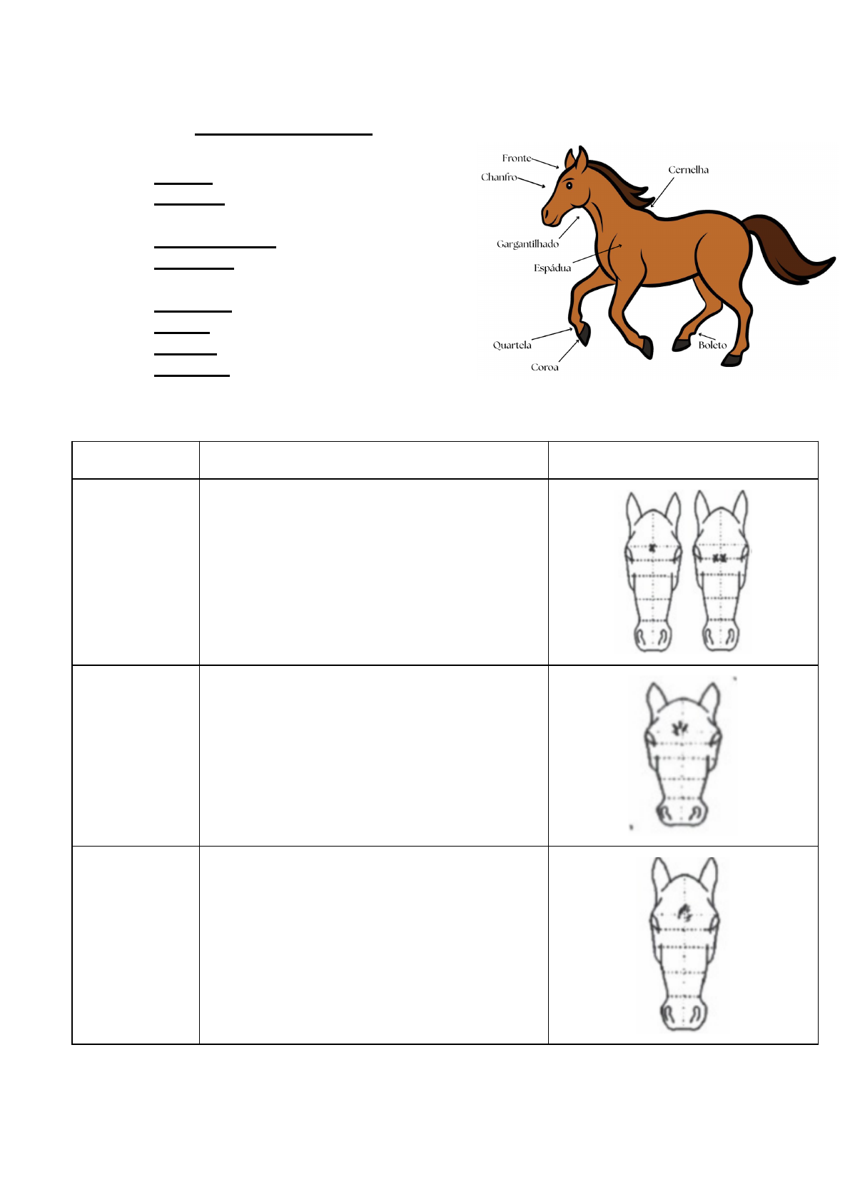 Resenha de cavalo: →Particularidades: ● Fronte: acima dos olhos até a testa. ● Chanfro: abaixo dos olhos até o focinho. ● Gargantilhado: na garganta. ● Cernelha: base do pescoço e início do dorso. ● Espádua: região do ombro do animal. ● Coroa: junção entre o casco e o pelo. ● Boleto: começo do pelo até a canela. ● Quartela: entre coroa e boleto. →Marcas em cabeça: Marcas Explicação Imagem Remoinho Áreas onde os pelos crescem em direções opostas Pêlos brancos Pêlos brancos espalhados Vestígio de estrela Pêlos brancos na fronte Estrela Marca branca com pele despigmentada na fronte com formato Luzeiro Marca branca que cobre grande parte da fronte Filete Listra fina de pelos brancos na região do chanfro Cordão Listra grossa de pelos brancos na região do chanfro Ladre Marca branca entre as narinas ligadas ao filete ou cordão Beta Marca branca entre as narinas Bebe Marca branca localizada em lábio superior ou inferior Bocalvo Marca branca despigmentada que cobre narinas e boca Frente aberta Marca branca cobrindo a fronte, o chanfro e até o focinho Malacara Marca branca cobrindo a fronte, o chanfro, o focinho e até a boca →Marcas em geral: Marcas Explicação Imagem Faixa crucial Faixa escura que se estende da cernelha até o início da espádua Listra de burro Lista que se estende da cernelha até a base da cauda Celhado Presença de cílios brancos Crinalvo Crinas brancas na pelagem alazã (avermelhada) →Calçado: Marcas Explicação Imagem Calçado baixo Entre coroa e boleto (quartela) Calçado médio Coroa até abaixo das articulações do joelho Calçado alto Coroa e ultrapassa as articulações do joelho Calçado incompleto Quando não envolve todo membro do animal Calçado arminhado Pintinhas pigmentadas Calçado Zebrutas Listas transversais ● Membros – calçados: - Manalvo → marca branca nos membros anteriores. - Pedalvo → marca branca nos membros posteriores. - Trialvo → o animal tem três membros com mancha branca. - Quatralvo → o animal tem quatro membros com mancha branca. - Lateral → quando as manchas brancas estão do mesmo lado (ex.: anterior direito + posterior direito). - Diagonal → quando as manchas brancas estão em lados opostos (ex.: anterior direito + posterior esquerdo). →Cascos: Marcas Explicação Imagem Rajados ou mesclados Cascos com listras brancas ou pretas →Outras características importantes: ● Manchas brancas: devem ser indicadas na resenha ● Bragas: malhas despigmentadas na região abdominal ● Pelagem apataca: manchas circunscritas e arredondadas, no fundo da pelagem, principalmente na região do tronco. ● Salpicada: pelagem alazã apresentando pêlos brancos esparsos sobre o tronco. ● Cicatrizes: cicatrizes permanentes. ● Golpe de lança: é uma depressão bastante funda e bem localizada, encontrada sobretudo no pescoço, músculos peitorais e na ponta da espádua. ● Marca a ferro: forma de identificação normalmente com o símbolo do criatório. ● Castanhas: para os cavalos sem marcas com apenas três remoinhos ou menos, deve-se desenhar o contorno das castanhas. ● Outros exemplos: despigmentação do olho, perda de um olho, prognatismo superior, defeitos de dentição, orelha fendida, afundamento no chanfro, cavalo cabano, cores não usuais do focinho.