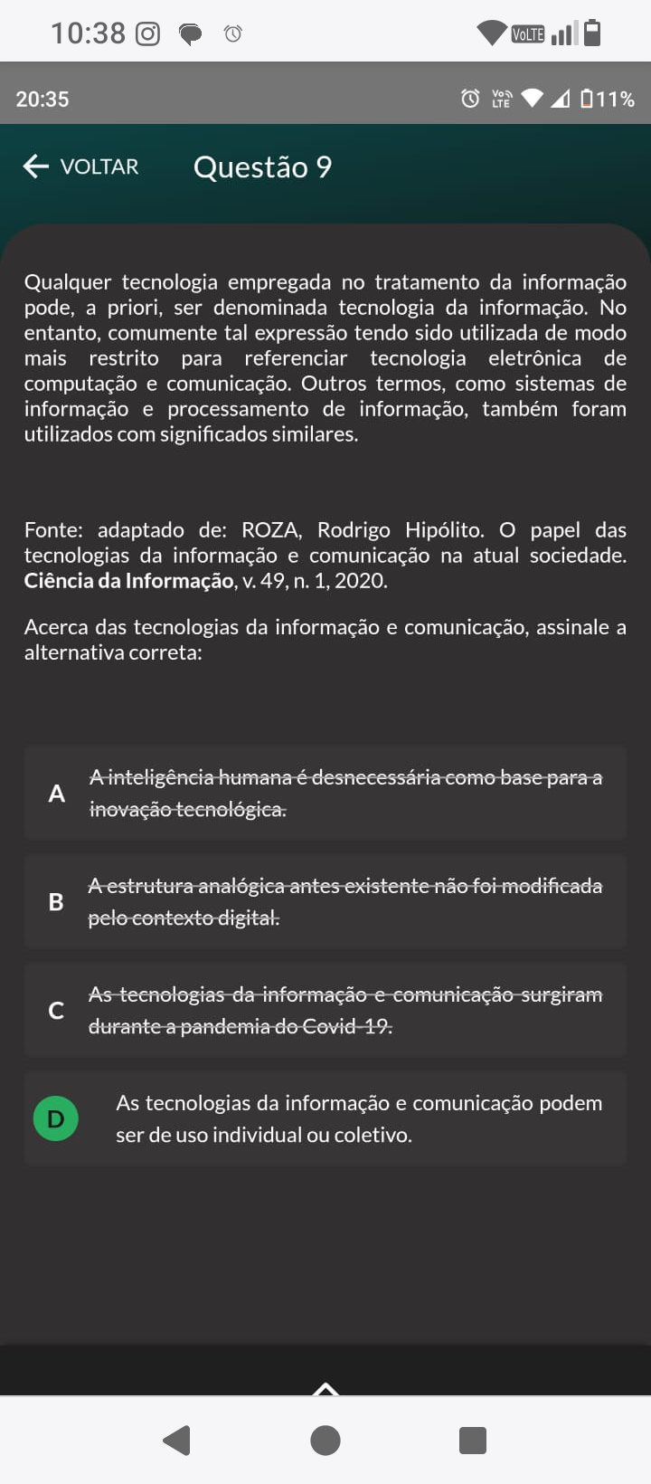10:38 20:35 LTE 011% VOLTAR Questão 9 Qualquer tecnologia empregada no tratamento da informação pode, a priori, ser denominada tecnologia da informação. No entanto, comumente tal expressão tendo sido utilizada de modo mais restrito para referenciar tecnologia eletrônica de computação e comunicação. Outros termos, como sistemas de informação e processamento de informação, também foram utilizados com significados similares. Fonte: adaptado de: ROZA, Rodrigo Hipólito. papel das tecnologias da informação e comunicação na atual sociedade. Ciência da Informação, V. 49, n. 1, 2020. Acerca das tecnologias da informação e comunicação, assinale a alternativa correta: A inteligência humana é desnecessária como base para a A inovação tecnológica. A estrutura analógica antes existente não foi modificada pelo contexto digital. As tecnologias da informação e comunicação surgiram c durante a pandemia do Covid 19. As tecnologias da informação e comunicação podem D ser de uso individual ou coletivo.