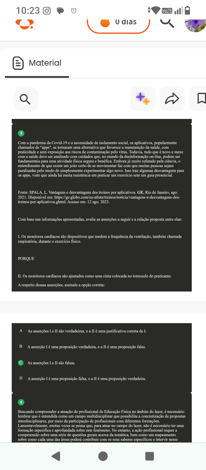 10:23 dias Material 5 Com a pandemia da Covid-19 e a necessidade de isolamento social, os aplicativos, popularmente chamados de "apps", se tornaram uma alternativa que favorece a manutenção da saúde, com praticidade e sem exposição aos riscos de contaminação pelo vírus. Todavia, tudo que é novo e mexe com a saúde deve ser analisado com cuidados que, no mundo da desinformação on-line, podem ser fundamentais para uma atividade fisica segura e benéfica. Embora já muito refutado pela entendimento de que existe um jeito certo de se movimentar faz com que muitas pessoas sejam paralisadas pelo medo de simplesmente experimentar algo novo. Isso traz algumas desvantagens para os apps, visto que ainda há muita resistência em praticar um exercício sem um guia presencial. Fonte: SPALA, L. Vantagens e desvantagens dos treinos por aplicativos. GE, Rio de Janeiro, ago. 2021. Disponível em: https://ge.globo.com/eu-atleta/treinos/noticia/vantagens-e-desvantagens-dos- treinos-por-aplicativos.ghtml. Acesso em: 12 ago. 2023. Com base nas informações apresentadas, avalie as asserções a seguir e a relação proposta entre elas: I. Os monitores cardíacos são dispositivos que medem a frequência da ventilação, também chamada respiratória, durante exercício PORQUE II. Os monitores cardíacos são ajustados como uma cinta colocada no tornozelo do praticante. A respeito dessas asserções, assinale a opção correta: A As asserções I e II são verdadeiras, e a II é uma justificativa correta da I. B A asserção I é uma proposição verdadeira, ea II é uma proposição falsa. As asserções I e II são falsas. D A asserção I é uma proposição falsa, e a II é uma proposição verdadeira. 6 Buscando compreender a atuação do profissional de Educação Física no âmbito do lazer, é necessário lembrar que é entendida como um campo multidisciplinar que possibilita a concretização de propostas interdisciplinares, por meio da participação de profissionais com diferentes formações. Lamentavelmente, muitas vezes se pensa que, para atuar no campo do lazer, não é necessário ter uma formação específica e aprofundada sobre este fenômeno. No entanto, a ação profissional requer a compreensão sobre uma série de questões gerais acerca da temática, bem como um mapeamento sobre como cada uma das poderá contribuir com os seus saberes específicos e intervir nesse