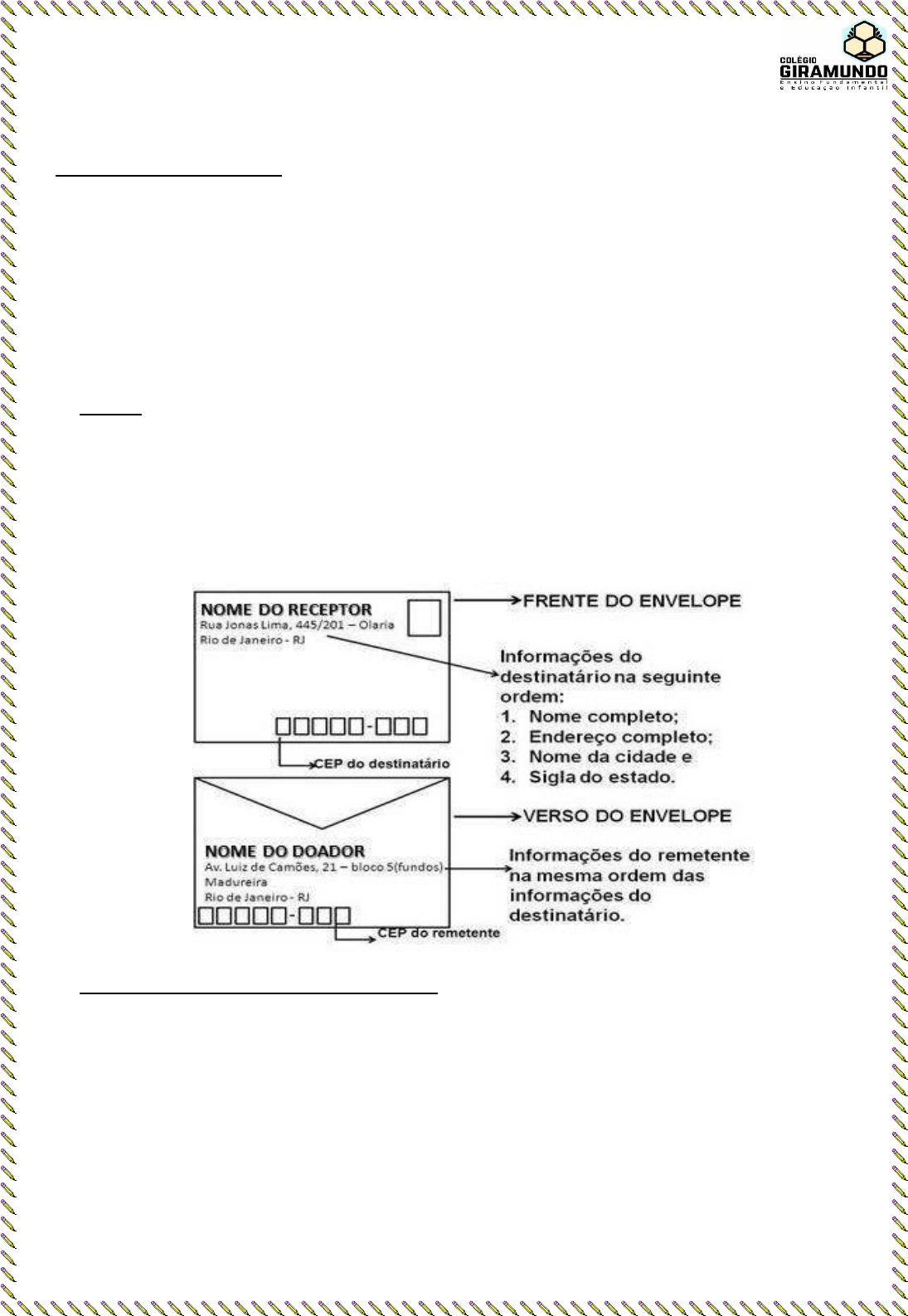 REVISÃO DE GEOGRAFIA APOSTILA 3º BIMESTRE – CAPÍTULO 7 PROF.ª ALLYNE SUELYN Capítulo 7 – mudanças nos meios de comunicação • Meios de comunicação – são instrumentos usados para transmitir informações entre as pessoas. Na Pré-história os seres humanos se comunicavam por meio de registros em desenhos nas paredes das cavernas, chamamos esses desenhos de PINTURA RUPRESTRE. Ao longo dos anos, esses meios foram transformados pelo desenvolvimento de novas tecnologias. Antigamente era comum o uso de cartas e jornais, hoje podemos acessar informações sobre os mais diversos temas por meio de telefones celulares e tablets, por exemplo. Recebemos um grande volume de informações em uma velocidade cada vez maior. • Cartas – São uma forma de comunicação muito antiga, não se sabe ao certo quando surgiu, mas no Egito Antigo (cerca de 2400 a.C.) já existiam mensageiros que levavam mensagens a pé ou montados a cavalos. Antigamente, as correspondências eram a base da comunicação entre as pessoas: cartas oficiais, cartas pessoais, cartas de amor etc. Porém elas podiam demorar muito tempo para chegar a seus destinatários, pois eram transportadas por via terrestre ou marítima, antes da invenção do avião. Veja a imagem a seguir como se preenche um envelope corretamente • Telegrafo e telefone – Linha do tempo Década de 1830 – Joseph Henry e Samuel Morse inventam o telégrafo, onde era possível enviar mensagens a longas distancias por meio de um código formado por linhas e traços (código Morse). 1876 – O cientista escocês Graham Bell desenvolveu o telefone a partir de experimentos com o telégrafo. O telefone transformava os sons em sinais elétricos, sua primeira transmissão foi em 10 de março de 1876. 1877 – O primeiro telefone foi instalado no Brasil, no palácio da Quinta da Boa Vista onde vivia o imperador Dom Pedro II. 1900 – Todos as ligações eram conectadas por telefonistas manualmente, os telefones não tinham os teclados numéricos, as pessoas giravam uma manivela para enviar sinais para as telefonistas conseguirem conectar um aparelho a outro. 1950 – Com o avanço da tecnologia surgiram as centrais telefônicas e assim, as pessoas podiam se comunicar diretamente por meio de seus aparelhos individuais, discando o número da pessoa que iria se comunicar. 2000 – Pouco a pouco os telefones fixos foram substituídos por telefones celulares, que podiam ser levados para qualquer lugar. 2010 – Os smartphones se popularizam. Um telefone com várias funções, como o acesso a internet. Assim, por meio de aplicativos, é possível realizar praticamente as mesmas atividades de um computador. • Rádio e televisão – O rádio serve para a transmissão de sons a longa distância, já a televisão transmite imagens e sons. Linha do tempo do rádio e da televisão 1895 – O rádio foi inventado na Itália por Guglielmo Marconi. 1922 – Foi realizado a primeira transmissão a rádio no Brasil. 1923 – A televisão é inventada nos Estados Unidos. Décadas de 1930 e 1940 – Ocorrem as primeiras transmissões televisivas na Alemanha e na França. Surge no Brasil as primeiras radionovelas e os programas de jornalismo e de auditório. 1950 – é fundada a primeira emissora brasileira de televisão, a TV Tupi. Nos Estados Unidos surgem as primeiras televisões coloridas. 1960 – Nasce a TV a cabo 1970 – Primeira transmissão em cores no Brasil. Século XX – Os televisores foram variando de tamanho e modelo. 2011 – Surgem as Smart TVs, televisores conectados à internet. • Meios de comunicação: usos e cuidados USOS CUIDADOS Com a chegada do século XXI, surgiram os notebooks. A principal vantagem desses dispositivos é que eles são portáteis e funcionam como um computador pessoal. Somente publique fotografias, vídeos e dados de outras pessoas com autorização delas. Não permita ser filmado e não mande fotos suas para pessoas desconhecidas. O s tablets surgiram em 2010 como computadores em formato de prancheta digital. Eles podem ser utilizados em qualquer ambiente, pois não dependem de cabos para a conexão. Em redes sociais ou jogos on-line, não faça comentários que possam ofender ou desrespeitar outras pessoas. Caso direcionem esse tipo de comentário a você, comunique o fato a seus responsáveis imediatamente. Hoje em dia, os dispositivos eletrônicos mais usados pela população em geral são os smartphones. Além de funcionarem como telefones celulares, eles podem ser usados em diversas atividades, como jogos, exercícios físicos, fotografia, entre outras funções. São como computadores disponíveis na palma da nossa mão. Conte imediatamente a seus responsáveis se alguma pessoa na internet tiver atitudes estranhas, ameaçar você ou pedir segredo de alguma coisa. Não acesse sites ou links desconhecidos. Não marque encontros com pessoas que você não conhece.