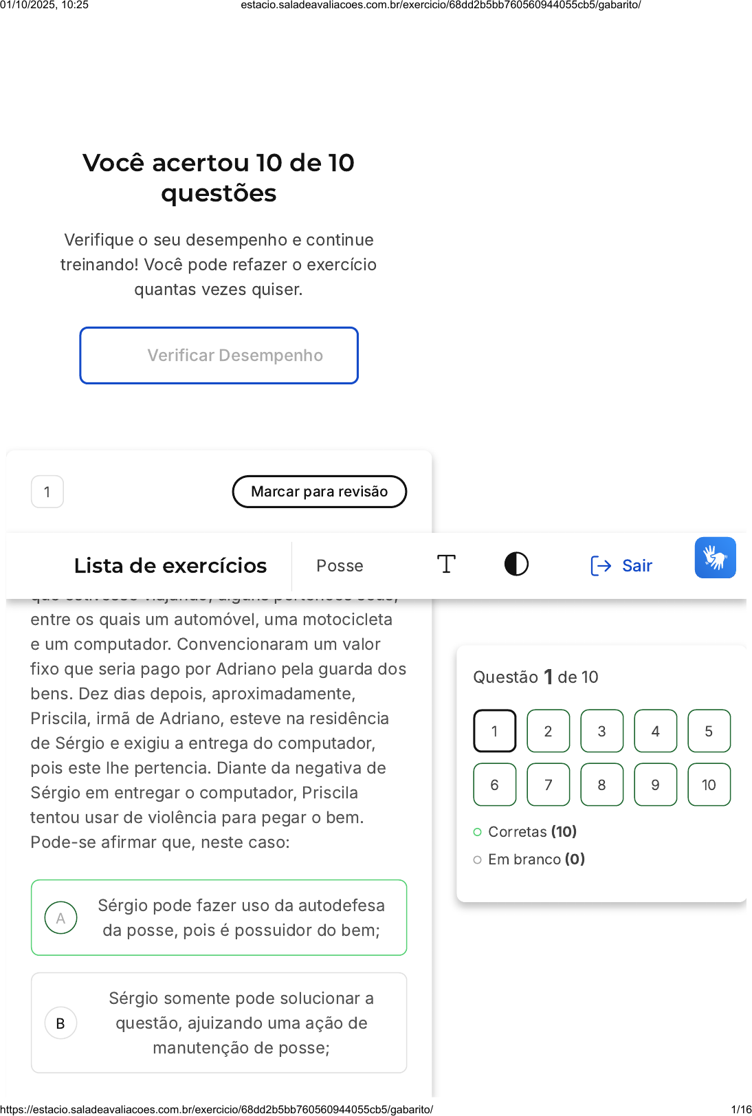 Você acertou 10 de 10 questões Verifique o seu desempenho e continue treinando! Você pode refazer o exercício quantas vezes quiser. Verificar Desempenho A B 1 Marcar para revisão Em virtude de viagem, Adriano solicitou a Sérgio que guardasse, durante o período em que estivesse viajando, alguns pertences seus, entre os quais um automóvel, uma motocicleta e um computador. Convencionaram um valor fixo que seria pago por Adriano pela guarda dos bens. Dez dias depois, aproximadamente, Priscila, irmã de Adriano, esteve na residência de Sérgio e exigiu a entrega do computador, pois este lhe pertencia. Diante da negativa de Sérgio em entregar o computador, Priscila tentou usar de violência para pegar o bem. Pode-se afirmar que, neste caso: Sérgio pode fazer uso da autodefesa da posse, pois é possuidor do bem; Sérgio somente pode solucionar a questão, ajuizando uma ação de manutenção de posse; Questão 1 de 10 Corretas (10) Em branco (0) 1 2 3 4 5 6 7 8 9 10 Lista de exercícios Posse Sair 01/10/2025, 10:25 estacio.saladeavaliacoes.com.br/exercicio/68dd2b5bb760560944055cb5/gabarito/ https://estacio.saladeavaliacoes.com.br/exercicio/68dd2b5bb760560944055cb5/gabarito/ 1/16 C D E Sérgio somente pode solucionar a questão, ajuizando uma ação de reintegração de posse; Sérgio somente pode solucionar a questão, ajuizando uma ação de interdito proibitório; Sérgio nada pode fazer, pois é mero detentor do bem. Resposta correta Parabéns, você selecionou a alternativa correta. Confira o gabarito comentado! Gabarito Comentado Sérgio, como possuidor direto do bem, devido ao contrato de depósito estabelecido com Adriano, tem o direito de manter a posse do bem. Isso significa que ele pode fazer uso da autodefesa da posse, que é o direito de proteger a posse de um bem contra uma tentativa de desapossamento. Portanto, no caso de Priscila tentar usar de violência para pegar o bem, Sérgio tem o direito de se defender e manter a posse do bem. Além disso, ele também pode recorrer ao judiciário para garantir a manutenção de sua posse, se necessário. 2 Marcar para revisão 01/10/2025, 10:25 estacio.saladeavaliacoes.com.br/exercicio/68dd2b5bb760560944055cb5/gabarito/ https://estacio.saladeavaliacoes.com.br/exercicio/68dd2b5bb760560944055cb5/gabarito/ 2/16 A B C D E Sobre a posse, indique a correta: Só implicará a possibilidade de usucapião se for de boa-fé e com justo título. É justa se o possuidor ignora o vício, ou o obstáculo que impede a aquisição da coisa. É adquirida desde o momento em que se obtenha seu reconhecimento por meio de documento escrito. A posse do imóvel não tem qualquer vinculação com a posse das coisas móveis que nele estiverem. É transmitida aos herdeiros ou legatários do possuidor com os mesmos caracteres. Resposta correta Parabéns, você selecionou a alternativa correta. Confira o gabarito comentado! Gabarito Comentado A alternativa correta é a letra E. A posse é transmitida aos herdeiros ou legatários do possuidor com os mesmos caracteres. As demais alternativas apresentam conceitos equivocados sobre a posse. Por exemplo, a usucapião pode ocorrer mesmo sem justo título e sem boa-fé (Alternativa A). A posse justa não está necessariamente ligada à ignorância de vícios ou obstáculos 01/10/2025, 10:25 estacio.saladeavaliacoes.com.br/exercicio/68dd2b5bb760560944055cb5/gabarito/ https://estacio.saladeavaliacoes.com.br/exercicio/68dd2b5bb760560944055cb5/gabarito/ 3/16 A B C D E (Alternativa B). A posse não precisa de um documento escrito para ser adquirida (Alternativa C). E a posse de um imóvel tem, sim, vinculação com a posse das coisas móveis que nele estiverem (Alternativa D). 3 Marcar para revisão O caseiro de uma chácara que, achando-se em relação de dependência para com o proprietário, conserva a posse em nome deste e em cumprimento de ordens e instruções suas, considera-se possuidor indireto. detentor. possuidor direto. possuidor de boa-fé. possuidor de má-fé. Resposta correta Parabéns, você selecionou a alternativa correta. Confira o gabarito comentado! Gabarito Comentado 01/10/2025, 10:25 estacio.saladeavaliacoes.com.br/exercicio/68dd2b5bb760560944055cb5/gabarito/ https://estacio.saladeavaliacoes.com.br/exercicio/68dd2b5bb760560944055cb5/gabarito/ 4/16 A B A posse é definida como o exercício, pleno ou não, de algum dos poderes inerentes à propriedade. Por exemplo, o locatário e o comodatário exercem posse sobre o bem, conforme o Art. 1.196 do Código Civil, que considera possuidor todo aquele que tem de fato o exercício, pleno ou não, de algum dos poderes inerentes à propriedade. Por outro lado, a detenção é a situação na qual alguém conserva a posse em nome de outro e em cumprimento às suas ordens e instruções. Neste caso, o caseiro de uma chácara, que mantém a posse em nome do proprietário e seguindo suas instruções, é considerado um detentor. A detenção não é posse, portanto, confere ao detentor direitos decorrentes desta. 4 Marcar para revisão A posse de um imóvel Transmite-se aos herdeiros ou legatários do possuidor com os mesmos caracteres, sendo que o sucessor universal continua de direito a posse do seu antecessor, e, ao sucessor singular, é facultado unir sua posse à do antecessor para os efeitos legais. Não se transmite de pleno direito aos herdeiros ou legatários do possuidor, mas eles podem, assim como a qualquer sucessor a título singular é facultado, unir sua posse à do antecessor, para efeitos legais. 01/10/2025, 10:25 estacio.saladeavaliacoes.com.br/exercicio/68dd2b5bb760560944055cb5/gabarito/ https://estacio.saladeavaliacoes.com.br/exercicio/68dd2b5bb760560944055cb5/gabarito/ 5/16 C D E Transmite-se de pleno direito aos sucessores a título universal e a título singular, não se permitindo a este recusar a união de sua posse à do antecessor, para efeitos legais. Não se transmite aos herdeiros ou legatários do possuidor com os mesmos caracter