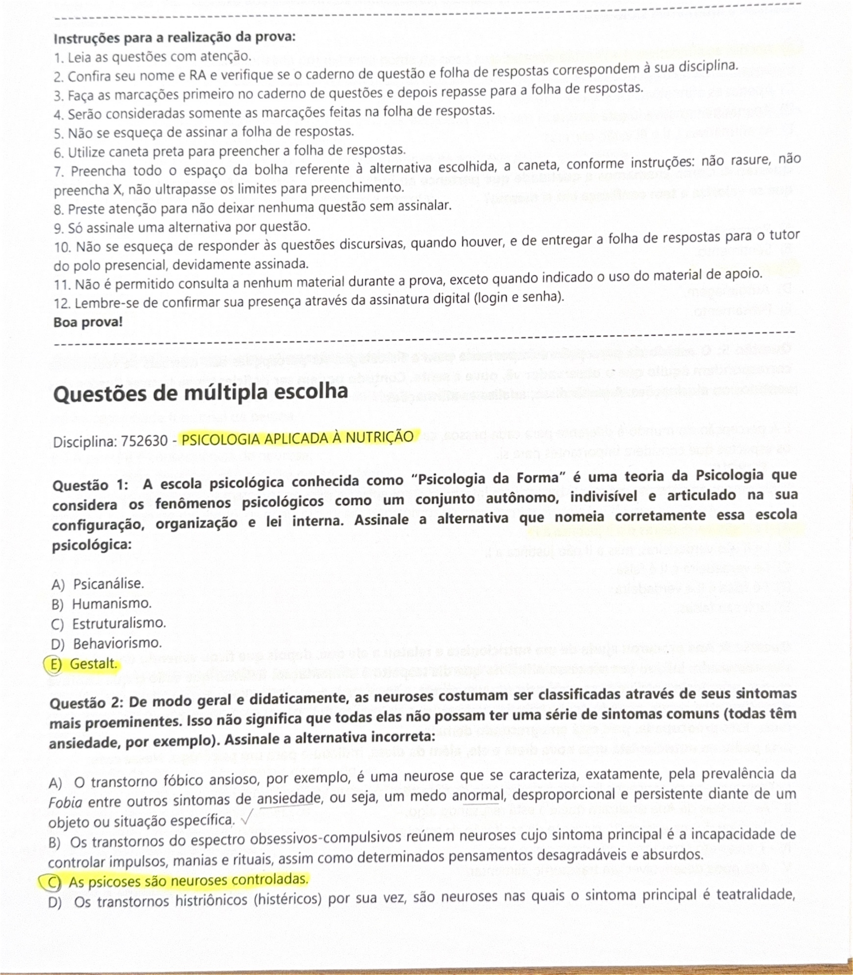 Instruções para a realização da prova: 1. Leia as questões com atenção. 2. Confira seu nome e RA e verifique se caderno de questão e folha de respostas correspondem à sua disciplina. 3. Faça as marcações primeiro no caderno de questões e depois repasse para a folha de respostas. 4. Serão consideradas somente as marcações feitas na folha de respostas. 5. Não se esqueça de assinar a folha de respostas. 6. Utilize caneta preta para preencher a folha de respostas. 7. Preencha todo espaço da bolha referente à alternativa escolhida, a caneta, conforme instruções: não rasure, não preencha X, não ultrapasse os limites para preenchimento. 8. Preste atenção para não deixar nenhuma questão sem assinalar. 9. Só assinale uma alternativa por questão. 10. Não se esqueça de responder às questões discursivas, quando houver, e de entregar a folha de respostas para tutor do polo presencial, devidamente assinada. 11. Não é permitido consulta a nenhum material durante a prova, exceto quando indicado uso do material de apoio. 12. Lembre-se de confirmar sua presença através da assinatura digital (login e senha). Boa prova! Questões de múltipla escolha Disciplina: 752630 PSICOLOGIA APLICADA À NUTRIÇÃO Questão 1: A escola psicológica conhecida como "Psicologia da Forma" é uma teoria da Psicologia que considera os fenômenos psicológicos como um conjunto autônomo, indivisível e articulado na sua configuração, organização e lei interna. Assinale a alternativa que nomeia corretamente essa escola psicológica: A) Psicanálise. B) Humanismo. C) Estruturalismo. D) Behaviorismo. E Gestalt. Questão 2: De modo geral e didaticamente, as neuroses costumam ser classificadas através de seus sintomas mais proeminentes. Isso não significa que todas elas não possam ter uma série de sintomas comuns (todas têm ansiedade, por exemplo). Assinale a alternativa incorreta: A) O transtorno fóbico ansioso, por exemplo, é uma neurose que se caracteriza, exatamente, pela prevalência da Fobia entre outros sintomas de ansiedade, ou seja, um medo anormal, desproporcional e persistente diante de um objeto ou situação específica. B) Os transtornos do espectro obsessivos-compulsivos reúnem neuroses cujo sintoma principal é a incapacidade de controlar impulsos, manias e rituais, assim como determinados pensamentos desagradáveis e absurdos. As psicoses são neuroses controladas. D) Os transtornos histriônicos (histéricos) por sua vez, são neuroses nas quais sintoma principal é teatralidade,"sugestionabilidade", necessidade de atenção constante e manipulação emocional das pessoas ao seu redor. E) transtorno ansioso é outro tipo de neurose. Questão 3: A motivação é constituída de várias necessidades, sentimentos e desejos que levam a pessoa a determinado comportamento. Teorias importantes surgiram para explicar como ela se desenvolve e se estrutura. Levando-se em consideração a Teoria das Necessidades Hierárquicas de Maslow, analise as afirmações: I. A necessidade de segurança diz respeito à obtenção de comida e água, por exemplo. II. A necessidade denominada realizações pessoais é a última da hierarquia. III. Maslow confere à necessidade de estima a questão do reconhecimento, do status e da autoestima. Assinale a alternativa CORRETA: A Apenas as afirmativas e III estão corretas. B) Apenas a afirmativa está correta. C) Apenas as afirmativas e estão corretas. D) Apenas a afirmativa III está correta. E) As afirmativas I, e III estão corretas. Questão 4: Como chamamos a qualidade que pertence ao indivíduo que está satisfeito com a sua identidade, que se valoriza e tem confiança em si mesmo? A) Percepção. B) Sentimento. Autoestima. D) Autoimagem. E) Pensamento. Questão 5: estudo da percepção é importante para a Psicologia. As percepções são normais se realmente correspondem àquilo que observador vê, ouve e sente. Contudo podem ser deficientes se houver ilusões dos sentidos ou alucinações. A partir disso, analise as afirmações: I. A percepção do mundo é diferente para cada pessoa, cada um percebe um objeto ou uma situação de acordo com os aspectos que considera importantes para si. PORQUE II. O comportamento das pessoas é baseado na interpretação que fazem da realidade, e não da realidade em si. A I e II são verdadeiras e a justifica a B) I e são verdadeiras, mas a não justifica a I. C) é verdadeira e é falsa. D) lé falsa e II é verdadeira. E) e são falsas. Questão 6: Ana procurou ajuda de um nutricionista e relatou a ele que, depois que ficou sabendo da traição de seu namorado, iniciou um processo difícil no que diz respeito à alimentação. Relatou que tudo o que adorava comer, principalmente na companhia de seu namorado, não entrava mais. Disse ter náuseas ao sentir o cheiro dos alimentos e que quando tenta ingerir qualquer um deles, vomita. Disse que não consegue engolir mais nada. Está preocupada, pois está emagrecendo demais. Ana pediu ao nutricionista uma nova dieta e ele, além da dieta, indicou-a para um psicólogo. Nesse caso: Observam-se os conceitos ligados à simbologia da digestão: engolir, náuseas, vômitos, estômago. II As náuseas de Ana sinalizam que ela está recusando algo. III Vomitar é uma expressão evidente de aceitação da traição. IV É incorreto fazer uma nova dieta nesse caso. V Ana pode desenvolver um transtorno alimentar.Assinale a alternativa que traga apenas as afirmativas corretas: A) e III. B) C) III, IV D) III IV. Questão 7: Na atualidade, as pessoas vivem sob o ideal da magreza e da boa forma física, cujo padrão se impõe especialmente às mulheres, para as quais a aparência física representa uma importante medida de valor pessoal. o impacto desse padrão no comportamento revela-se no desejo generalizado de um corpo mais magro. No que diz respeito aos transtornos alimentares, assinale (V) para as afirmativas verdadeiras e (F) para as falsas. () A anorexia n