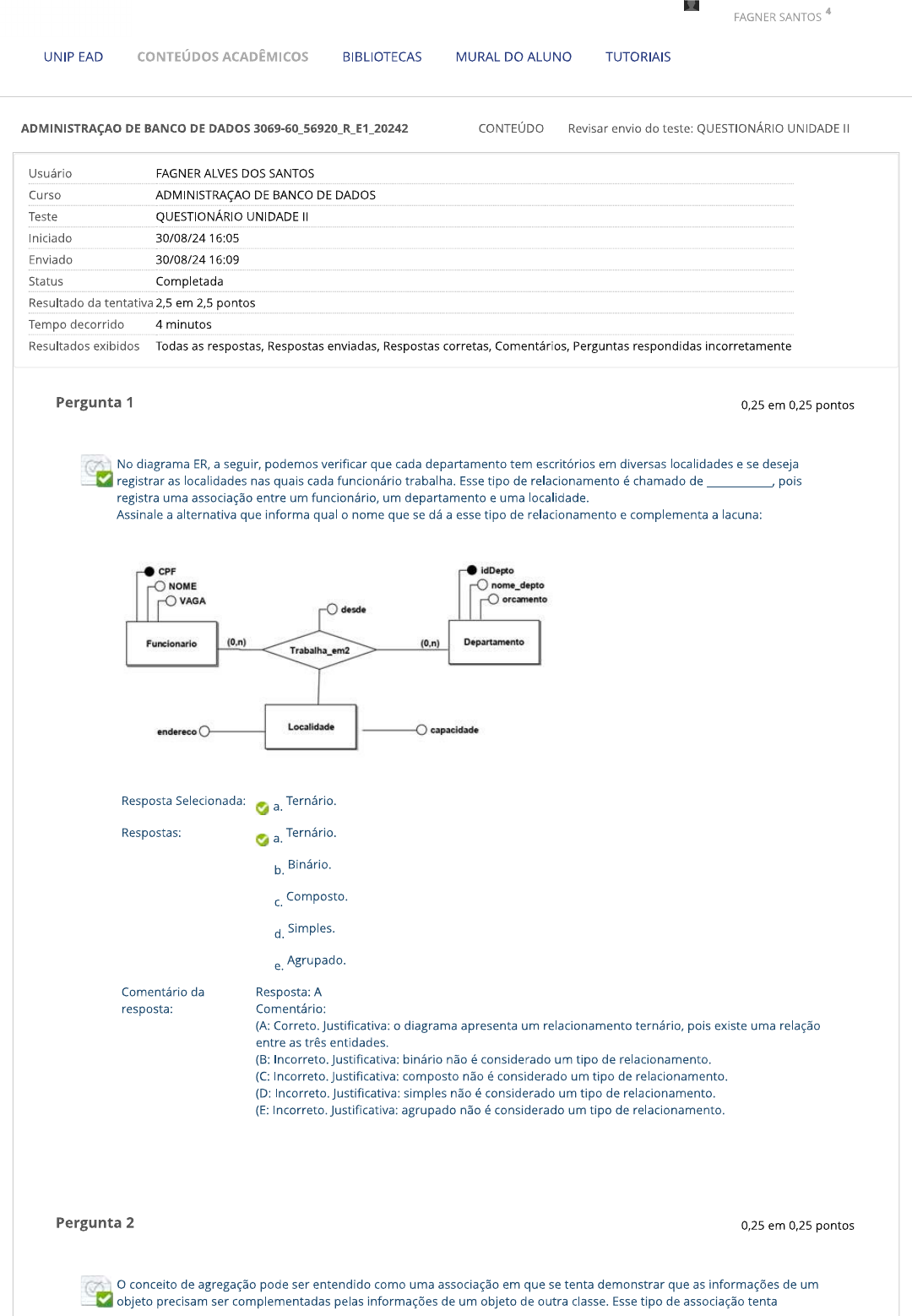 4 FAGNER SANTOS UNIP EAD CONTEÚDOS ACADÊMICOS BIBLIOTECAS MURAL DO ALUNO TUTORIAIS ADMINISTRAÇÃO DE BANCO DE DADOS 3069-60_56920_R_E1_20242 CONTEÚDO Revisar envio do teste: QUESTIONÁRIO UNIDADE Usuário FAGNER ALVES DOS SANTOS Curso ADMINISTRAÇÃO DE BANCO DE DADOS Teste QUESTIONÁRIO UNIDADE Iniciado 30/08/24 16:05 Enviado 30/08/24 16:09 Status Completada Resultado da tentativa 2,5 em 2,5 pontos Tempo decorrido 4 minutos Resultados exibidos Todas as respostas, Respostas enviadas, Respostas corretas, Comentários, Perguntas respondidas incorretamente Pergunta 1 0,25 em 0,25 pontos No diagrama ER, a seguir, podemos verificar que cada departamento tem escritórios em diversas localidades e se deseja registrar as localidades nas quais cada funcionário trabalha. Esse tipo de relacionamento é chamado de pois registra uma associação entre um funcionário, um departamento e uma localidade. Assinale a alternativa que informa qual o nome que se dá a esse tipo de relacionamento e complementa a lacuna: CPF idDepto NOME nome_depto VAGA orcamento desde Funcionario (0,n) Departamento Trabalha em2 Localidade capacidade Resposta Selecionada: Ternário. a. Respostas: Ternário. a. b. Composto. d. Simples. e. Agrupado. Comentário da Resposta: A resposta: Comentário: (A: Correto. Justificativa: o diagrama apresenta um relacionamento ternário, pois existe uma relação entre as três entidades. (B: Incorreto. Justificativa: binário não é considerado um tipo de relacionamento. (C: Incorreto. Justificativa: composto não é considerado um tipo de relacionamento. (D: Incorreto. Justificativa: simples não é considerado um tipo de relacionamento. (E: Incorreto. Justificativa: agrupado não é considerado um tipo de relacionamento. Pergunta 2 0,25 em 0,25 pontos conceito de agregação pode ser entendido como uma associação em que se tenta demonstrar que as informações de um objeto precisam ser complementadas pelas informações de um objeto de outra classe. Esse tipo de associação tentademonstrar uma relação todo ou parte entre os objetos associados. Nesse tipo de relacionamento é correto afirmar que: I. Existe uma relação de todo ou parte entre os objetos; II. Demonstrar sempre quem é a entidade principal; III. Sempre deve haver mais de uma entidade para que a agregação possa acontecer; IV. Existe uma entidade na agregação, que não precisa de atributos para que elas possam se relacionar. Assinale a alternativa correta: Resposta Selecionada: I, e III. Respostas: Todas as alternativas estão corretas. a. b. I, e IV. C. I, III. d. II, III e IV. e. le IV. Comentário da Resposta: resposta: Comentário: Item I. Correto, pois um dado é considerado todo ou parte de um objeto. Item II. Correto, pois a agregação demonstra a relação da entidade principal. Item III. Correto, pois a agregação pressupõe que deve haver mais de uma entidade para que ela ocorra. Item IV. Incorreto, pois todas as entidades devem possuir atributos. Pergunta 3 0,25 em 0,25 pontos Um relacionamento deve ser identificado, unicamente, pelas entidades participantes, sem a referência aos atributos descritivos, deve ser identificado, apenas, como a relação entre as entidades. Assim, para um determinado par funcionário- departamento, baseado no diagrama a seguir, assinale que pode ser considerado um relacionamento para essa relação: CPF desde idDepto NOME nome_depto VAGA orcamento Funcionario (0,n) Departamento Trabalha_em Resposta Selecionada: Trabalha_em. Respostas: a. Funcionario. b. Trabalha_em. d. Funcionario_Trabalha_em. Departamento_Trabalha_em. e. Comentário da Resposta: resposta: Comentário: (A: Incorreto. Justificativa: Funcionario não pode ser considerando um relacionamento, pois é uma entidade. (B: Incorreto. Justificativa: não pode ser considerando um relacionamento, pois não aparece no diagrama. (C: Correto. Justificativa: Trabalha_em é considerado um relacionamento entre as entidades Funcionário e Departamento; além disso, é representado com uso de um losango. (D: Incorreto. Justificativa: não pode ser considerando um relacionamento, pois não aparece no diagrama. (E: Incorreto. Justificativa: não pode ser considerando um relacionamento, pois não aparece no diagrama.Pergunta 4 0,25 em 0,25 pontos conceito de chave é fundamental no modelo para garantir a identificação de tuplas e estabelecer relacionamentos entre as relações. Analise as afirmações a seguir e assinale a alternativa correta: I. Atributo ou grupo de atributos que permite a identificação única de uma tupla em uma relação; II. Uma tupla poderá repetir nas demais tuplas da mesma relação; III. Uma é escolhida entre várias chaves candidatas, que não precisam estar presentes na relação; IV. Atributo ou grupo de atributos de uma relação R1 que estabelece um relacionamento de equivalência, por valor, com uma (primary key) de uma relação R2. Resposta Selecionada: e. IV. Respostas: Todas as alternativas estão corretas. a. b. I, e IV. I, e III. d. II, III e IV. e. IV. Comentário da Resposta: E resposta: Comentário: Item I. Correto, pois no conceito de chave, uma tupla poderá repetir nas demais tuplas da mesma relação. Item II. Incorreto, pois no conceito de chave, uma tupla não poderá repetir nas demais tuplas da mesma relação. Item III. Incorreto, pois no conceito de chave, uma é escolhida entre várias chaves candidatas, que precisam estar presentes na relação. Item IV. Correto, pois o atributo ou grupo de atributos de uma relação R1 é que estabelece um relacionamento de equivalência, por valor, com uma (primary key) de uma relação R2. Pergunta 5 0,25 em 0,25 pontos Os aspectos de integridade do modelo relacional estão associados aos conceitos de chave primária e chave estrangeira. Garantir a integridade de um esquema relacional significa assegurar acesso individualizado a todas as tuplas de uma relação, assim como os relacionamentos válidos e condizentes com a realidade. m