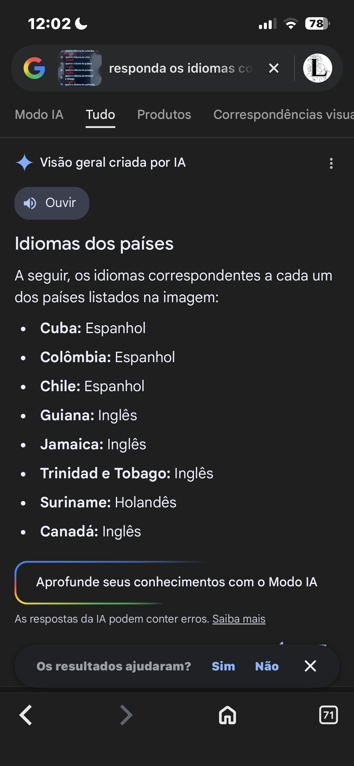 12:02 78 G responda os idiomas X Modo IA Tudo Produtos Correspondências visua Visão geral criada por IA ... Ouvir Idiomas dos países A seguir, os idiomas correspondentes a cada um dos países listados na imagem: Cuba: Espanhol Colômbia: Espanhol Chile: Espanhol Guiana: Inglês Jamaica: Inglês Trinidad e Tobago: Inglês Suriname: Holandês Canadá: Inglês Aprofunde seus conhecimentos com Modo IA As respostas da IA podem conter erros. Saiba mais Os resultados ajudaram? Sim Não X 71